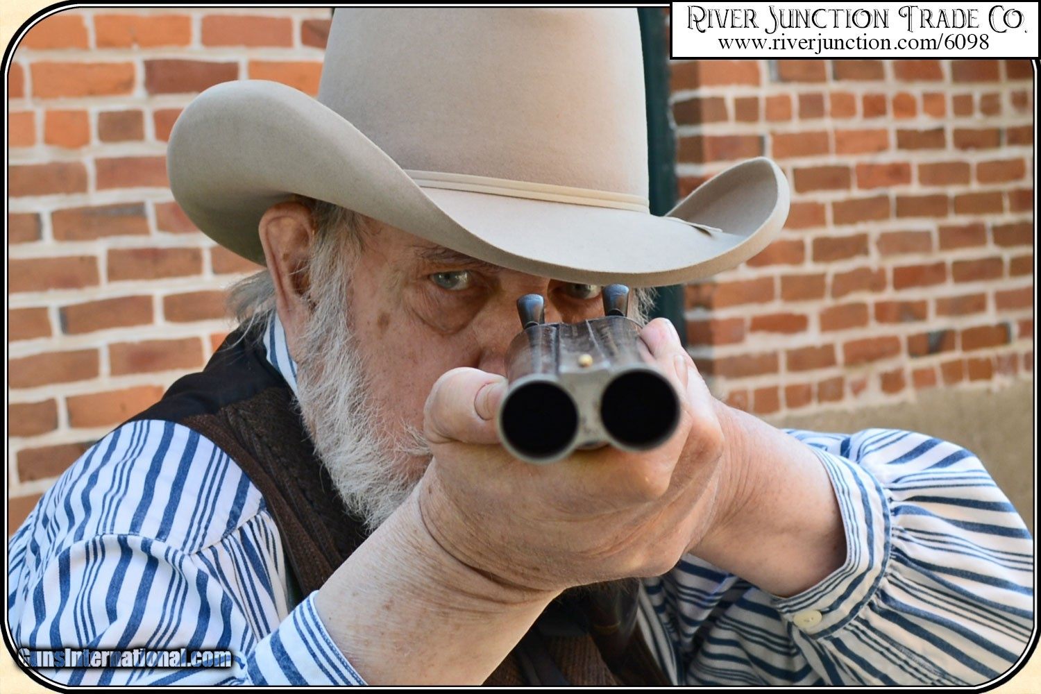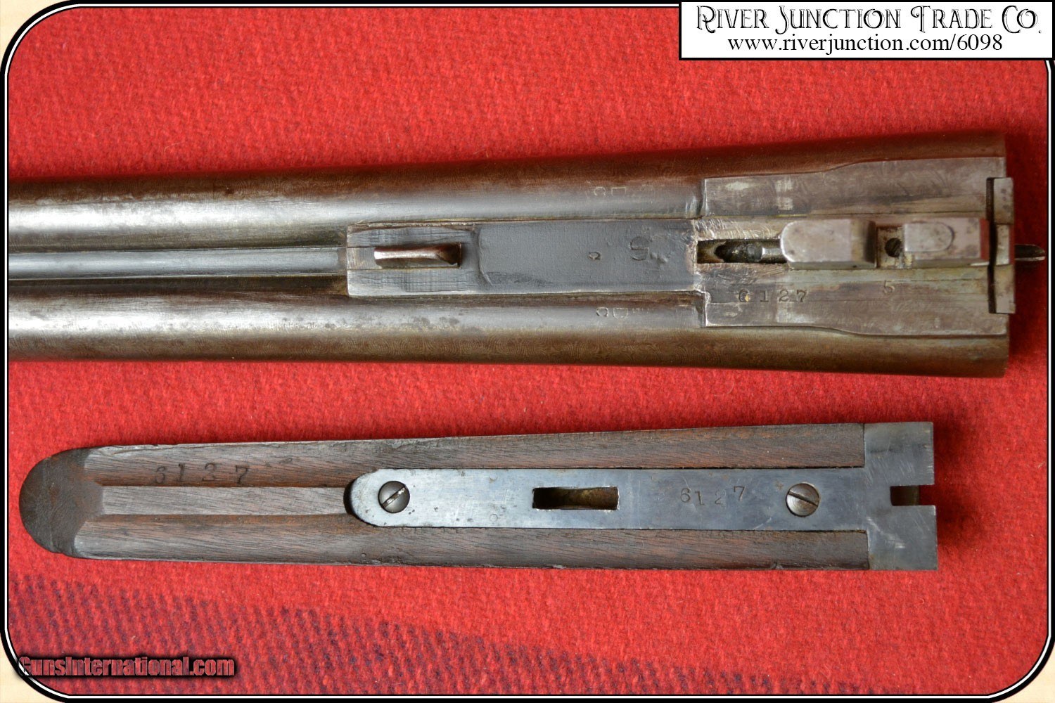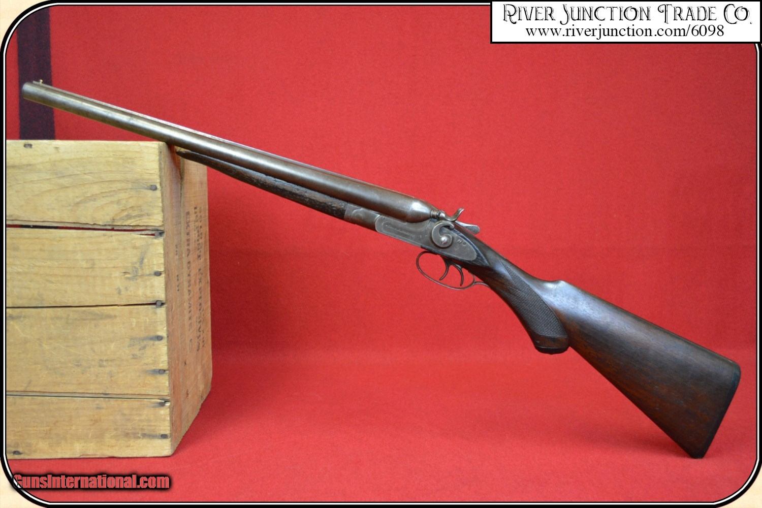 Description: Coach Gun / Saw off shot gun / Street Howitzer / Scatter Gun. The Coach Gun received its many moniker on the stagecoaches and streets of the Wild West. Stagecoach companies quickly implemented the use of guards to ride along side the driver carrying a weapon that allowed for some leeway in accuracy as they bounced along the bumpy trails. Cut-down versions of the Stagecoach Shotgun were also popular among Marshals and Sheriffs for their mobility and lenient accuracy at close quarters. Thumb the locking lever and you can break open the gun to reveal the lead-spitting barrels of this close-quarters defense weapon. These barrels have a light black powder frost, but still better than most of the era, a rarity in these old double hammer guns. Close and lock the barrels and cock both hammers. Finger the double triggers one at a time and the hammers will fall. On the plains of the late 19th century there was nothing else like the sound of a shotgun hammer. The feel and action of this legendary Old West tool will transport you back to the Dakota Territory, when your trusty shotgun was your last and best line of defense. Features Overall Length: 35", barrels 18 1/4 inches. Lock up is tight and secure. On the top rib it is marked DAMASOUS STEEL MFGD BY THE MERIDEN FIRE ARMS CO. MERIDEN, CT. U.S.A. Gutta-percha (hard rubber) butt plate on a stock with no cracks or chips. Marked "THE A.J.AUBREY" on both the left & right locks and both locks show traces of case color. Overall brown patina. This Coach Gun is in remarkably good shape. One of the better ones we have seen. Payment: Item, can be ordered with a credit card or paypal on our sight . Just Google (riverjunction) and type in the River Junction Trade Co. item number (6098) in the search box. Before you checkout you will see shipping cost and total. OR If you prefer: Pay by cash, postal money order, cashiers check, personal & business checks. We wait for checks to clear. Have questions? Call me 563-880-4588. Jim SOLD |
