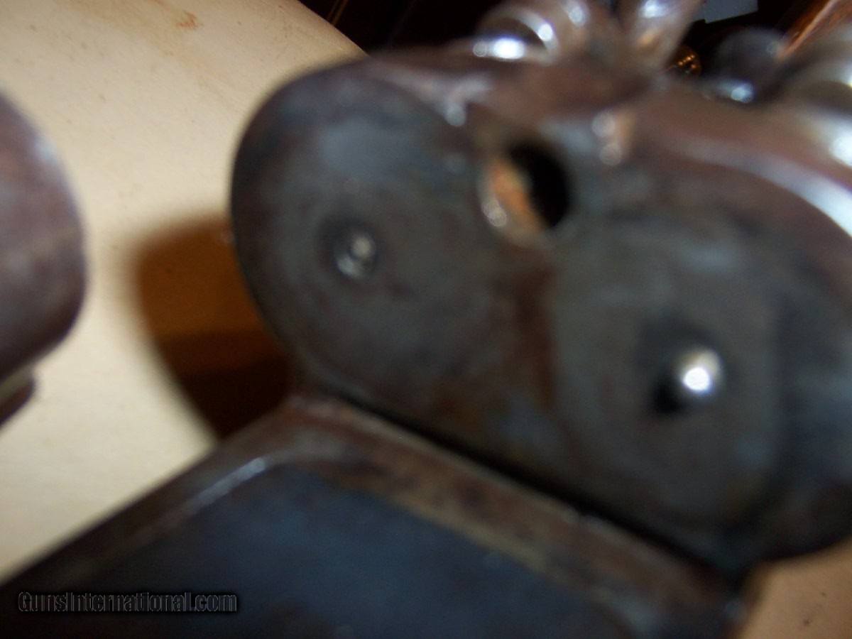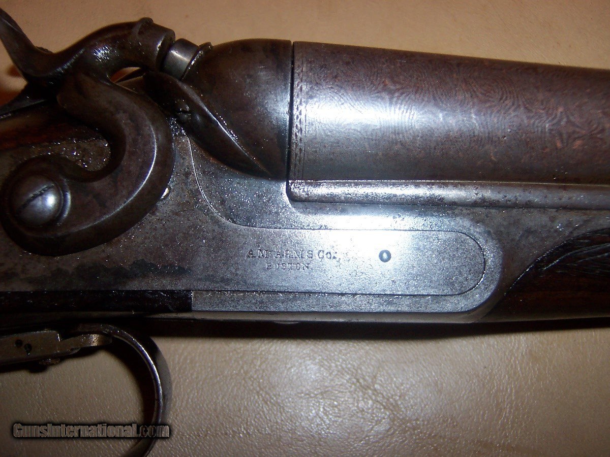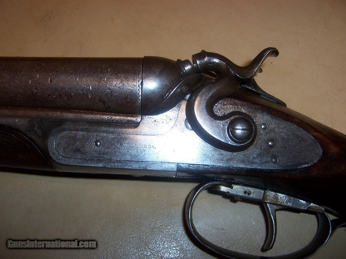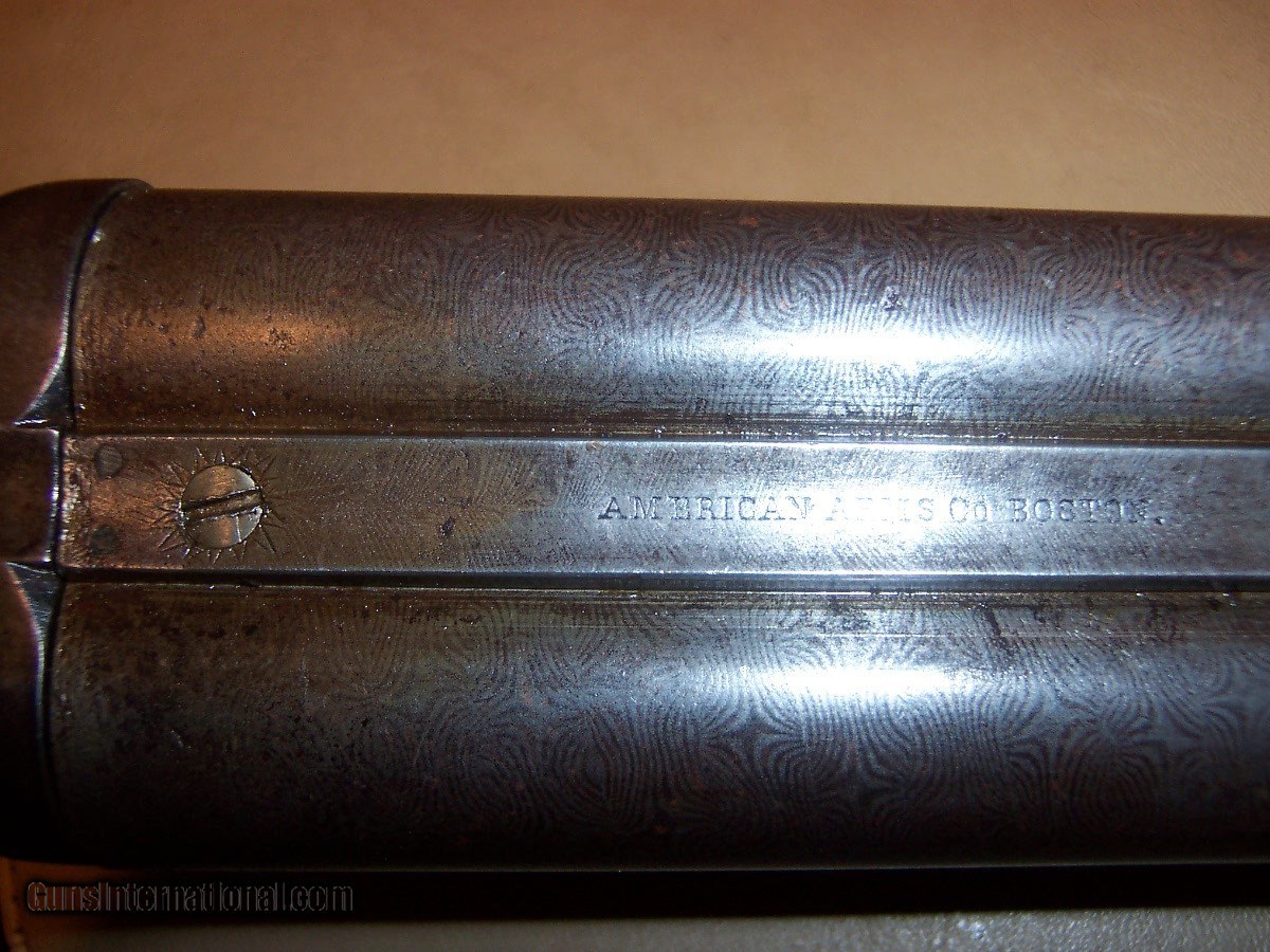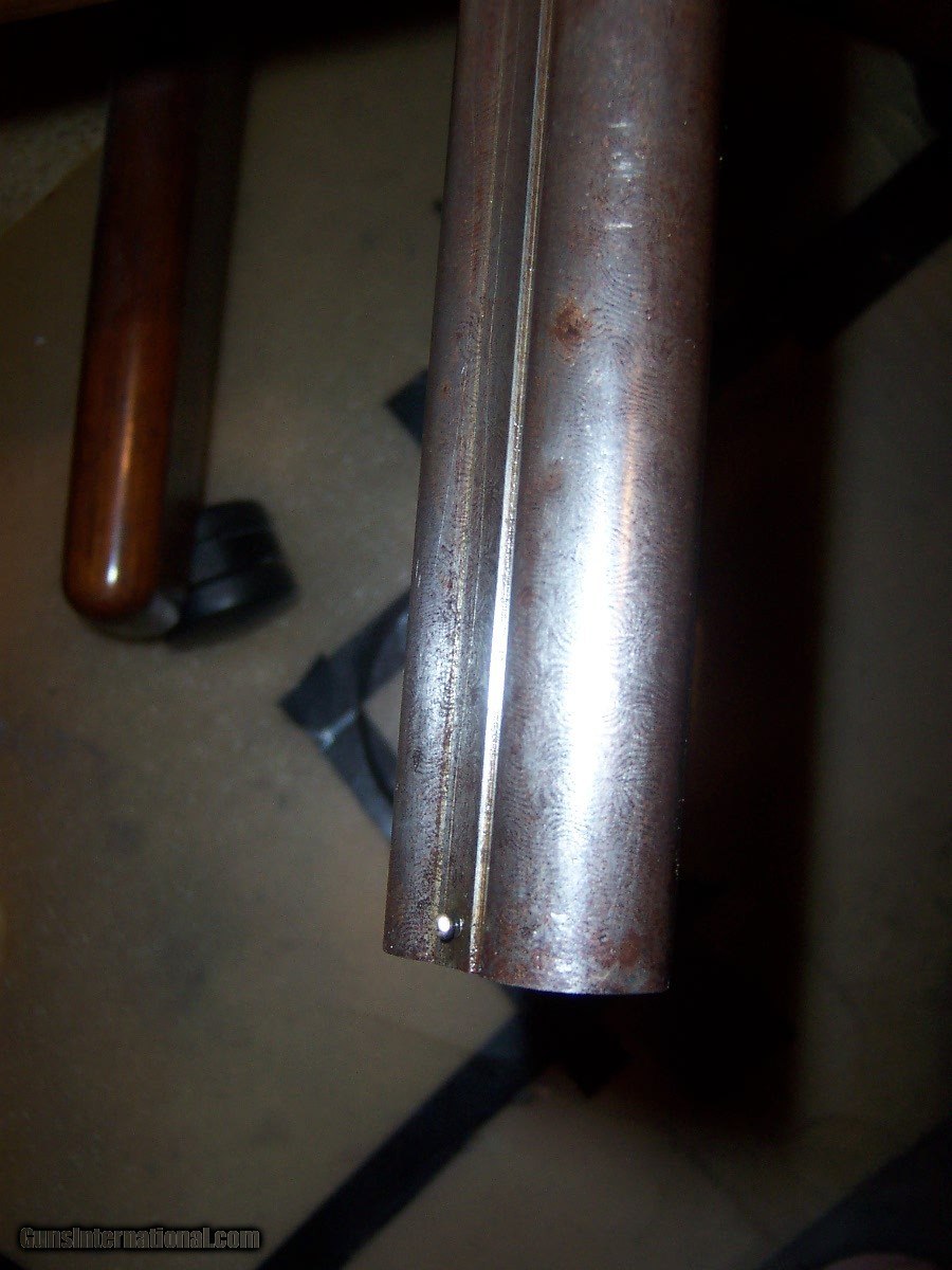 Description: 25 3/4 in 12 ga barrels probably shortened nice damascus pattern moderate pittying in bores locks work fine with a single selective;;; trigger move left and right'''''''' enclose is a picture of a broken spring and barrel locking pin the spring holds pin in position to lock and unlock barrels by pushing tab on top it the pin is held in gun by heavy grease AT THIS TIME ;; gun locks up tight but needs only new spring pictured installed you fix or show gun as is serial #2035 $49 sh ins marked on barrel american arms co boston antique'' co formed in 1853 by g h fox gun made in 1870s?????? looks like old original recoil pad '''''' picture #3 shows hole where pin goes which is now installed with heavy grease to keep pin from falling out dont point barrel down pin might fall out very strange selective trigger must be a new patent type used on this gun '''''''''' this is a complicated fix so no returns as gun works fine in dry fire and needs only the spring fixed nice stock with only normal wear all this is very complicated i am sure but gun works fine as is USE MAGNET TO PULL PIN OUT IF YOU NEED TO SEE IT BUT A WASTE OF TIME AND IF YOU CLOSE BARRELS WITH PIN OUT YOU WILL NEED TO REMOVE STOCK TO GET BARREL TO MOV E AND YOU SHOULD REPAIR SPRING IF YOU HAVE GONE THIS FAR SOLD Antique: Yes |