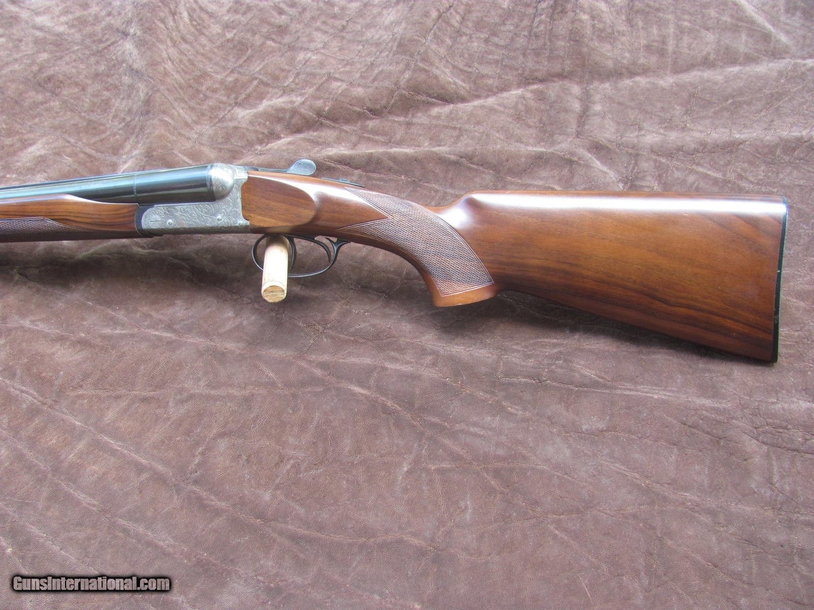 Description: Churchill 12 gauge 3 inch side x side shotgun. Made in Italy. 27 3/4 inch barrels choked on the right .702 and on the left .682. Extractors. Double triggers. 14 3/4 inch LOP. Weight 6.88 lbs. 3 inch magnum chambers. Minor handling marks on wood. Bluing excellent. Receiver is etched engraved from the looks of it. Tight lockup and toplever right of center. SOLD |