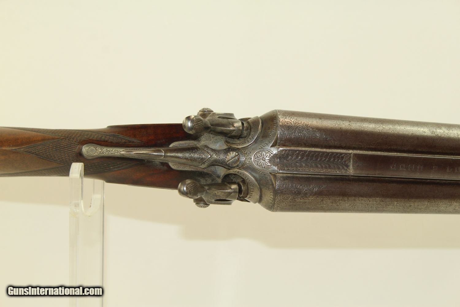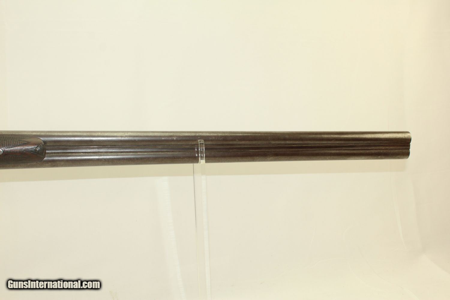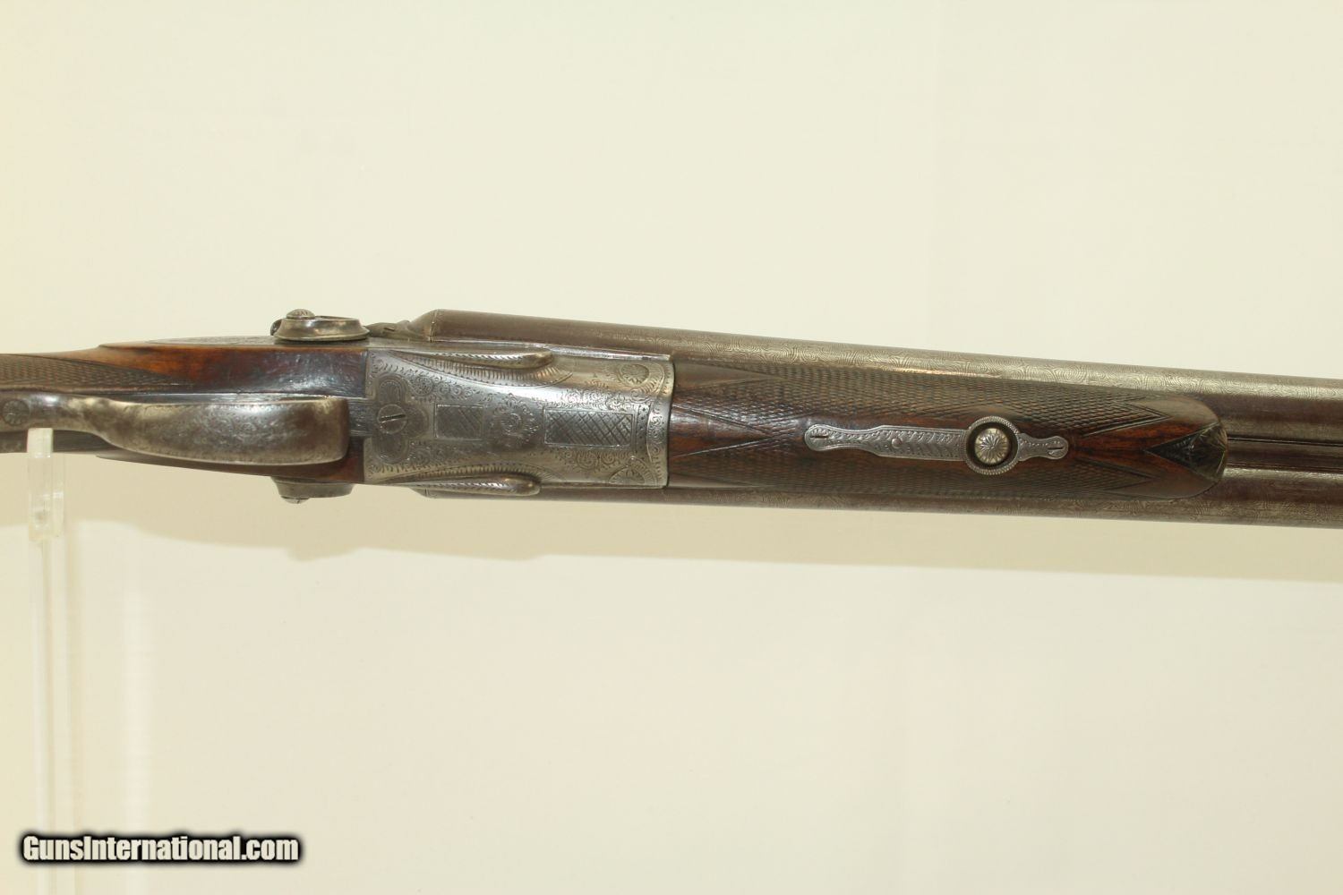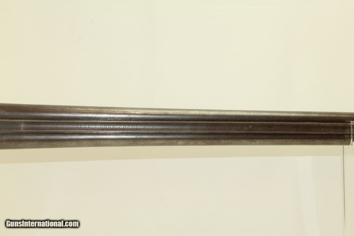 Description: Engraved, FINE DAMASCUS J.P. LOVELL & SONS SxS HAMMER Shotgun 1900 C&R Stately Engraved 12 Gauge Double Barrel Shotgun Here we present an antique John P. Lovell & Sons Double Barrel Side x Side Hammer Shotgun in 12 gauge, manufactured circa the 1870s in Birmingham, England. John P. Lovell Co. started his business in pre-Civil War days, circa 1840, primarily making shotguns and other sporting arms. By the time the Civil War ended, he became a retailer of sporting goods at large. By the 1890s, they had two stores in in Boston: one at 147 Washington Street and the other at 131 Broad Street. In 1900 the J.P. Lovell Company main store was sold to the Iver Johnson family and was renamed Iver Johnson Sporting Goods of Boston and continued operations into the 1950s. This double barrel shotgun is a thing of beauty. It bears the Lovell name but was made across the pond in Birmingham, England. And a good job the maker did, too. This double features Fine Damascus twist barrels in 12 gauge. Intricate engraving is found throughout on the frame, trigger guard, locks, etc. Horn butt plate and forearm tip. The forearm is removed with the push of an engraved button rather than the more common lever of the day. A true Old World, hand-crafted beauty! The overall condition is near fine. Good Damascene pattern on the barrels. Good case colors on the frame and lock plates. Very nice, clear engravings. The bores are mostly smooth and bright with light/minor surface pitting. Matching numbers. Strong actions. The only thing that can be improved upon is that the barrel latch spring needs a replacement. This is a looker of a shotgun! Own the original! This is a legitimate antique and not a reproduction. Barrels: 29-1/2 inches. Caliber: 12 Gauge Chambers: 2-3/4 inches Chokes: Modified/Modified Length of Pull: 14 inches Overall condition as seen in photos. Very Fast. Very Safe. FREE SHIPPING WORLDWIDE. Delivered directly to your door by express mail! Guaranteed AUTHENTIC & Includes CERTIFICATE OF AUTHENTICITY. ancestryguns $1650 #190995 SOLD Curio/Relic: Yes |