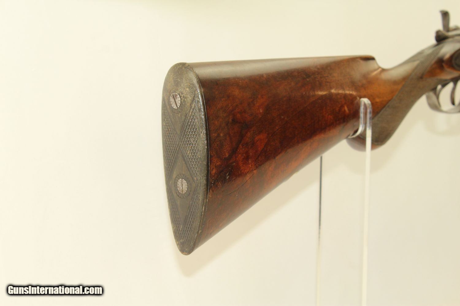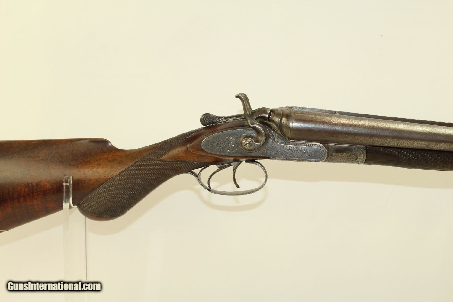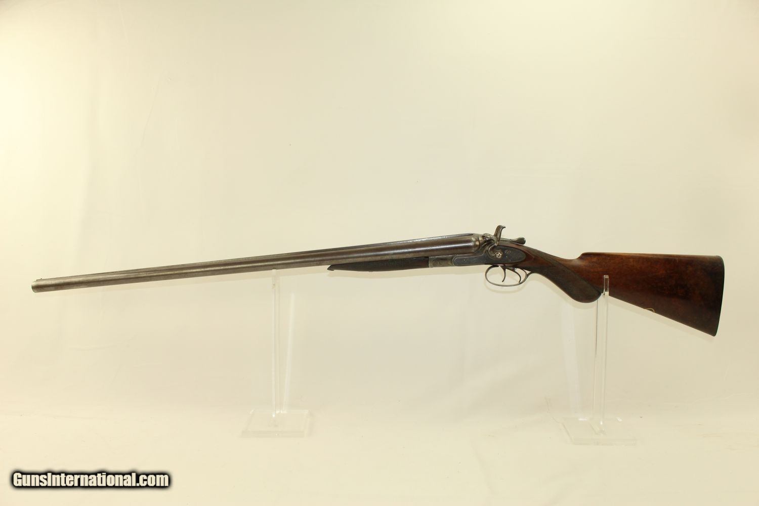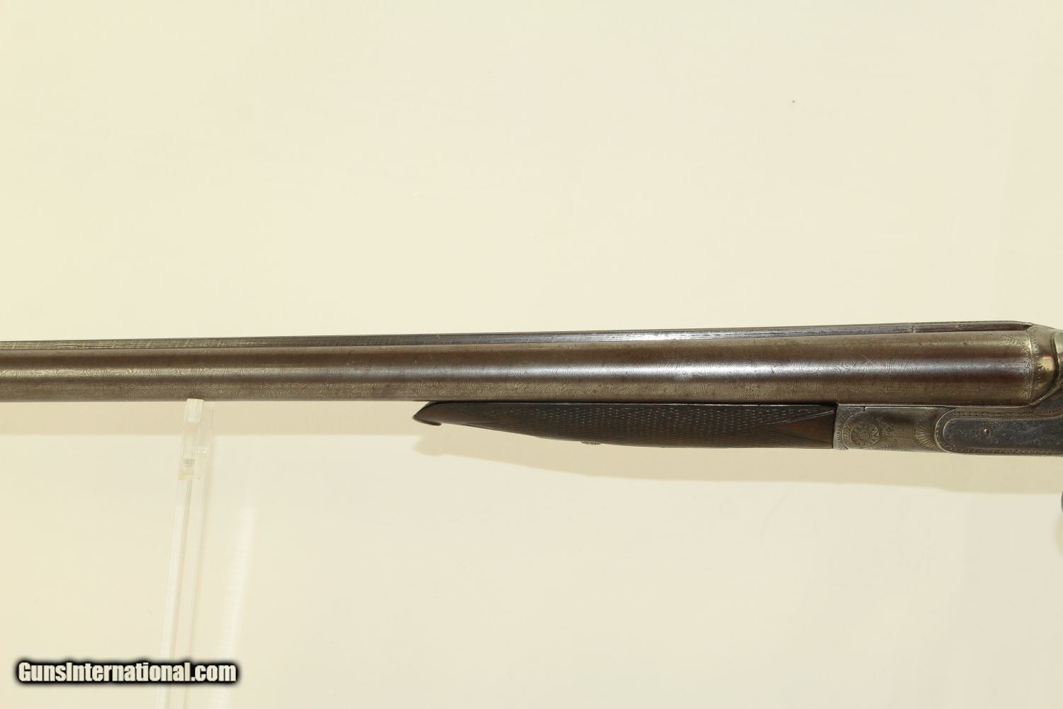 Description: Engraved, FINE DAMASCUS J.P. LOVELL & SONS SxS HAMMER Shotgun 1900 C&R Stately Engraved 12 Gauge Double Barrel Shotgun Here we present an antique John P. Lovell & Sons Double Barrel Side x Side Hammer Shotgun in 12 gauge, manufactured circa the 1870s in Birmingham, England. John P. Lovell Co. started his business in pre-Civil War days, circa 1840, primarily making shotguns and other sporting arms. By the time the Civil War ended, he became a retailer of sporting goods at large. By the 1890s, they had two stores in in Boston: one at 147 Washington Street and the other at 131 Broad Street. In 1900 the J.P. Lovell Company main store was sold to the Iver Johnson family and was renamed Iver Johnson Sporting Goods of Boston and continued operations into the 1950s. This double barrel shotgun is a thing of beauty. It bears the Lovell name but was made across the pond in Birmingham, England. And a good job the maker did, too. This double features Fine Damascus twist barrels in 12 gauge. Intricate engraving is found throughout on the frame, trigger guard, locks, etc. Horn butt plate and forearm tip. The forearm is removed with the push of an engraved button rather than the more common lever of the day. A true Old World, hand-crafted beauty! The overall condition is near fine. Good Damascene pattern on the barrels. Good case colors on the frame and lock plates. Very nice, clear engravings. The bores are mostly smooth and bright with light/minor surface pitting. Matching numbers. Strong actions. The only thing that can be improved upon is that the barrel latch spring needs a replacement. This is a looker of a shotgun! Own the original! This is a legitimate antique and not a reproduction. Barrels: 29-1/2 inches. Caliber: 12 Gauge Chambers: 2-3/4 inches Chokes: Modified/Modified Length of Pull: 14 inches Overall condition as seen in photos. Very Fast. Very Safe. FREE SHIPPING WORLDWIDE. Delivered directly to your door by express mail! Guaranteed AUTHENTIC & Includes CERTIFICATE OF AUTHENTICITY. ancestryguns $1650 #190995 SOLD Curio/Relic: Yes |