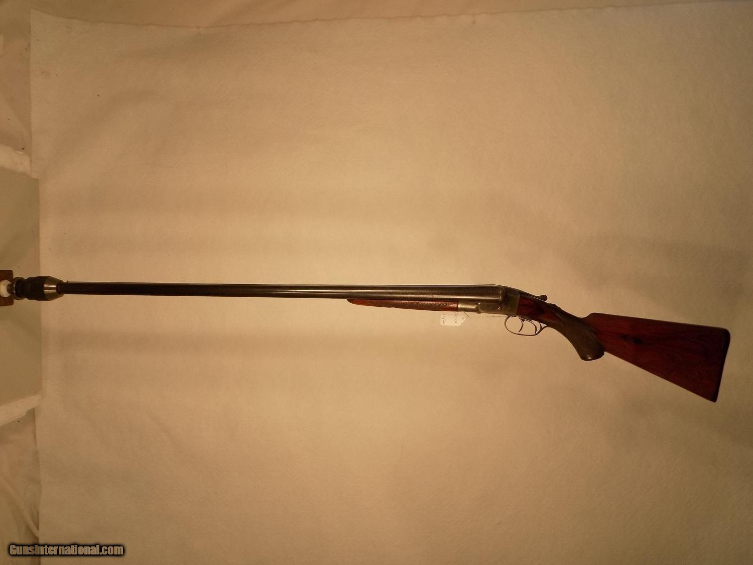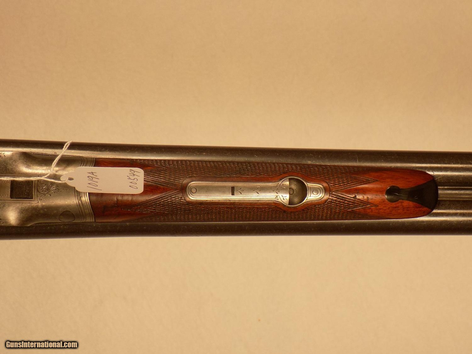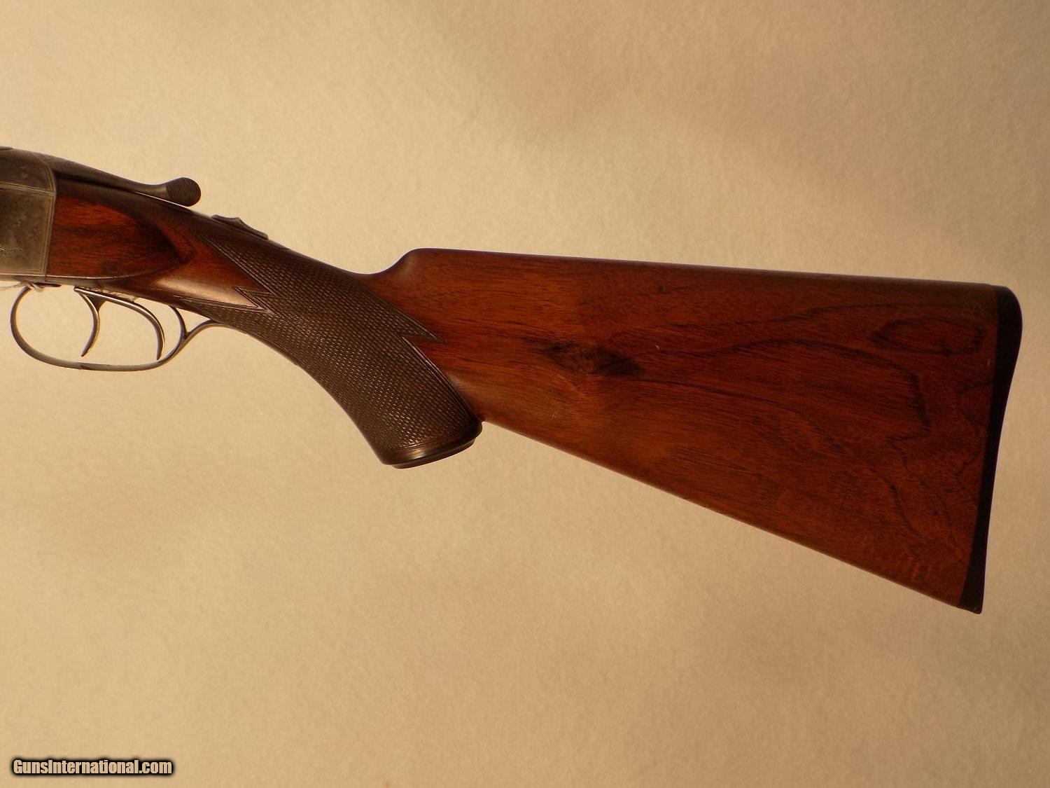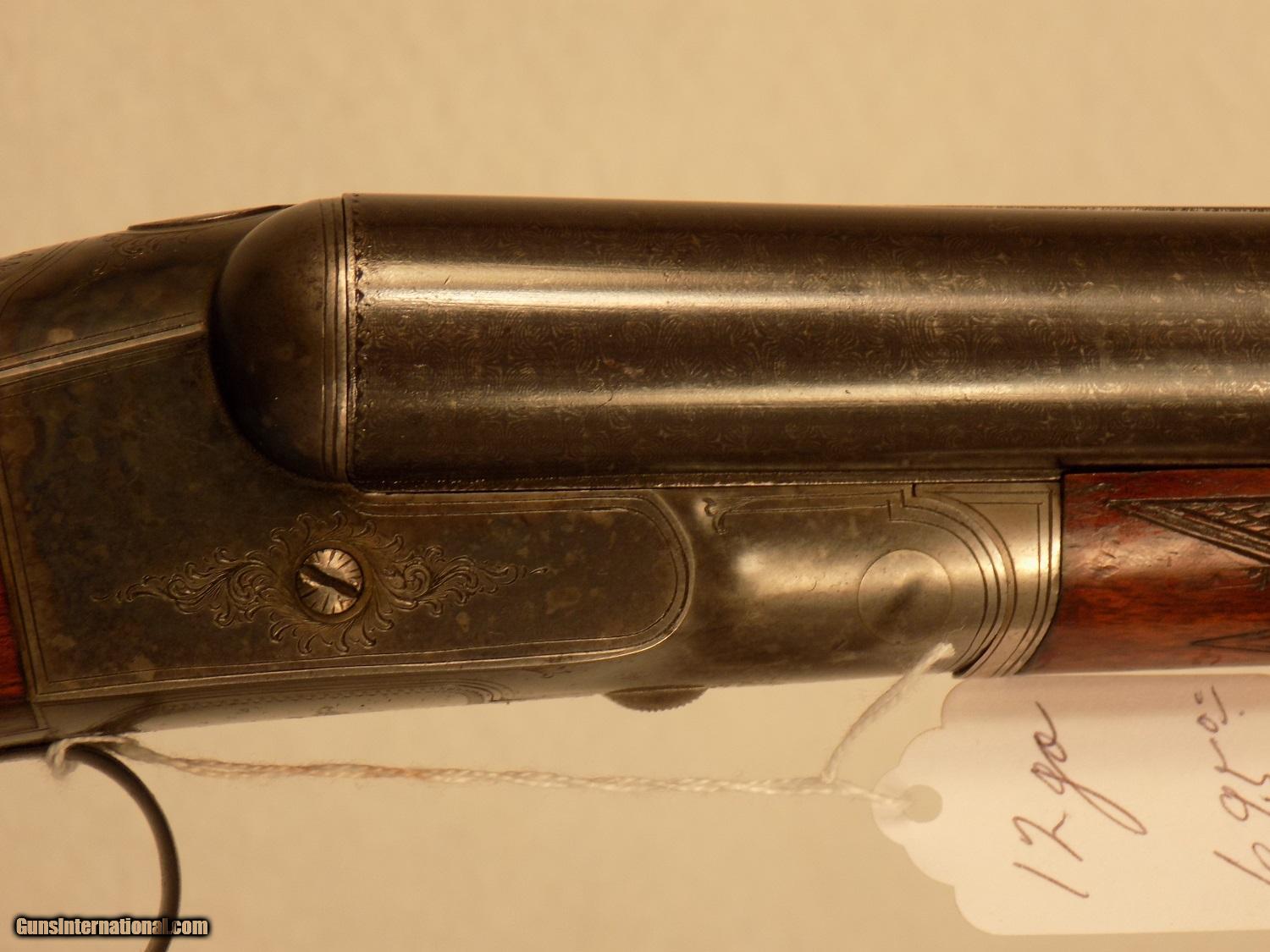 Description: #1019A FOREHAND ARMS COMP. DBL. SHOTGUN, 12 ga., 30” F&F bbls., top of frame marked “Forehand Arms Co. Worcester Mass.”, lightly engraved in a floral pattern, checkered PG stock with original checkered buttplate, PG cap has Co. logo, checkered forend with horn tip, 99% damascus finish on bbls., 70% casehardening on receiver, mint bores, matted rib. $650 SOLD |