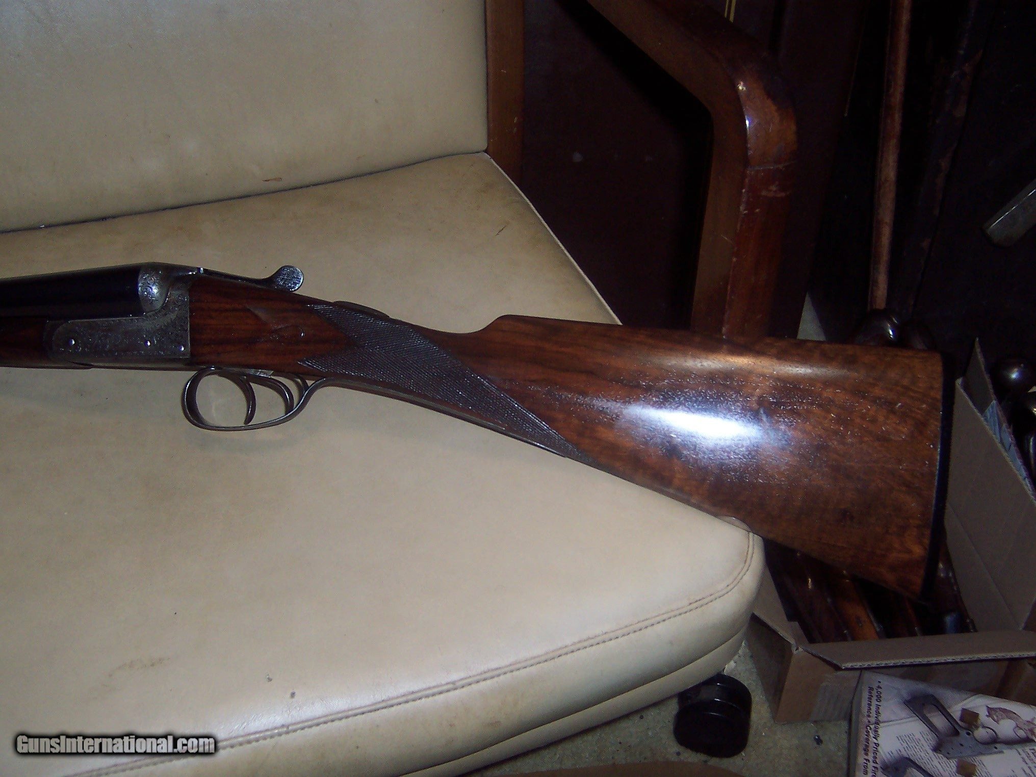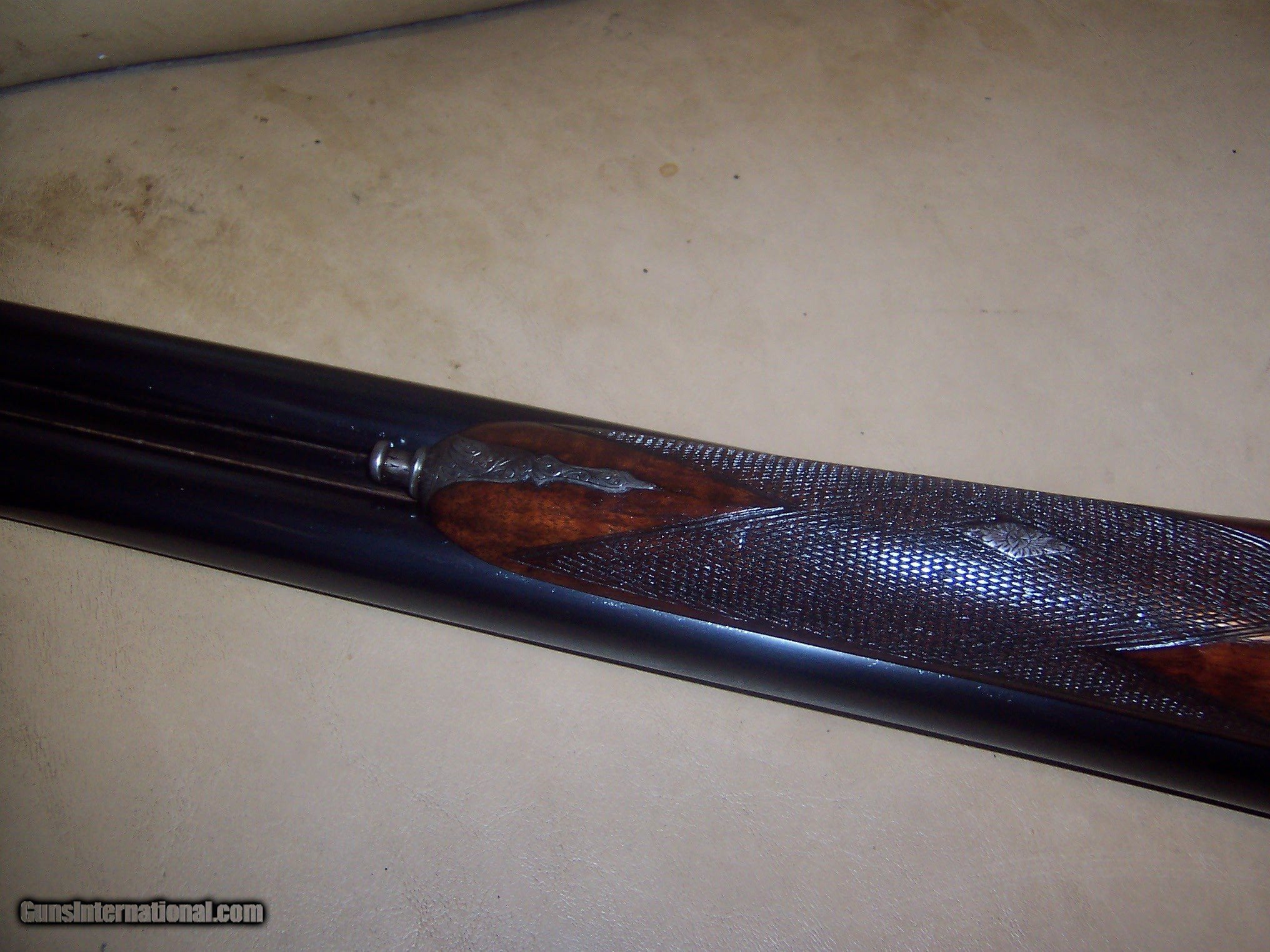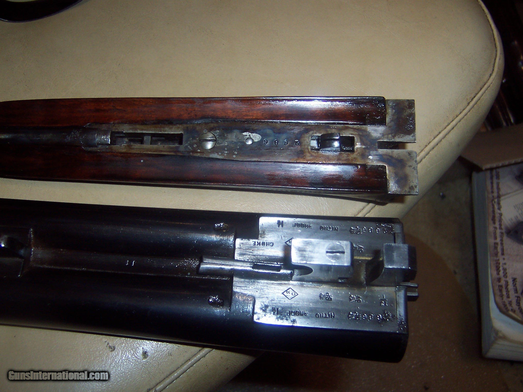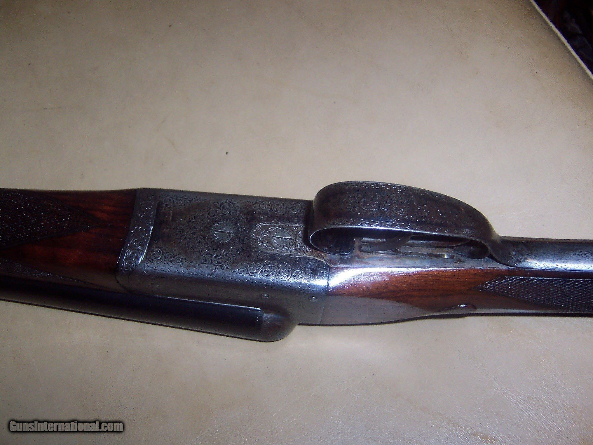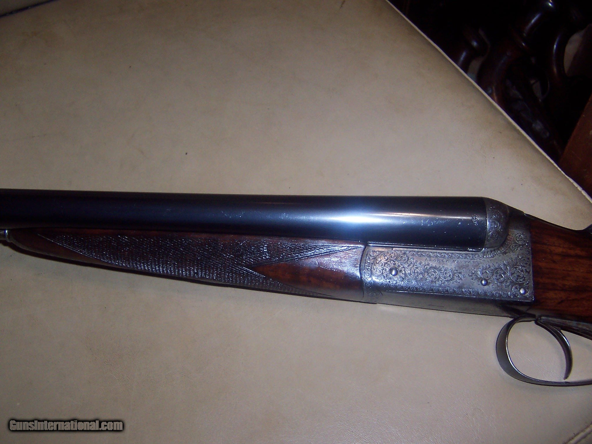 Description: 30 inch reblued 12 ga barrels/ shiney bores / mod and full // ex working and tight lock up / ex working ejectors // automatic safety / ex looking shotgun / lots of bank note engraving ex stock// matching serial numbers// $60 sh SOLD Curio/Relic: Yes Manufacturer: george hinton Model: sxs shotgun |