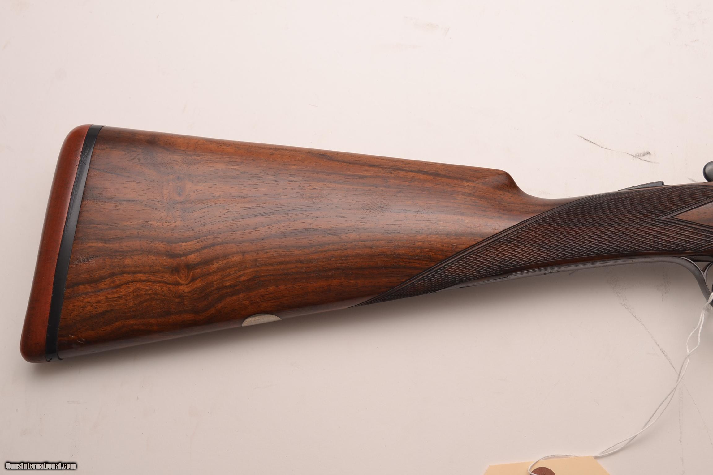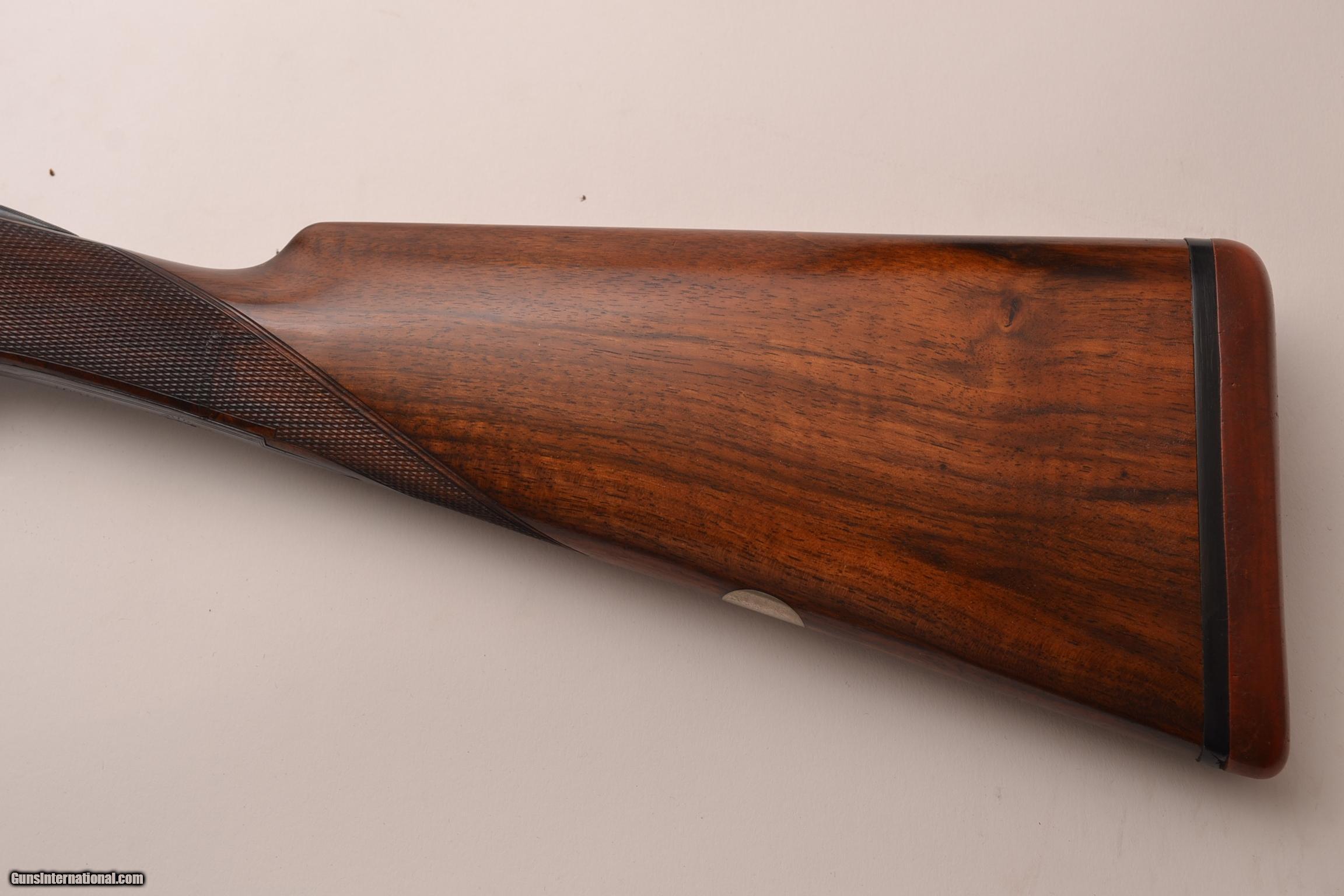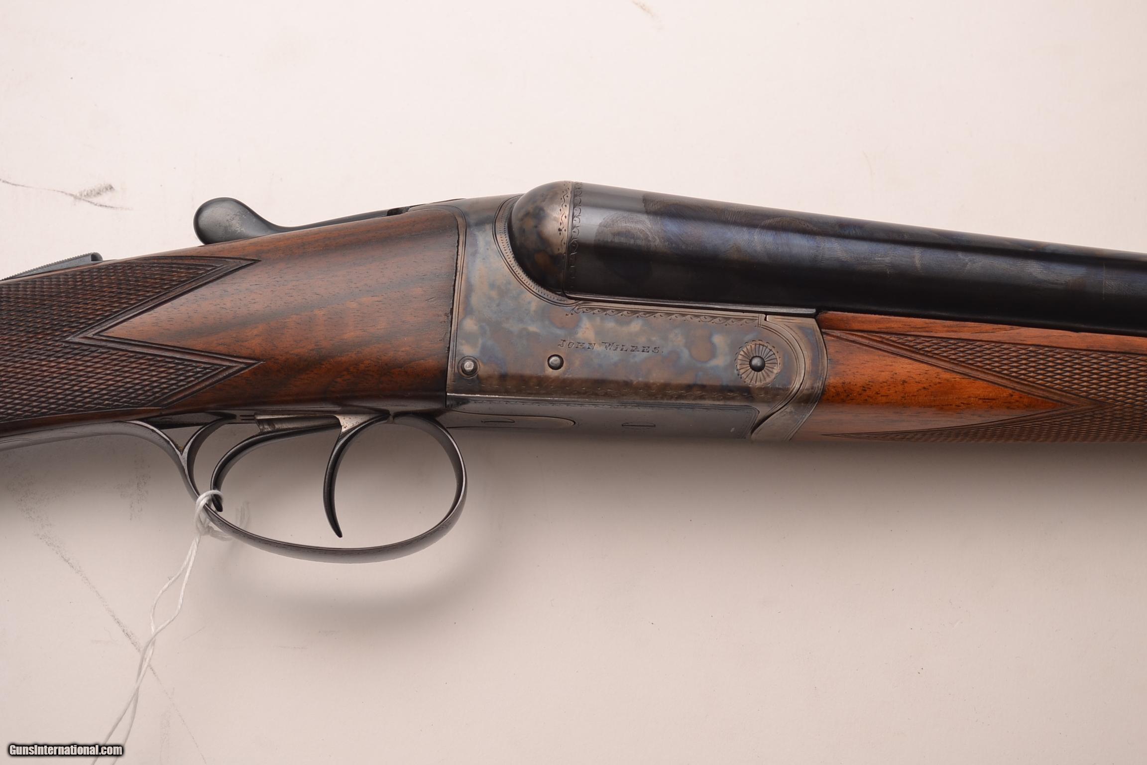 Description: JOHN WILKES, Boxlock 12ga., 28” CYL/Mod, straight grip, double trigger, gold oval, period recoil pad, splinter forend, game rib, extractor gun, very clean gun, bluing, wood finish, and checkering remain in excellent condition, 90% case coloring remaining, available for immediate delivery. Inv: 36259 15” x 1 ½” x 2” 6 lb.,6 oz. $1,999 SOLD |