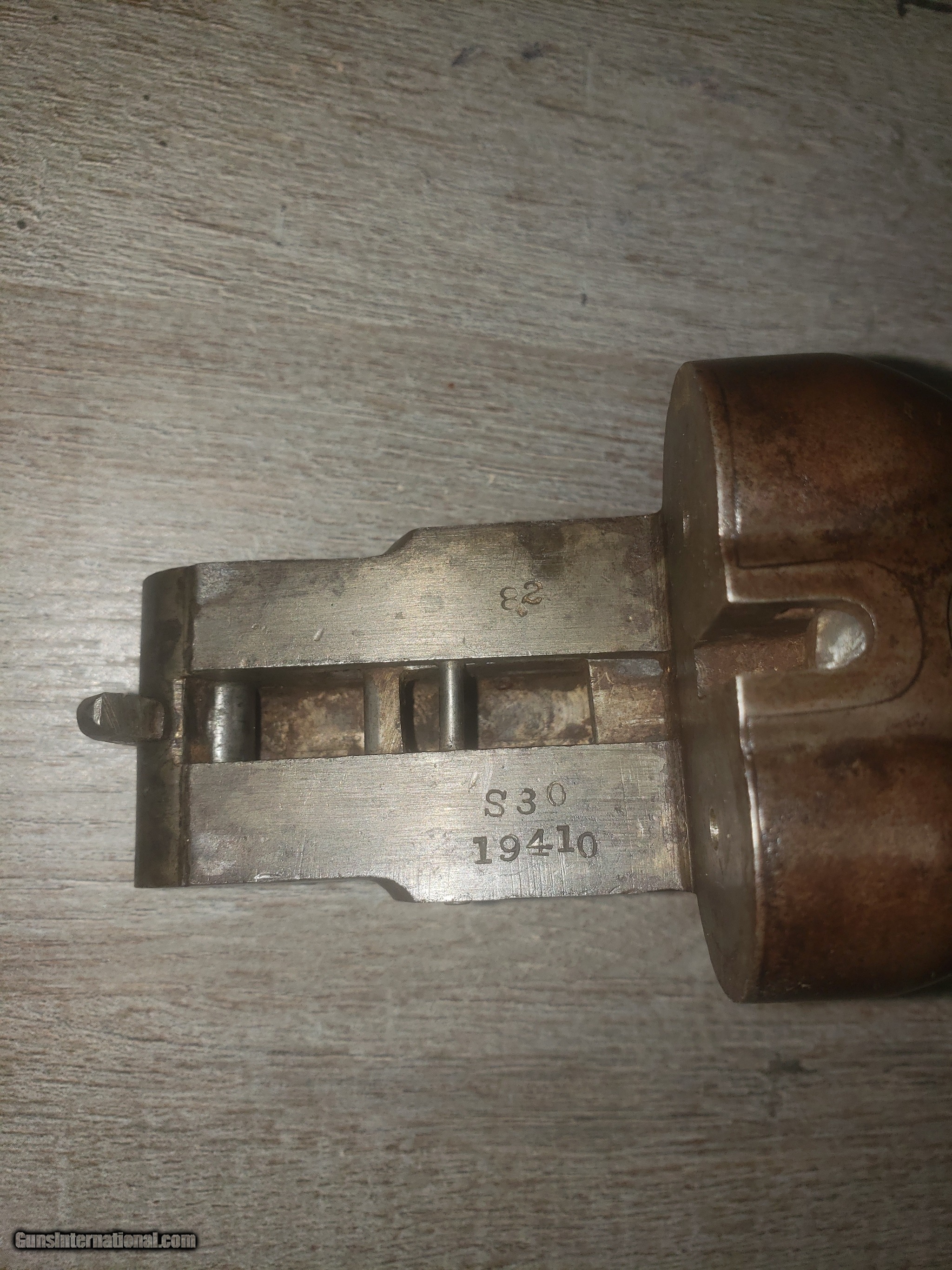 Description: Guns Listing ID: 1074239 A NICE COLLECTORS SIDE BY SIDE SHOTGUN. STAMPED S30 AND ON BARREL \"PAT‚‚D JULY 9TH 1907.\" STEEL BARREL, ALL ORIGINAL PARTS. THERE IS RUST UPON THE METAL AND INDENTATIONS/SCRATCHES ON THE WOOD AND METAL OF SHOTGUN. THE BARREL RELEASE IS DOES NOT LOCK WHEN BARREL CLOSES. NEEDS TO BE MANUALLY LOCKED. PICTURES SHOW ALL MARKS SOLD Manufacturer: MERIDEN Model: 82 Condition: Used - Non-Certified Barrels: 30 BARREL Gauge Info: 12 GA Finish: WOOD/ STEEL |