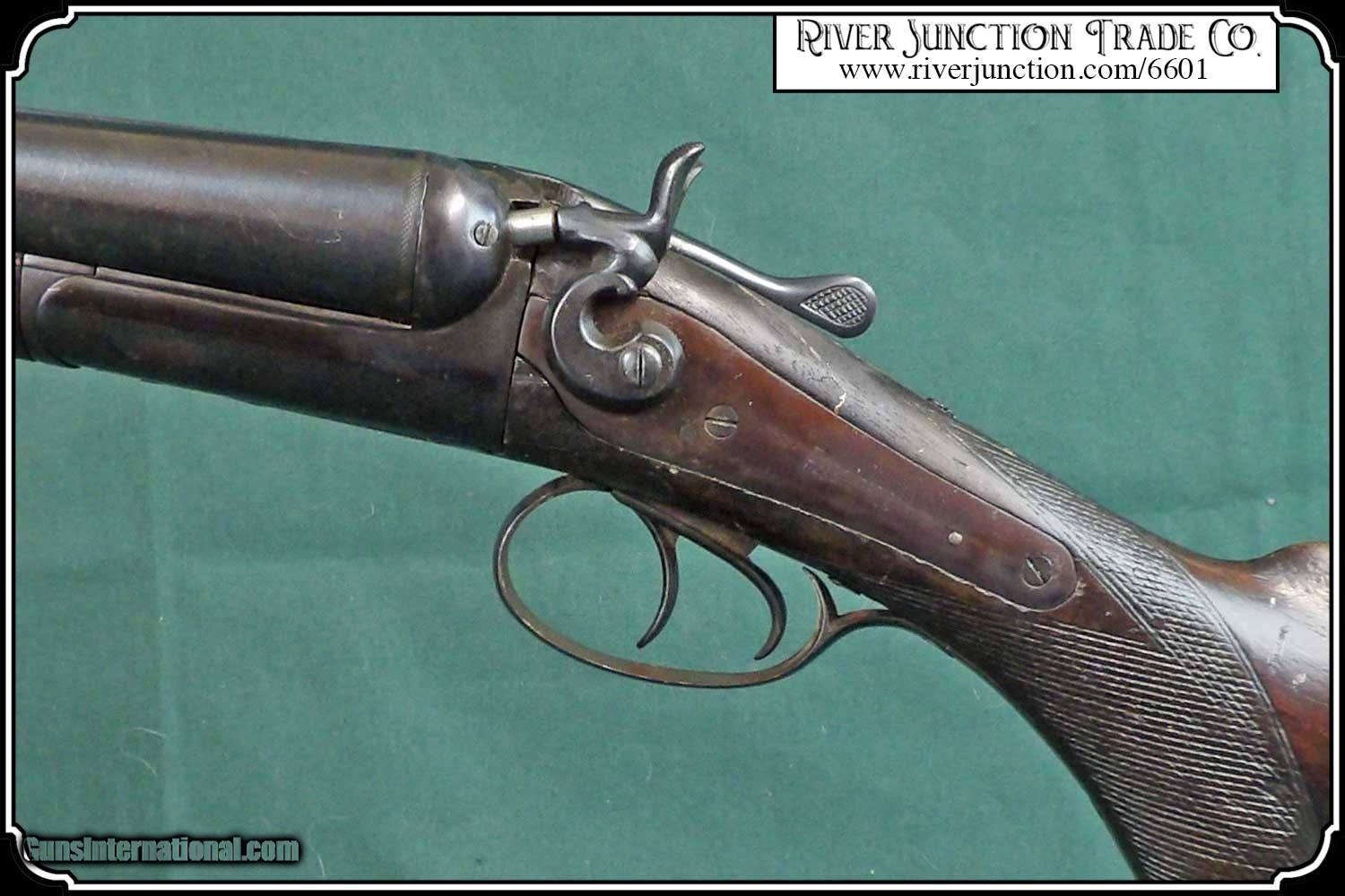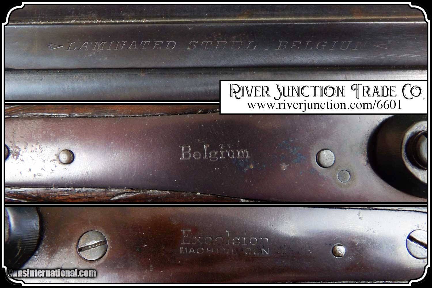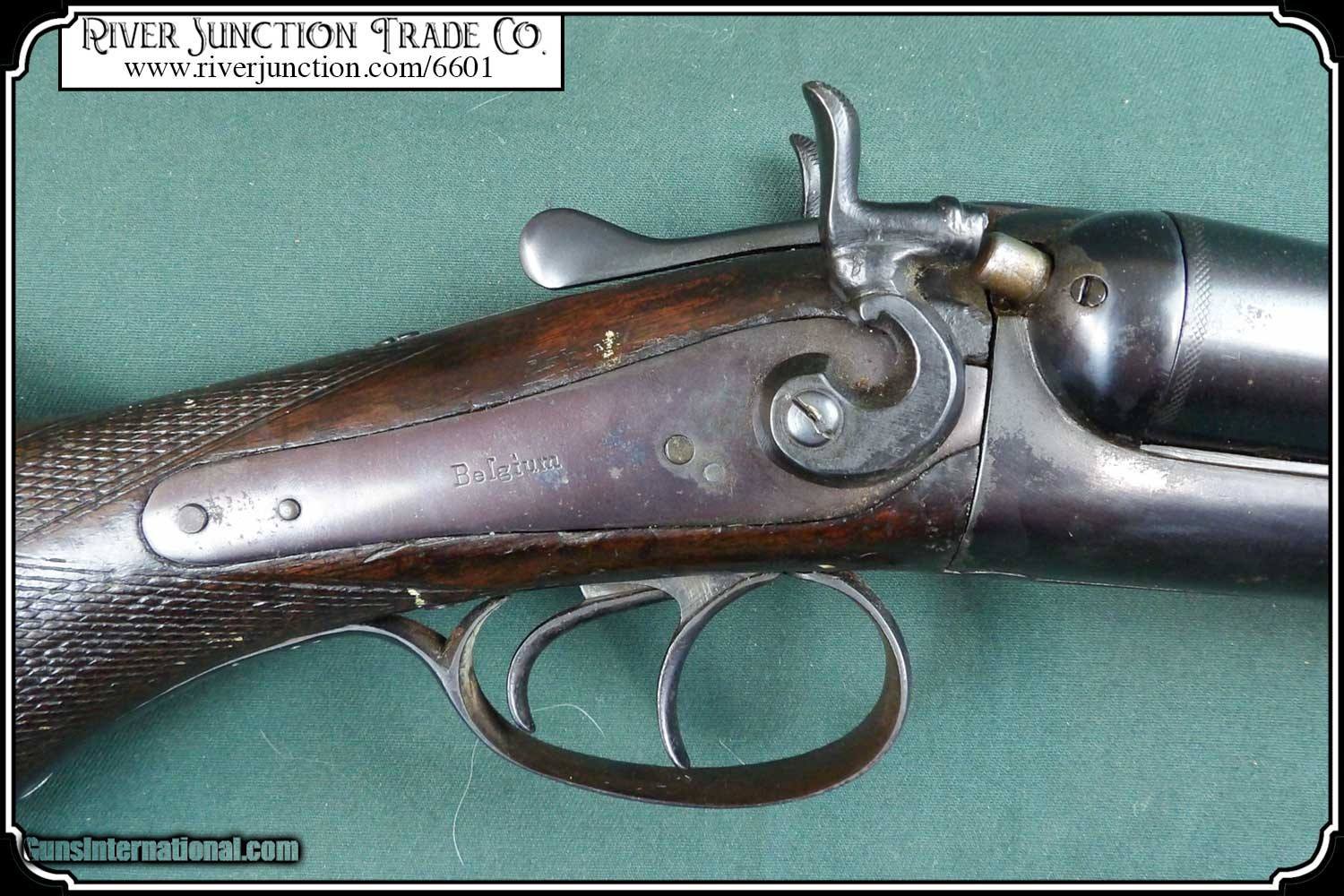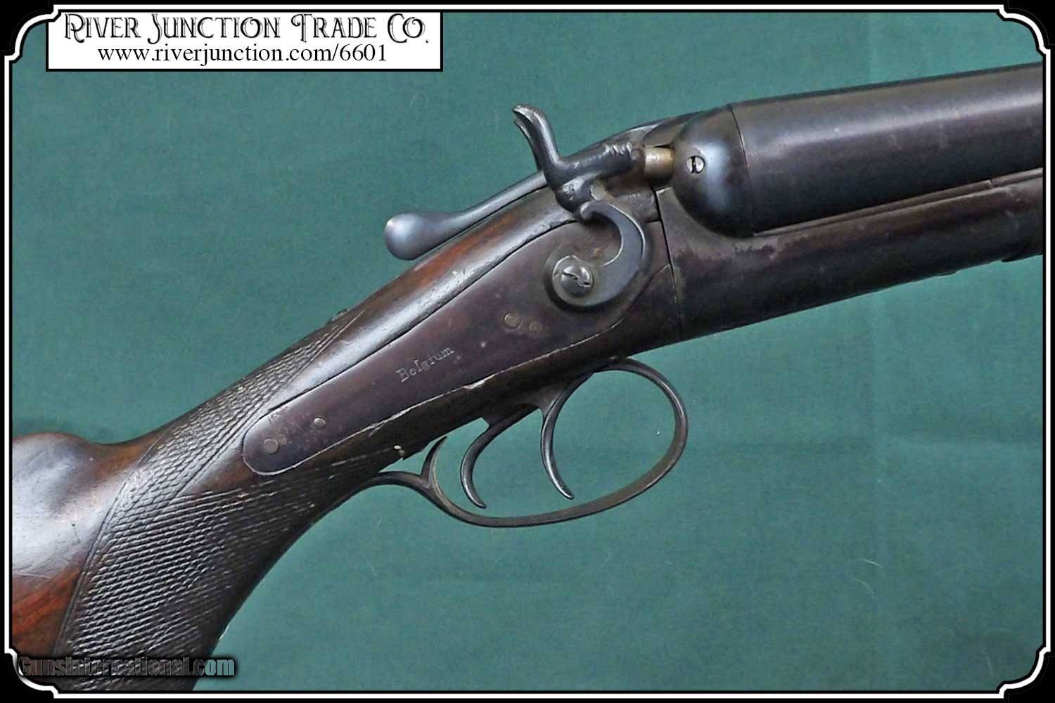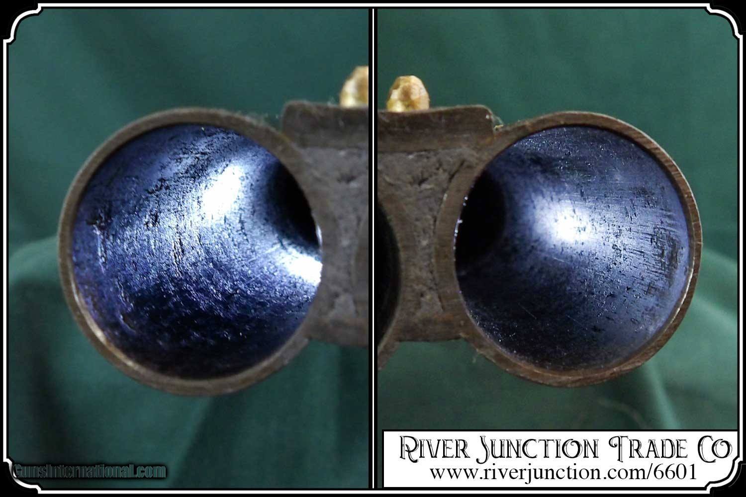 Description: Coach Gun / Saw off shot gun / Street Howitzer / Scatter Gun. The Coach Gun received its many moniker on the stagecoaches and streets of the Wild West. Stagecoach companies quickly implemented the use of guards to ride along side the driver carrying a weapon that allowed for some leeway in accuracy as they bounced along the bumpy trails. These Cut-down version Shotgun were also popular among Marshals and Sheriffs for their mobility and lenient accuracy at close quarters. The best feature of this gun is the sturdy stock that has stood the test of hard knocks on the dusty trails. The few dings and mars that do appear tell of use and service provided. Thumb the locking lever and you can break open the gun to reveal the lead-spitting barrels of this close-quarters defense weapon. The barrels shows a blackpowder frost pitting, common for these antique shotguns. Close and lock the barrels and cock both hammers. Finger the double triggers one at a time and the hammers will fall. On the plains of the late 19th century there was nothing else like the sound of a shotgun hammer. The feel and action of this legendary Old West tool will transport you back to the Dakota Territory, when your trusty shotgun was your last and best line of defense. Features Overall Length: 35”, with 18 1/4 inch barrels and 2 3/4 inch chambers. Lock up is very tight and secure. The steel butt plate shows as though it was replace at some time, but is the best choice for this hard work arm. Marked on the right lock is "BELGIUM" and on the left "EXCOLSION MACHINE GUN". On the barrels "LAMINATED STEEL BELGIUM FINE". This Coach Gun is in good mechanical working order . Great for cowboy loads and reenacting. Payment: Item, can be ordered on line with a credit card or paypal on our sight. Just Google (riverjunction) and type in the River Junction Trade Co. item number (6601) in the search box. Before you checkout you will see shipping cost and total. OR If you prefer: Pay by cash, postal money order, cashiers check, personal & business checks. We wait for checks to clear. We always answer questions and entertain offers. Have questions? Call me 563-880-4588. Jim SOLD |