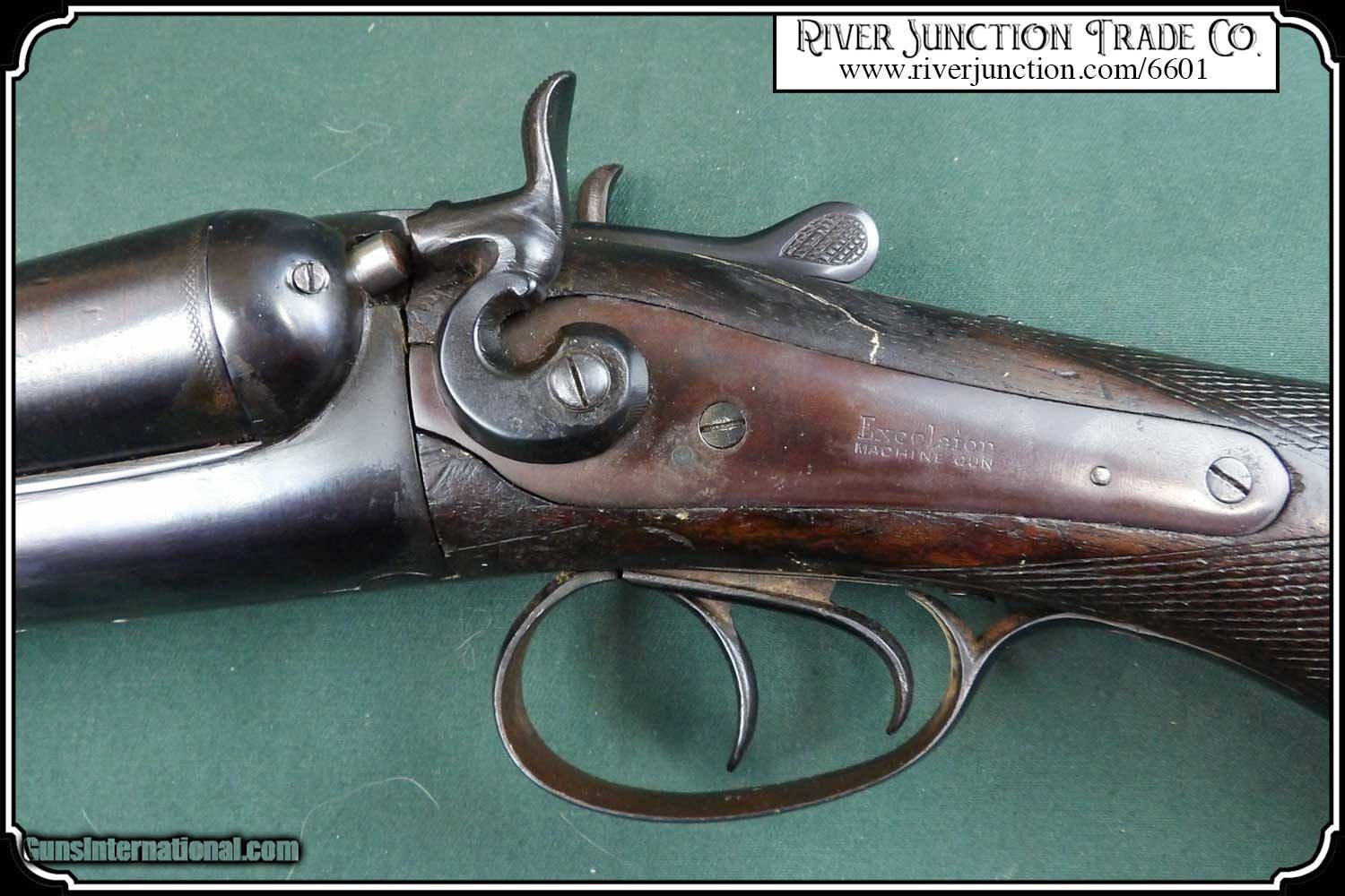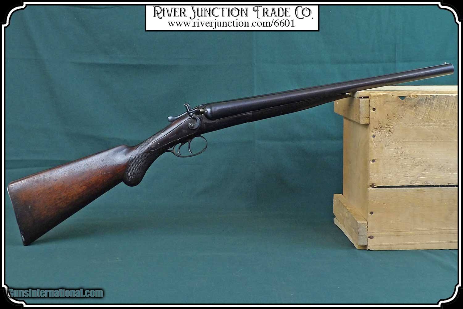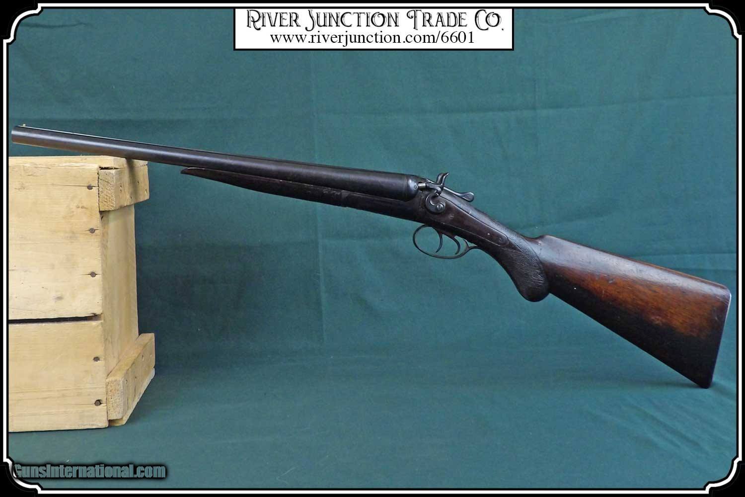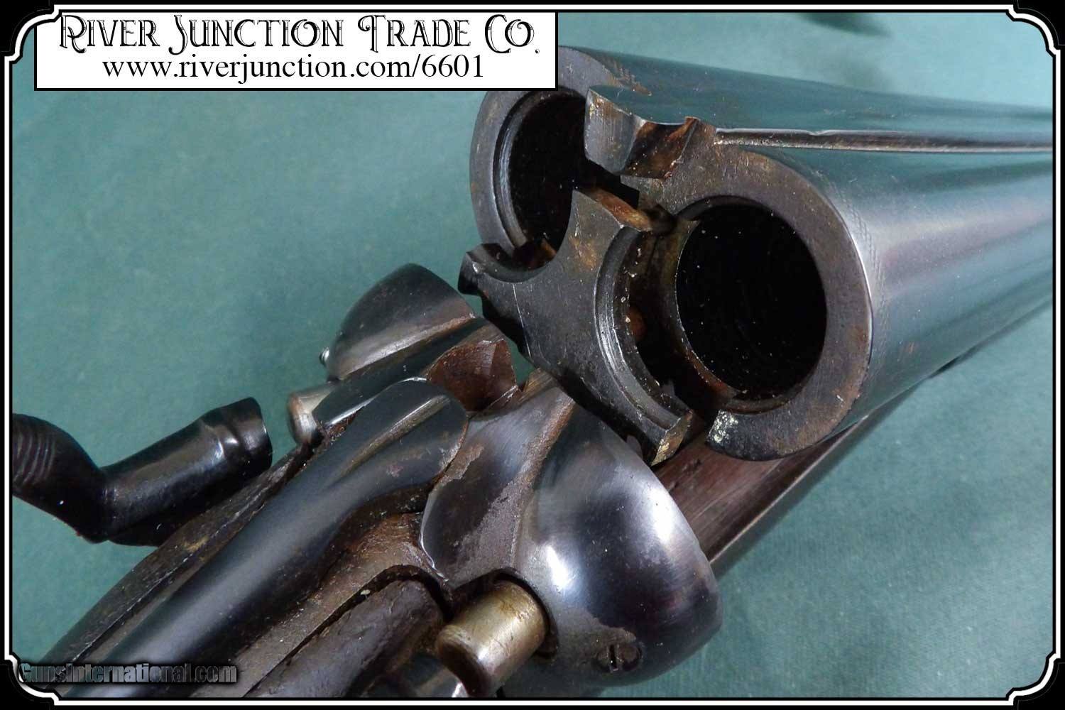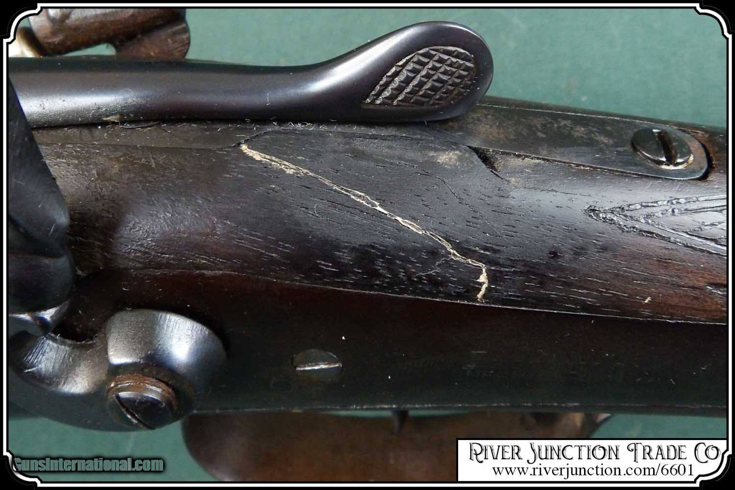 Description: Coach Gun / Saw off shot gun / Street Howitzer / Scatter Gun. The Coach Gun received its many moniker on the stagecoaches and streets of the Wild West. Stagecoach companies quickly implemented the use of guards to ride along side the driver carrying a weapon that allowed for some leeway in accuracy as they bounced along the bumpy trails. These Cut-down version Shotgun were also popular among Marshals and Sheriffs for their mobility and lenient accuracy at close quarters. The best feature of this gun is the sturdy stock that has stood the test of hard knocks on the dusty trails. The few dings and mars that do appear tell of use and service provided. Thumb the locking lever and you can break open the gun to reveal the lead-spitting barrels of this close-quarters defense weapon. The barrels shows a blackpowder frost pitting, common for these antique shotguns. Close and lock the barrels and cock both hammers. Finger the double triggers one at a time and the hammers will fall. On the plains of the late 19th century there was nothing else like the sound of a shotgun hammer. The feel and action of this legendary Old West tool will transport you back to the Dakota Territory, when your trusty shotgun was your last and best line of defense. Features Overall Length: 35”, with 18 1/4 inch barrels and 2 3/4 inch chambers. Lock up is very tight and secure. The steel butt plate shows as though it was replace at some time, but is the best choice for this hard work arm. Marked on the right lock is "BELGIUM" and on the left "EXCOLSION MACHINE GUN". On the barrels "LAMINATED STEEL BELGIUM FINE". This Coach Gun is in good mechanical working order . Great for cowboy loads and reenacting. Payment: Item, can be ordered on line with a credit card or paypal on our sight. Just Google (riverjunction) and type in the River Junction Trade Co. item number (6601) in the search box. Before you checkout you will see shipping cost and total. OR If you prefer: Pay by cash, postal money order, cashiers check, personal & business checks. We wait for checks to clear. We always answer questions and entertain offers. Have questions? Call me 563-880-4588. Jim SOLD |