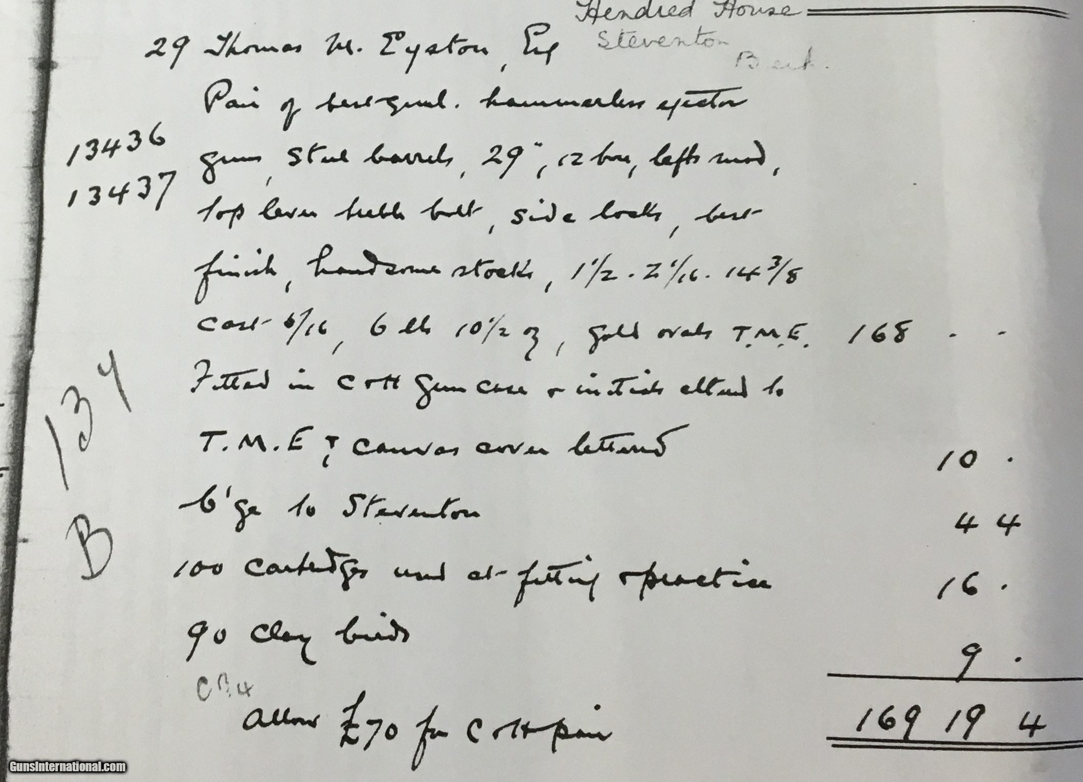 Description: Hammerless Sidelocks - I am really impressed with this William Powell. Tight on face, great stock dimensions, incredible engraving and wood, this one has it all. This would make an incredible gift, for oneself or a dear friend. Check out the case and accessories! Built in 1925. *** Note: To see this gun with high resolution photos and a zoom-in feature, go to the vintagedoubles main site and search for the gun ID: 4050 or browse the main site to see our full gun collection. SOLD Manufacturer: William Powell and Sons BEST in its case with accessories ~ An exceptionally beautiful shotgun with 2 3/4" Nitro proofs Model: None Serial Number: 13437 Ejectors: Yes Barrels: 28 Barrel Type: Sleeved Action: Sidelock ejector Gauge Info: 12 gauge Stock Comb: 1 1/2 Stock Heel: 2 3/8 Stock Cast: 3/8 LOP: 15" with Leather pad Weight: 6 lbs. 15 1/2oz. Choke Left: .035 extra full Choke Right: .015 Mod Proof:Nitro: 2 3/4 Minimum Wall Thickness Left: .036 Minimum Wall Thickness Right: .034 |