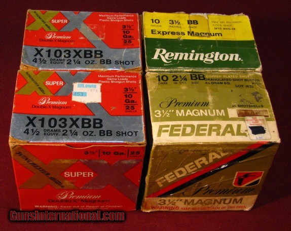 Description: Four full boxes factory new 10 Gauge Magnum 3 1/2" BB shotshells. The 3 boxes of premium ammo all have granular buffered shot. The box of Federal is also copper plated. None of this is steel shot. Price: $235.00 Buy Now Contact Seller |