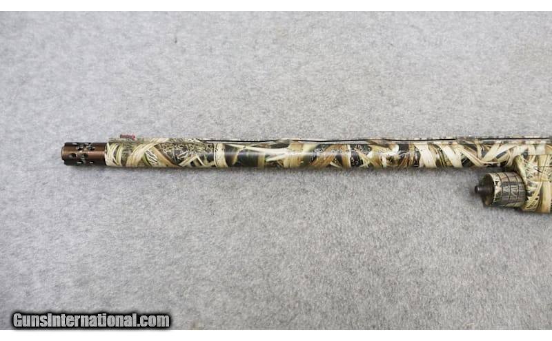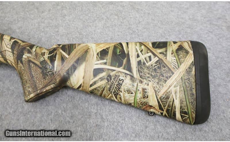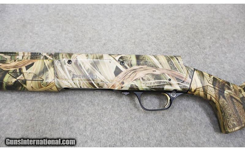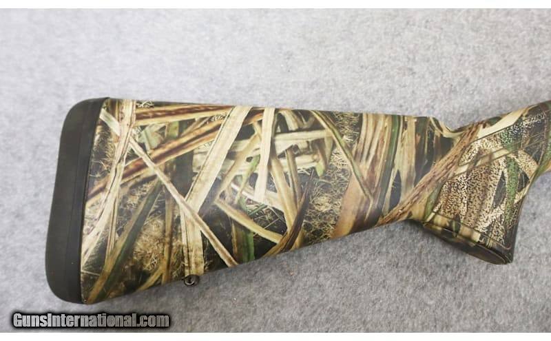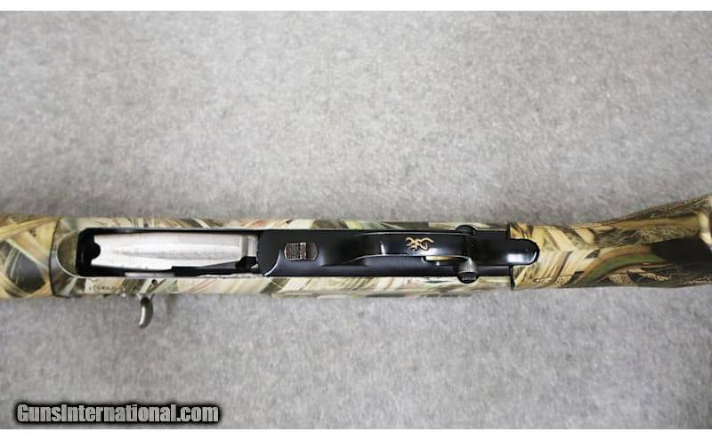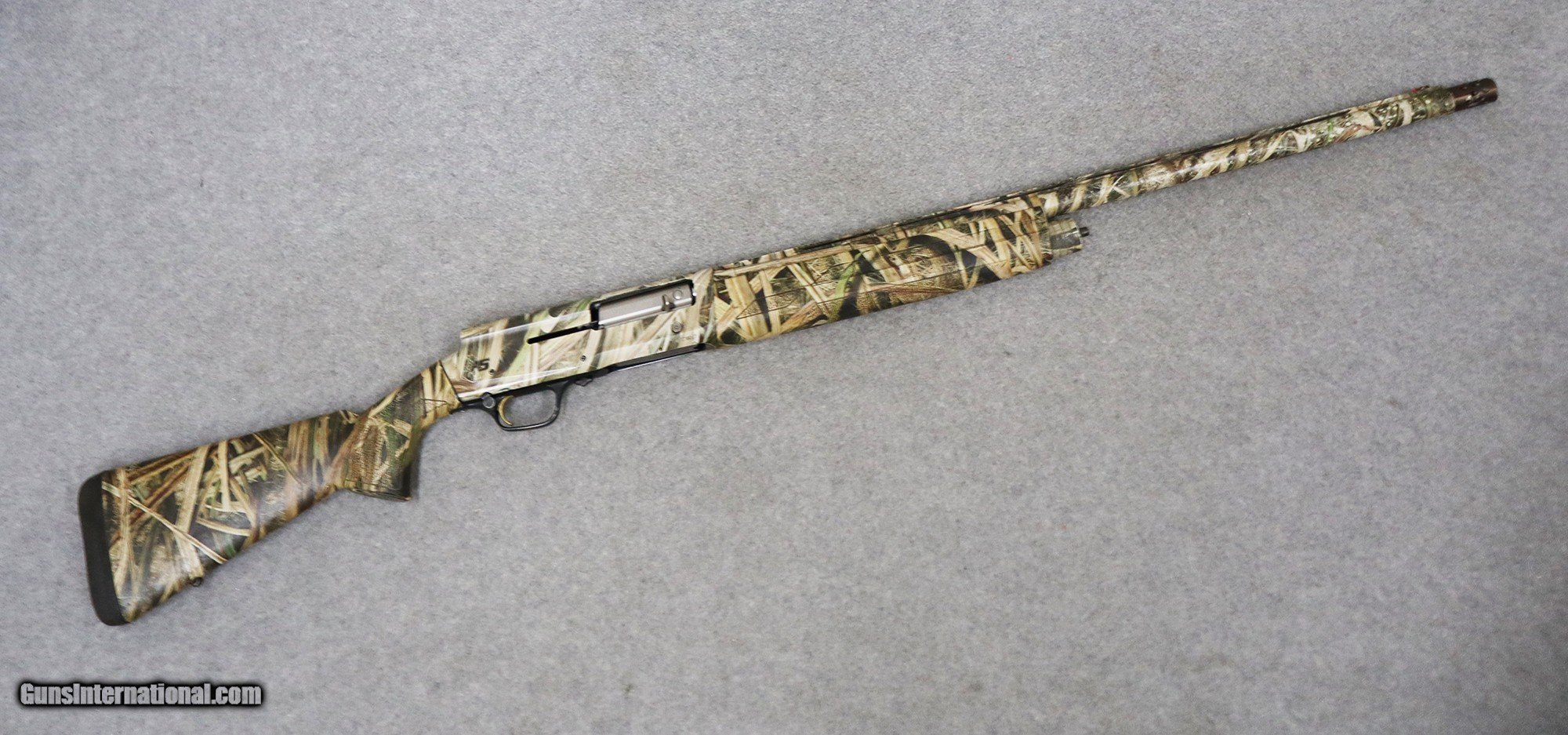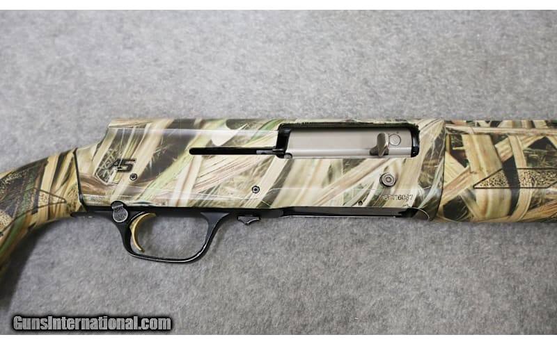 Browning model A5 in Very Good condition. This gun is chambered 12 gauge for 2 3/4, 3, and 3 1/2 inch shells. It is choked Improved Cylinder. The camo pattern is Mossy Oaks Shadow Grass Blades. Free shipping to any Bass Pro Shops or Cabelas store. 12 Gauge