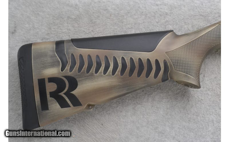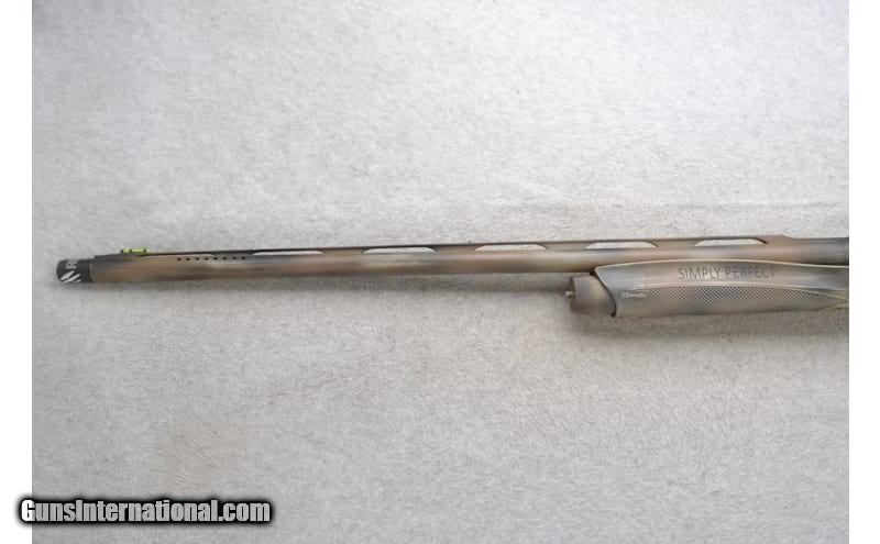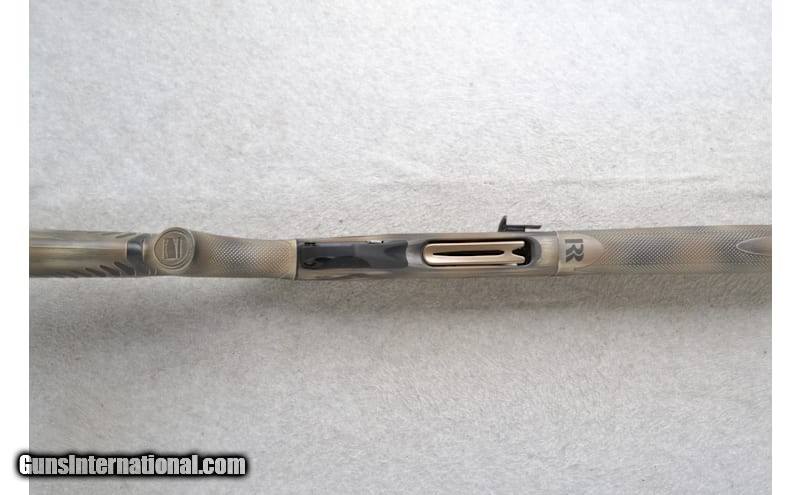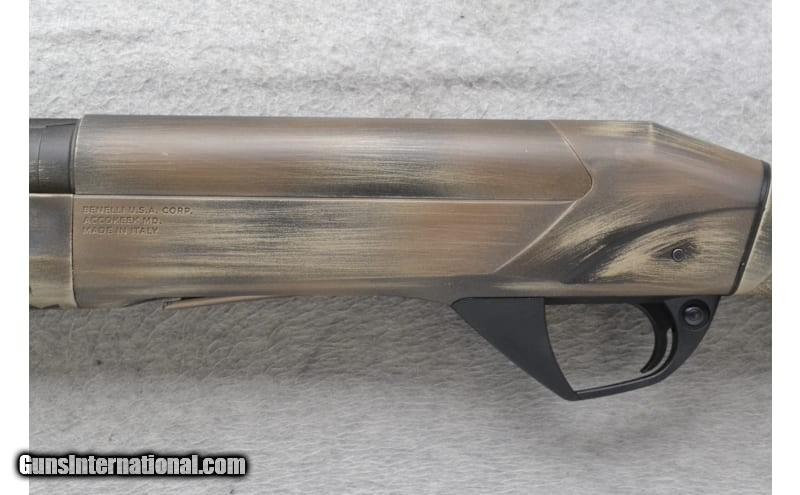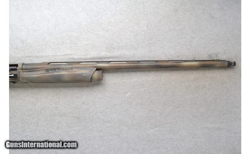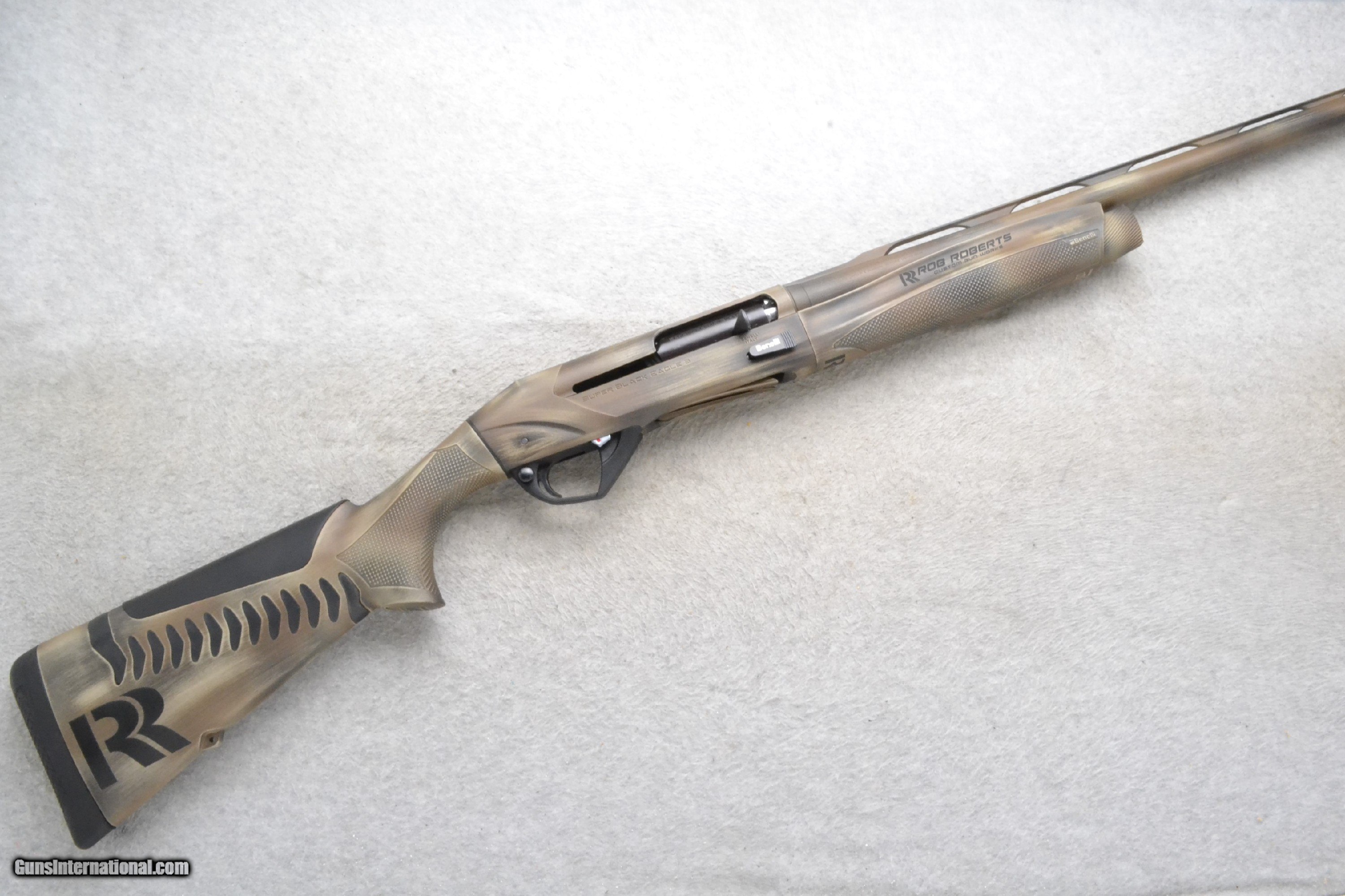 This Benelli Super Black Eagle 3 is a right-hand semi auto shotgun in 12 Gauge. It is a Rob Roberts Custom Gun Works edition featuring a distressed camo style with a ported 27.5" ventilated rib barrel, RRaptor RR2 Mid Range choke, 3.5" chamber and a green high visibility front sight. The forearm is checkered camo with finger grooves. The buttstock is a checkered grip camo polymer pistol grip with a black rubber buttpad and cheek rest. Made in 2022 in Italy. 12 Gauge. 12 Gauge