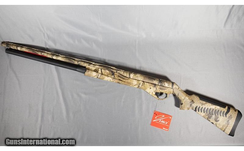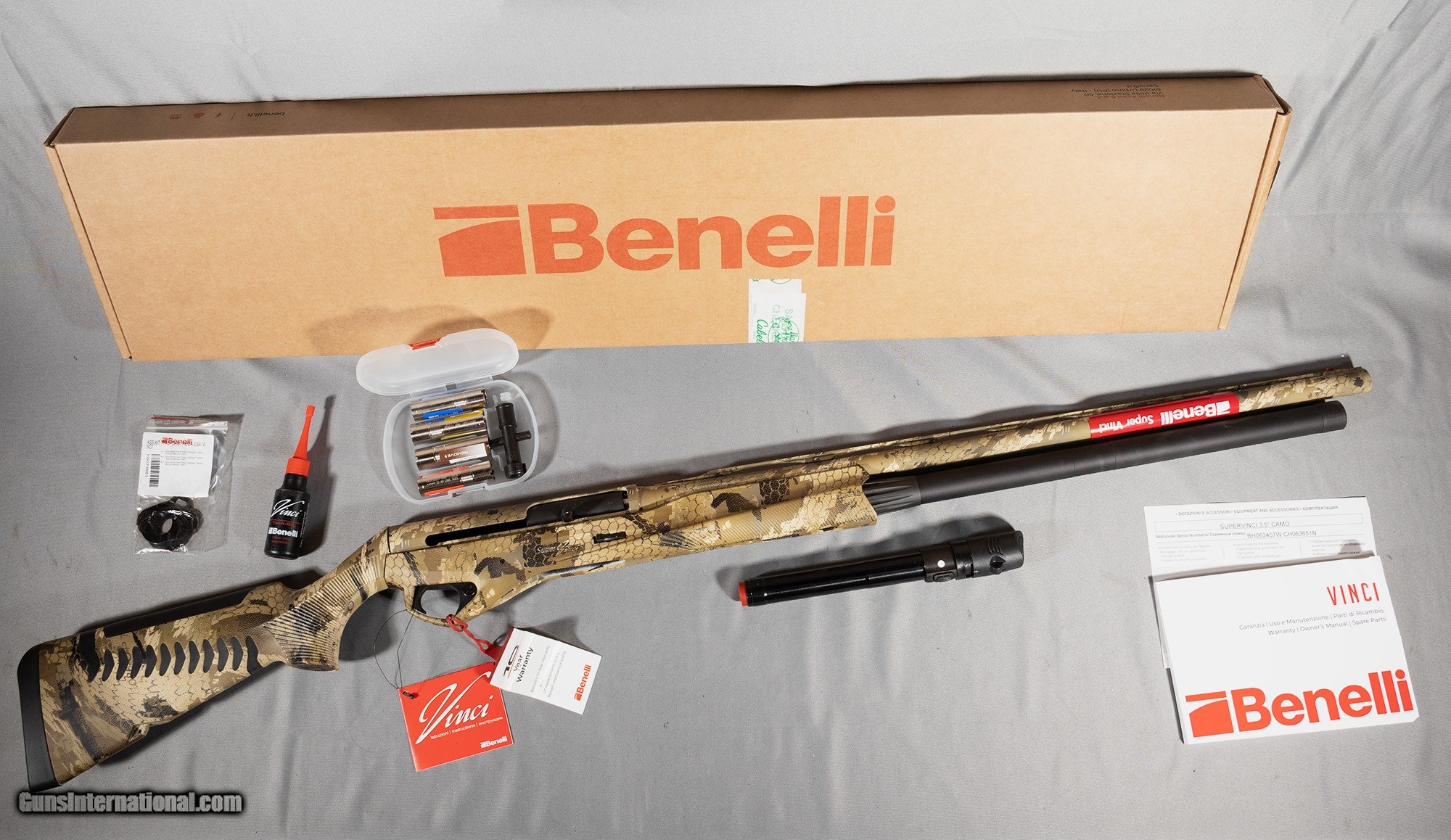 Released in 2009 and marketed as a completely new shotgun design unlike anything else on the market, the Benelli Vinci is the first semi-automatic shotgun to utilize an "inline inertia" recoil-operated system and designed to be a modular shotgun of sorts, made up of three distinct sections: a trigger group and lower receiver, the upper receiver and barrel assembly, and a stock assembly that requires no tools to change stocks out. The modular design of the shotgun chassis allows users to change stocks as needed, as well as keeping different barrel assemblies on hand for hunting expeditions or different seasons. The shotgun was quite a gamble for Benelli to take, with a unique appearance that was bulkier than Benelli's signature Super Black Eagle and M-series shotguns and about as far away from a traditional shotgun aesthetic as you can get without looking to tactical AR-styled designs. For some, this was a refreshing addition to the market, while others were disappointed in Benelli's newest offering. The inline inertia system puts the bolt return spring directly behind the bolt assembly and allows the bolt to move straight backwards without any vertical movement. Benelli claims this to help keep follow-up shots on target with less felt recoil and less muzzle climb. Mechanically, the new method of assembling the shotgun at the barrel extension and the inline inertia system actually eliminates a lot of wear points on the shotgun's internal points of contact. The construction methods used in assembling the Vinci allude that the shotgun could continue to run for longer than many other semi-automatic shotguns, including Benelli's own models. Even with the user-friendly parts-swapping features and the inherently durable design of the shotgun, the Vinci was retired from Benelli's lineup in 2019 and its larger 3 ½"-chambered brother, the Super Vinci, was discontinued in 2021. This Benelli Super Vinci is a 12 gauge model with 27 ½" barrel and 3 ½" chamber in full GORE Optifade Marsh camouflage. The barrel has a raised vented rib with silver mid bead and red fiber optic front sight, as well as a drilled & tapped receiver for adding optics. The shotgun accepts Benelli Crio and Crio Plus choke tubes and includes a full set of tubes (cylinder, improved cylinder, modified, improved modified, full) and choke wrench. The shotgun features Benelli's signature ComforTech stock and forend styling with rubberized foam buttpad. The extended magazine tube on this Snow Goose model allows for 10 rounds to be loaded in the magazine tube and includes another standard magazine tube module to hold 3 rounds for other hunting seasons. This shotgun is in a new, unused condition and includes the original factory box, an additional short/standard magazine tube module, set of chokes, shims, oil, and user manual/warranty. 12 Gauge