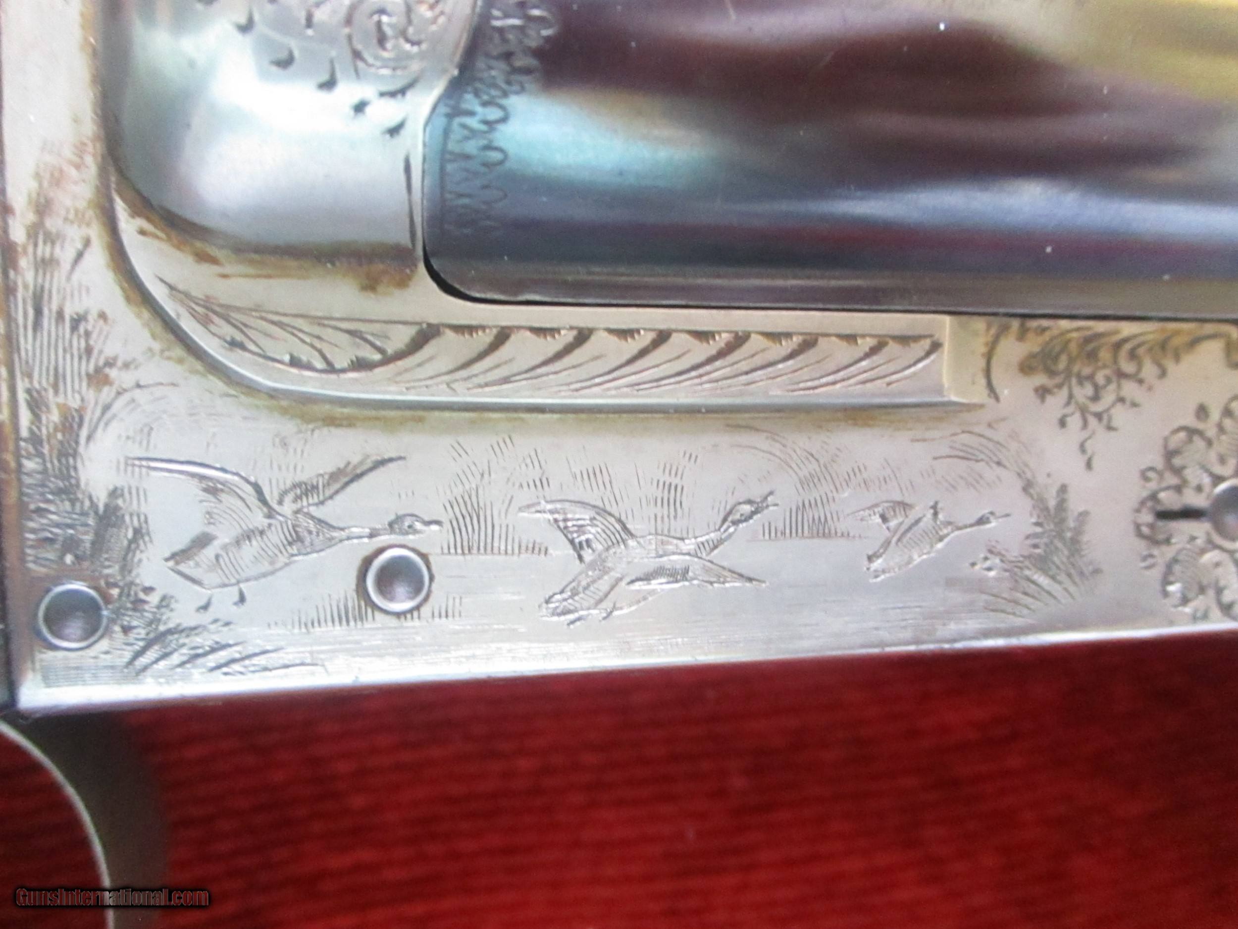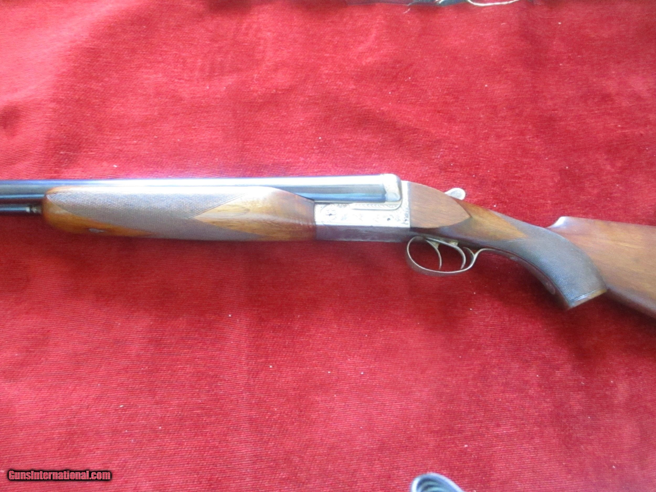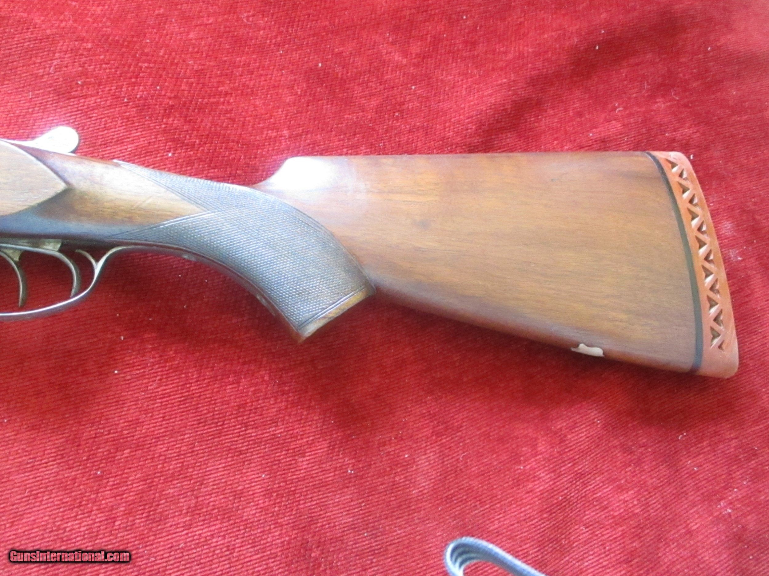 Description: 32" F/F, classic checkered swamp rib, DT's, ejectors, engraved with ducks & geese on satin coin receiver, also engraver fences, triggergard & tangs, Belgium walnut straight grained walnut , factory pad, one of the least known, classic & not least, quoted to be one of the greatest 10ga. waterfowl doubles ever mfg.for the $.!!! 98% overall with NO noticeable blemishes. SOLD |