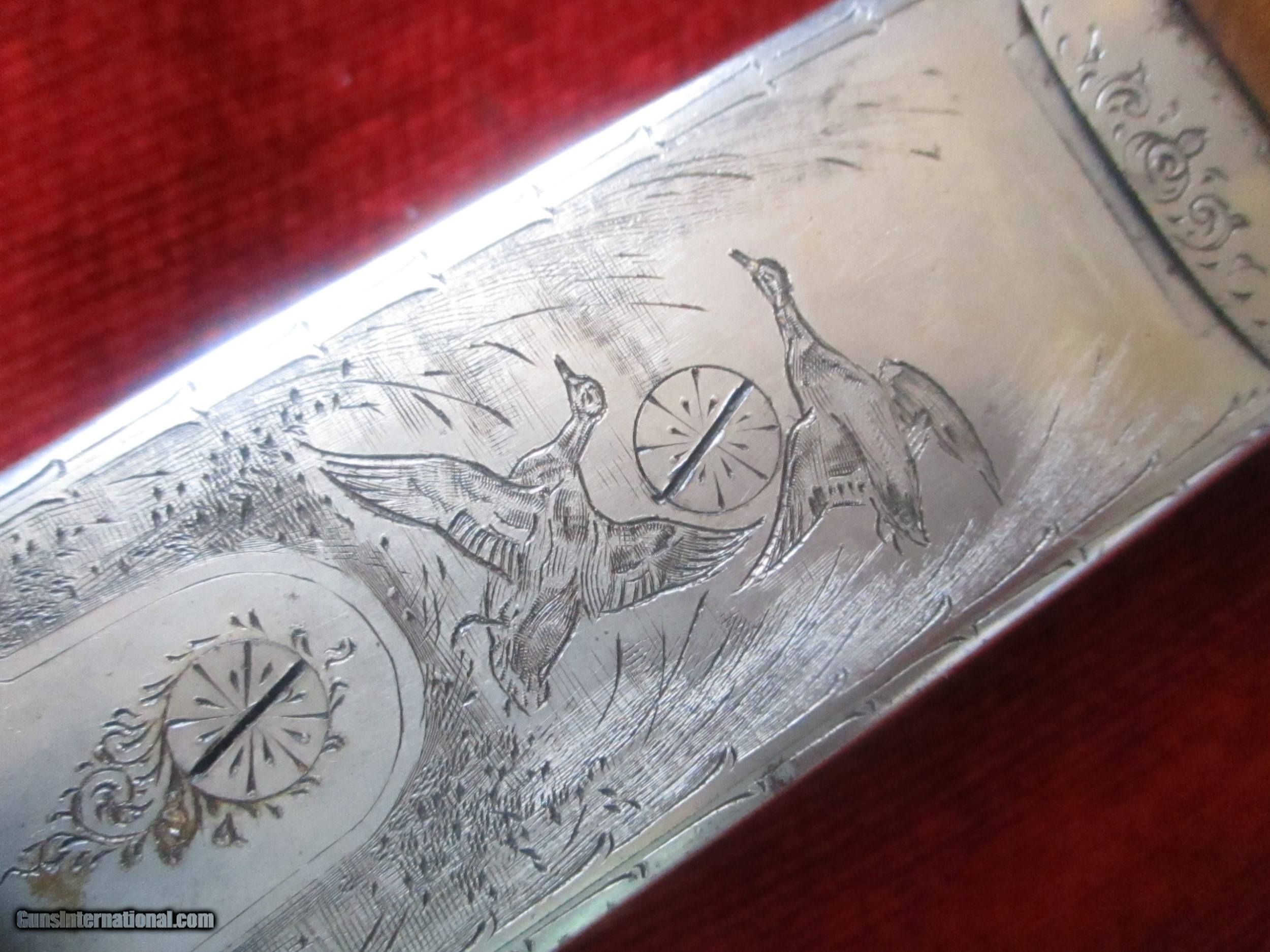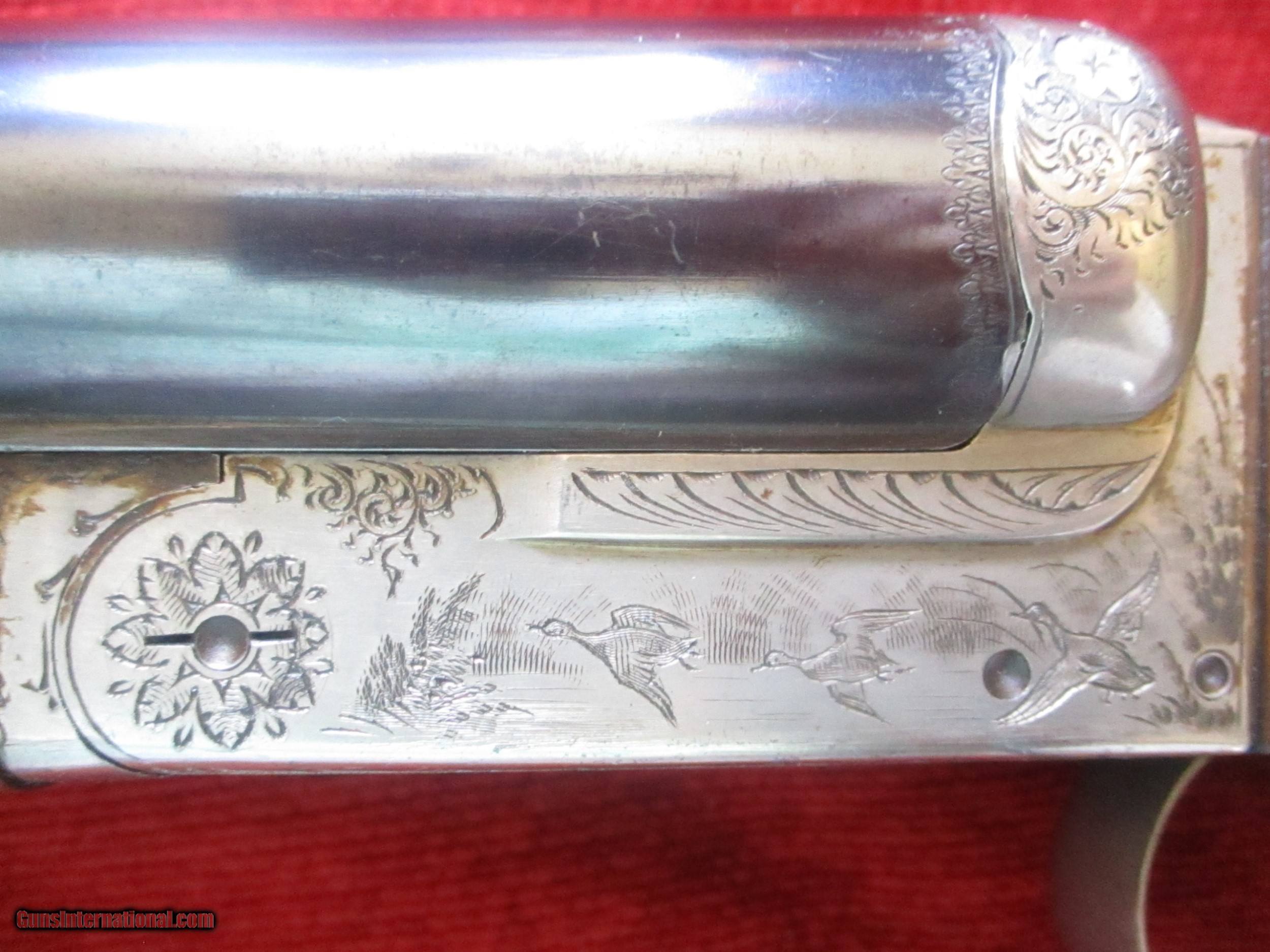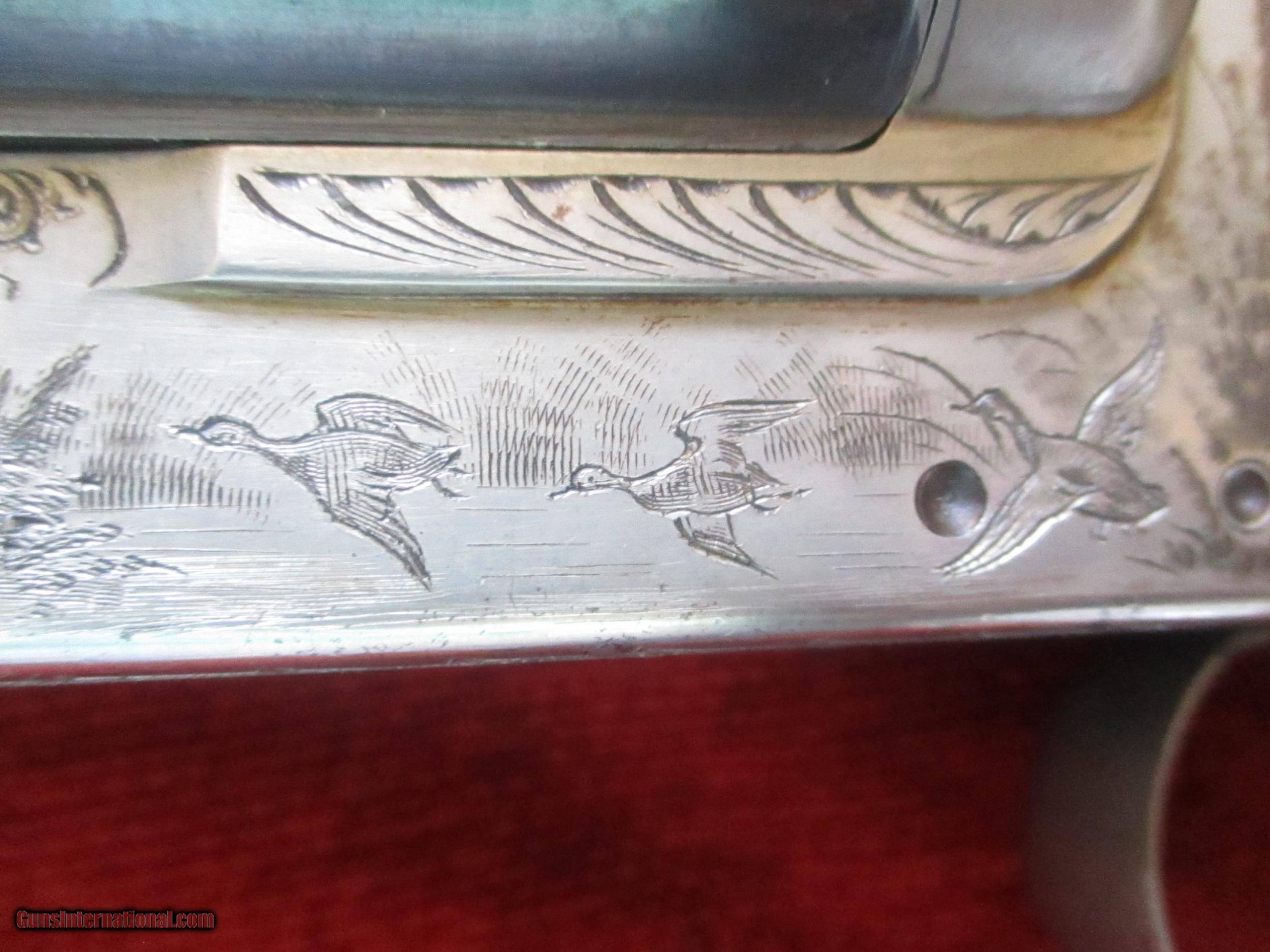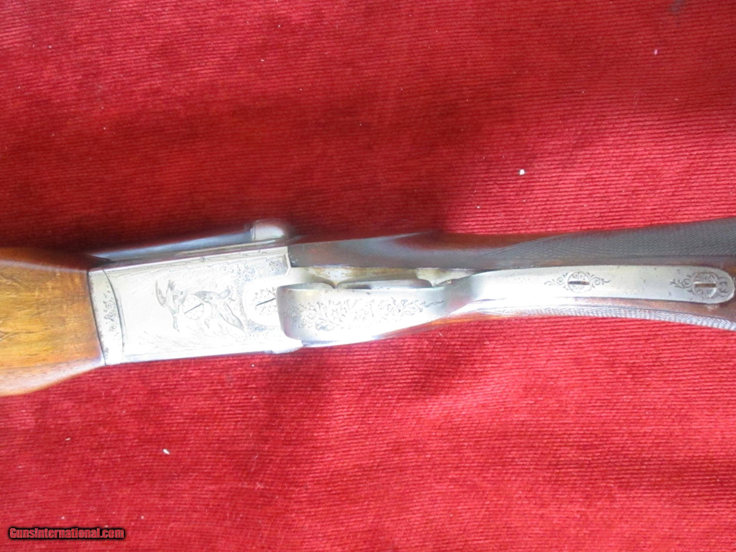 Description: 32" F/F, classic checkered swamp rib, DT's, ejectors, engraved with ducks & geese on satin coin receiver, also engraver fences, triggergard & tangs, Belgium walnut straight grained walnut , factory pad, one of the least known, classic & not least, quoted to be one of the greatest 10ga. waterfowl doubles ever mfg.for the $.!!! 98% overall with NO noticeable blemishes. SOLD |