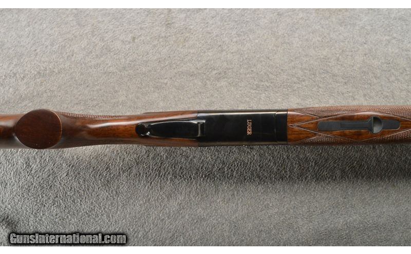 Description: This is a very nice and hard to find Luger 12 gauge O/U 3.5" magnum shotgun. The metal and wood are close to new looking with a couple of very small marks in the wood. The faces are clean and the shotgun does not look like it has been fired very much. If you like a short barreled shotgun and want magnum power this shotgun is for you. 12 Gauge SOLD Chambers: 3.5" Over/Under magnum with ejectors. Metal Condition: Looks like new. Wood Condition: Excellent with a couple of tiny dings. Bore Condition: Bright and shiny. Barrels: 26" blue with vent ribs. Triggers: Single gold color. Stock Dimensions: 14 1/8" LOP. Fore End: Very nice checkered walnut with finger grooves. Butt Pad: Black rubber butt pad. Weight: 7 Lbs. 11 Oz. Sights: Mid and front brass beads on the vent rib. Chokes: "Screw in, IC and MOD. Item Location: Owatonna, MN |