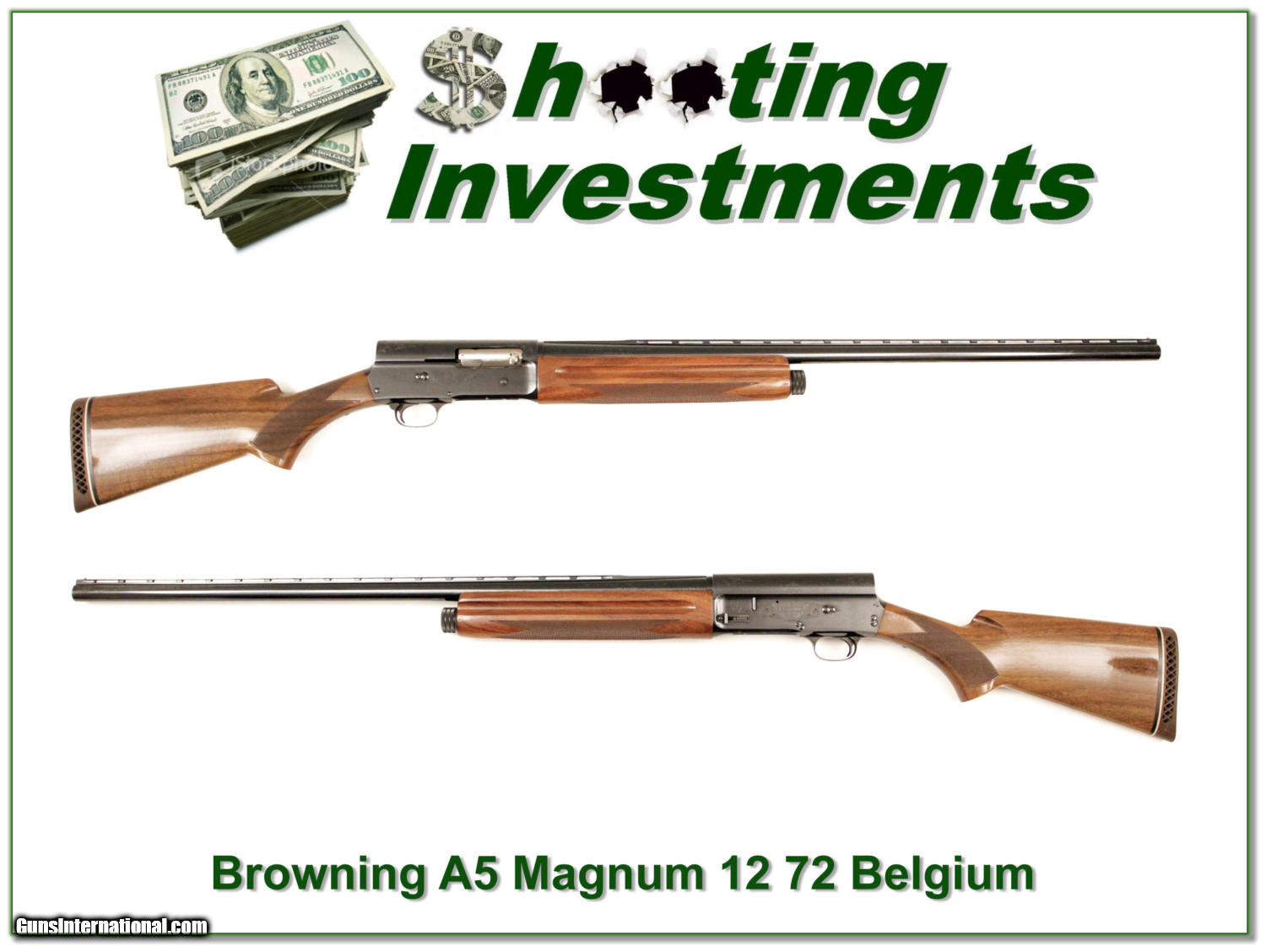 Description: This is a A5 12 Gauge Magnum. It was made in Belgium in 1972 and is in excellent collector condition. It has nicer wood grain than most. The blue has no edge, recoil or trigger wear. The wood has no marks of note. The barrel is a 30in VR full. This will make a fine addition to your collection. It is a real Shooting Investment! Shipping and insurance is $35 or $15 more if you want it shipped in a new Plano hard case. Please email me with any questions or larger pictures. (I now consign quality firearms only 10%! Let me know if you have any you would like to sell!) [16-0231] Payment: Payment is by Money Order, Cashiers Check or Personal Check. I can now also accept MasterCard and Visa with a 3% convenience fee. PayPal can be used for some items but never firearms. Please let us know if you would like to pay via PayPal. Shipping: The shipping charge will be listed in each description. It is $35 for most guns. Some heavy guns or those insured for over $2000 will be higher. Shipments to Alaska and Hawaii are higher because air shipment is required. Most firearms are shipped within 5 days of receipt of payment. We prefer shipping at the beginning of the week to avoid firearms in transit over weekends. We package all shipments carefully and insure them for the full purchase price, rounded up to the next $100. In the unlikely event that damage occurs, it is important that you save all packaging material for the claims process. Optics are shipped Priority Mail and most other non-firearm shipments are shipped First Class. Returns: Our return policy is simple. If for any reason you are not pleased with your purchase, you may return your item for a refund. The only exception is ammunition, it cannot be returned. It is important to us that you are happy. Guns cannot be fired or dissembled before returning them and must be returned in the same condition as received. Notification of a return must occur with-in 3 days of receipt at your dealer. Shipping, convenience and dealer fees are not refundable and are the responsibility of the buyer. Lay-a-way: If needed, we offer a 60 day lay-a-way option on most firearms. It is 1/3 now, 1/3 in 30 days and 1/3 in 60 days. Lay-a-way firearm sales are final. Consigning your firearms with Shooting Investments: We will help you get top dollar for your firearms. While most local guns shops charge 20% or more, our fee is only 10% with a minimum of $50. At your local gun shop it might take months to sell. Selling on-line provides instant access to thousands of interested buyers. You won’t find any other on-line dealer willing to sell your firearms for only 10% or listing every gun on 4 separate s. Selling through an House typically costs the seller 15% and the buyer an addition 15% (so 30%) and you have to wait several months to sell and longer to receive funds. If properly priced, we will sell your firearms in a week or two. Send us an email or give us a call and we’ll explain how easy it is for you to get top dollar. Trading: We collect guns and usually just trade for guns we want to add to our collections. We often sell guns for others wanting to purchase one of ours. We find this the most fair to both of us. Our Commission is only 10% and we hold the gun you want until yours sells. Please contact us if you want to sell one of yours to buy one of ours. Help for California Buyers: We are happy to ship to California. It is the buyer’s responsibility to make sure any item you buy is legal in your state. We are also happy to help with your purchase of a firearm from someone other than us. If you see a gun you would like to buy but the seller can’t or won’t ship to California we can help. You buy the gun and have it shipped to us. We’ll then ship it to your California dealer. The cost for this service is only $30 + shipping. Let me know if we can help! SOLD |