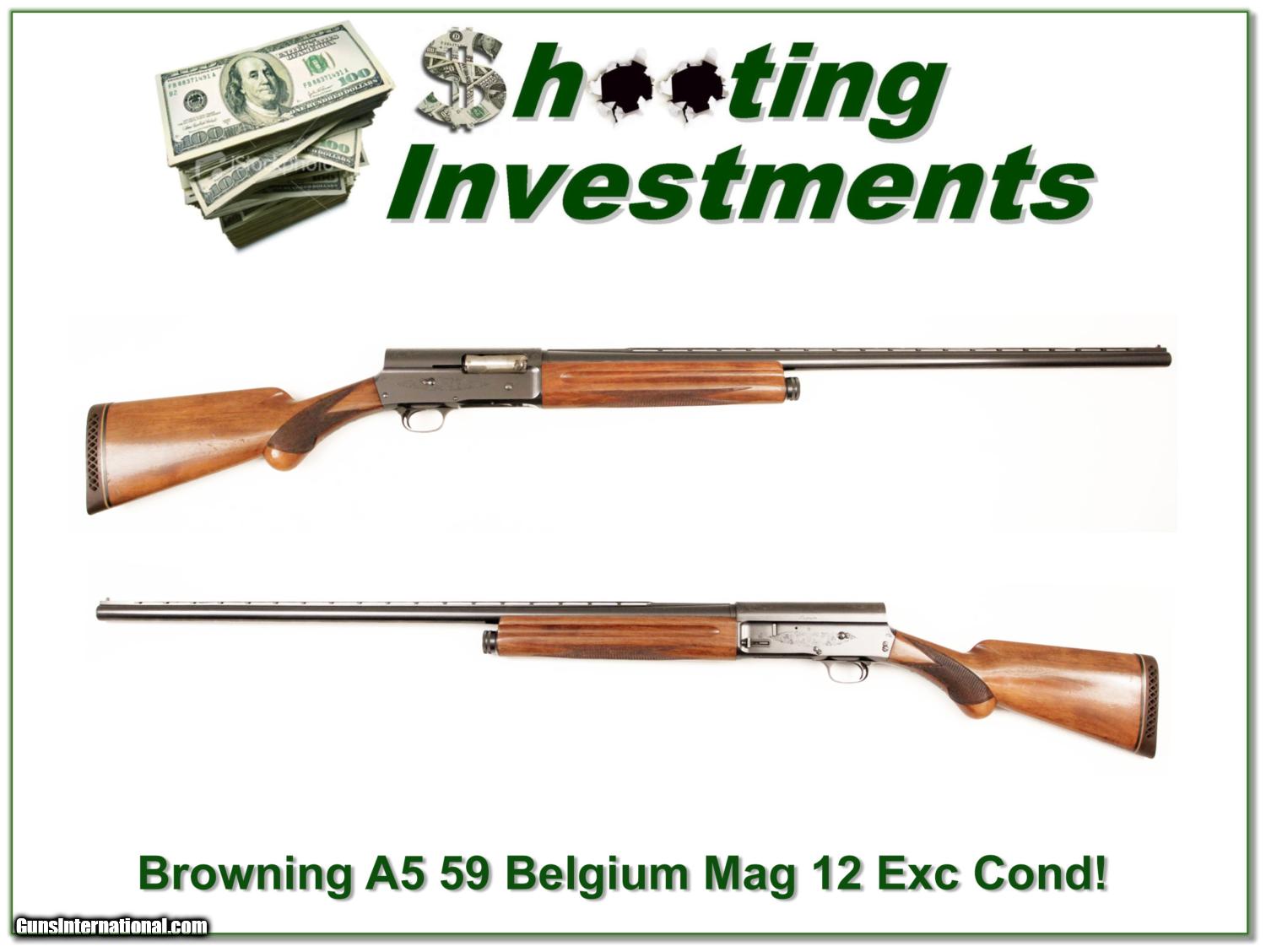 Description: This is an early Browning A5 12 magnum. These were introduced in 1958 and this one was made in 1959. Not many 50’s Magnum 12 A5’s are as nice as this one. The original rust blue is excellent with no rear edge wear. The original wood finished is also excellent with only a few minor marks. The barrel is a Vent Rib 32in with white bead. At some point it has a center bead. This A5 is a true Shooting Investment. You can expect it to increase in value over time. Shipping and insurance is $35 or $15 more if you want it shipped in a new Plano hard case. Please email me with any questions or larger pictures. (I now consign quality firearms only 10%! Let me know if you have any you would like to sell!) [16-0055] Payment: Payment is by Money Order, Cashiers Check or Personal Check. I can now also accept MasterCard and Visa with a 3% convenience fee. PayPal can be used for some items but never firearms. Please let us know if you would like to pay via PayPal. Shipping: The shipping charge will be listed in each description. It is $35 for most guns. Some heavy guns or those insured for over $2000 will be higher. Shipments to Alaska and Hawaii are higher because air shipment is required. Most firearms are shipped within 5 days of receipt of payment. We prefer shipping at the beginning of the week to avoid firearms in transit over weekends. We package all shipments carefully and insure them for the full purchase price, rounded up to the next $100. In the unlikely event that damage occurs, it is important that you save all packaging material for the claims process. Optics are shipped Priority Mail and most other non-firearm shipments are shipped First Class. Returns: Our return policy is simple. If for any reason you are not pleased with your purchase, you may return your item for a refund. The only exception is ammunition, it cannot be returned. It is important to us that you are happy. Guns cannot be fired or dissembled before returning them and must be returned in the same condition as received. Notification of a return must occur with-in 3 days of receipt at your dealer. Shipping, convenience and dealer fees are not refundable and are the responsibility of the buyer. Lay-a-way: If needed, we offer a 60 day lay-a-way option on most firearms. It is 1/3 now, 1/3 in 30 days and 1/3 in 60 days. Lay-a-way firearm sales are final. Consigning your firearms with Shooting Investments: We will help you get top dollar for your firearms. While most local guns shops charge 20% or more, our fee is only 10% with a minimum of $50. At your local gun shop it might take months to sell. Selling on-line provides instant access to thousands of interested buyers. You won’t find any other on-line dealer willing to sell your firearms for only 10% or listing every gun on 4 separate s. Selling through an House typically costs the seller 15% and the buyer an addition 15% (so 30%) and you have to wait several months to sell and longer to receive funds. If properly priced, we will sell your firearms in a week or two. Send us an email or give us a call and we’ll explain how easy it is for you to get top dollar. Trading: We collect guns and usually just trade for guns we want to add to our collections. We often sell guns for others wanting to purchase one of ours. We find this the most fair to both of us. Our Commission is only 10% and we hold the gun you want until yours sells. Please contact us if you want to sell one of yours to buy one of ours. Help for California Buyers: We are happy to ship to California. It is the buyer’s responsibility to make sure any item you buy is legal in your state. We are also happy to help with your purchase of a firearm from someone other than us. If you see a gun you would like to buy but the seller can’t or won’t ship to California we can help. You buy the gun and have it shipped to us. We’ll then ship it to your California dealer. The cost for this service is only $30 + shipping. Let me know if we can help! SOLD |