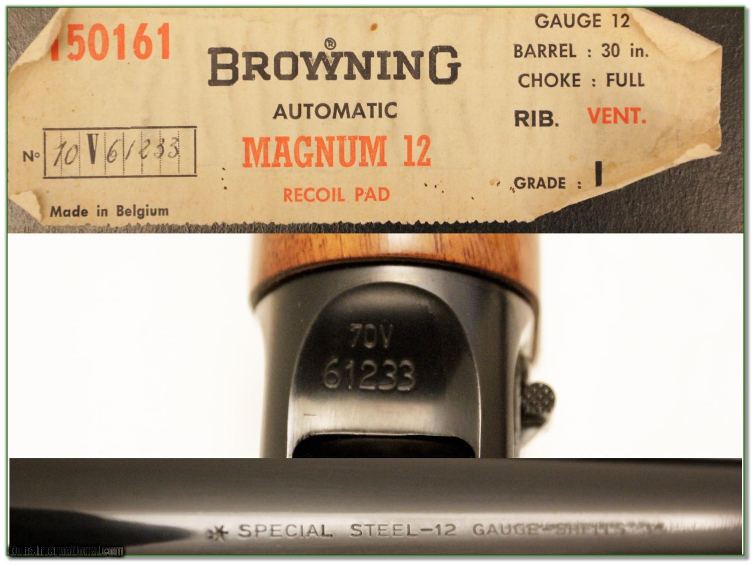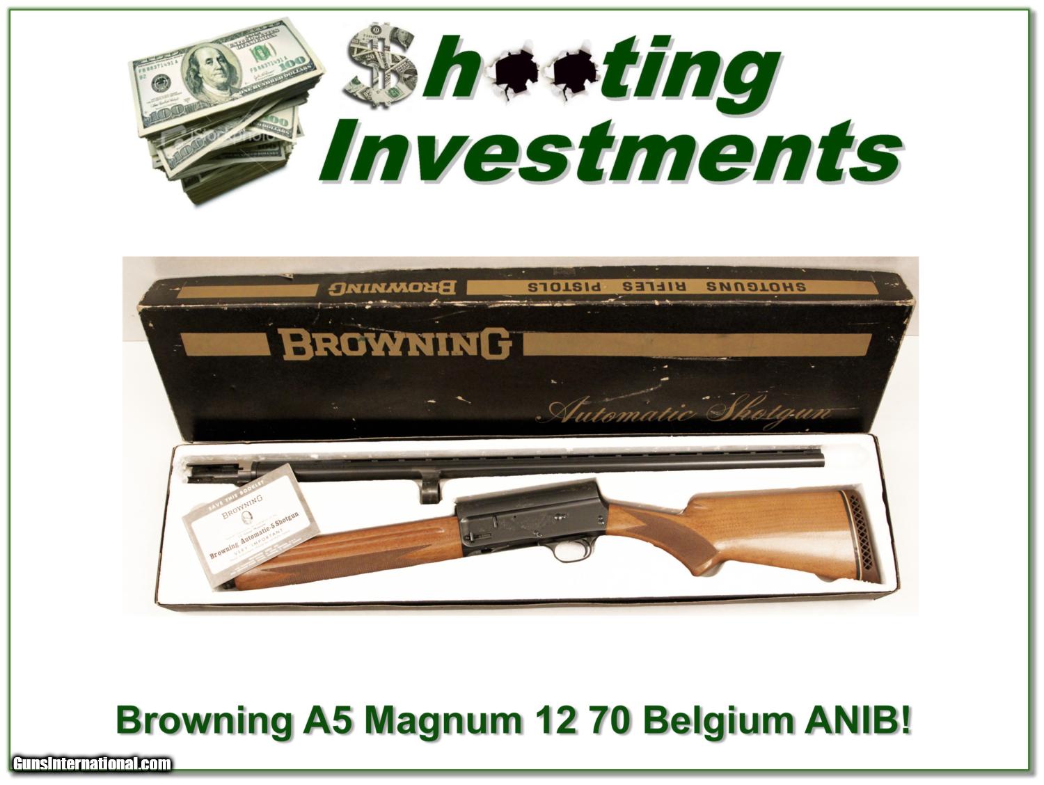 Description: Collectors, this is like new Browning A5 12 Magnum. It has honey blond wood and was made in Belgium in 1970. It comes in original box and has a 30in Vent Rib barrel. It may have fired a couple shells but I see no marks of note. It will make a nice addition to your collection and these are getting very hard to find this nice. Shipping and insurance is 30 or $18 more if you want it shipped in a new Plano hard case. Please email me with any questions or larger pictures. (I now consign quality firearms only 10%! Let me know if you have any you would like to sell!) [15-0790] Payment: Payment is by Money Order, Cashiers Check or Personal Check. I can now also accept MasterCard and Visa with a 3% convenience fee. PayPal can be used for some items but never firearms. Please let us know if you would like to pay via PayPal. Shipping: The shipping charge will be listed in each description. It is $30 for most guns. Some heavy guns or those insured for over $2000 may be higher. Shipments to Alaska and Hawaii are higher because air shipment is required. Most firearms are shipped within 5 days of receipt of payment. We prefer shipping at the beginning of the week to avoid firearms in transit over weekends. We package all shipments carefully and insure them for the full purchase price, rounded up to the next $100. In the unlikely event that damage occurs, it is important that you save all packaging material for the claims process. Optics are shipped Priority Mail and most other non-firearm shipments are shipped First Class. Returns: Our return policy is simple. If for any reason you are not pleased with your purchase, you may return your item for a refund. The only exception is ammunition, it cannot be returned. It is important to us that you are happy. Guns cannot be fired or dissembled before returning them and must be returned in the same condition as received. Notification of a return must occur with-in 3 days of receipt at your dealer. Shipping, convenience and dealer fees are not refundable and are the responsibility of the buyer. Lay-a-way: If needed, we offer a 60 day lay-a-way option on most firearms. It is 1/3 now, 1/3 in 30 days and 1/3 in 60 days. Lay-a-way firearm sales are final. Consigning your firearms with Shooting Investments: We will help you get top dollar for your firearms. While most local guns shops charge 20% or more, our fee is only 10% with a minimum of $50. At your local gun shop it might take months to sell. Selling on-line provides instant access to thousands of interested buyers. You won’t find any other on-line dealer willing to sell your firearms for only 10% or listing every gun on 4 separate s. Selling through an House typically costs the seller 15% and the buyer an addition 15% (so 30%) and you have to wait several months to sell and longer to receive funds. If properly priced, we will sell your firearms in a week or two. Send us an email or give us a call and we’ll explain how easy it is for you to get top dollar. Trading: We collect guns and usually just trade for guns we want to add to our collections. We often sell guns for others wanting to purchase one of ours. We find this the most fair to both of us. Our Commission is only 10% and we hold the gun you want until yours sells. Please contact us if you want to sell one of yours to buy one of ours. Help for California Buyers: We are happy to ship to California. It is the buyer’s responsibility to make sure any item you buy is legal in your state. We are also happy to help with your purchase of a firearm from someone other than us. If you see a gun you would like to buy but the seller can’t or won’t ship to California we can help. You buy the gun and have it shipped to us. We’ll then ship it to your California dealer. The cost for this service is only $30 + shipping. Let me know if we can help! SOLD |
