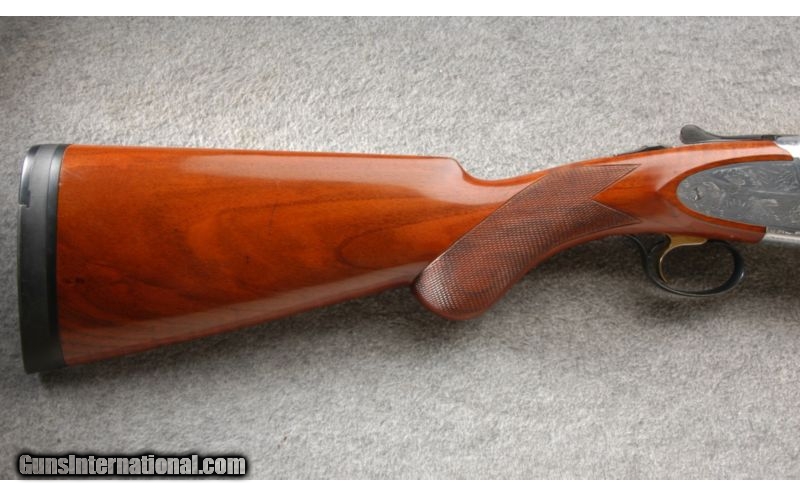 Description: This shotgun is signed by engraver Bottega G. Giortanelli. This shotgun shows some but not a lot of use. The metal is in excellent condition and the wood has a few small field marks. The shotgun locks up tight. SOLD Caliber Info: 12 Gauge. Chambers: 3 Inch Over/Under with ejectors. Metal Condition: Excellent. Wood Condition: Very nice with small field marks. Bore Condition: Bright and shiny. Barrels: 28 inch bright blue with a vent rib. Triggers: Single gold color. Stock: Very nice walnut with a checkered round knob. Stock Dimensions: 14 1/8 inch LOP. Fore End: Matching checkered walnut. Butt Pad: Black Decelerator butt pad. Weight: 7 Lbs 5 Oz. Sights: Single front brass bead on the vent rib. Chokes: Screw in, comes with a IC and CYL. Extras: Comes with a hard case. Item Location: Owatonna, MN |