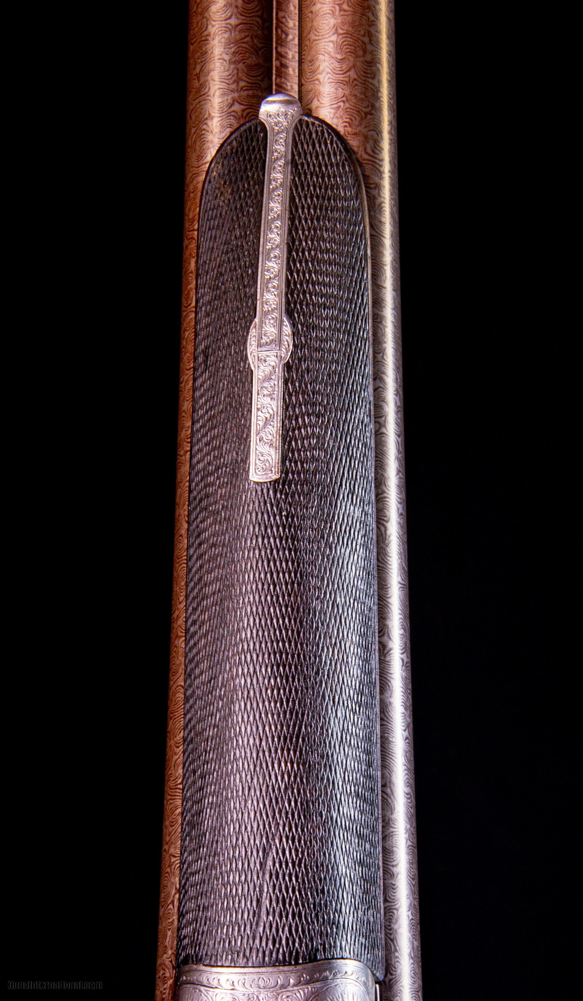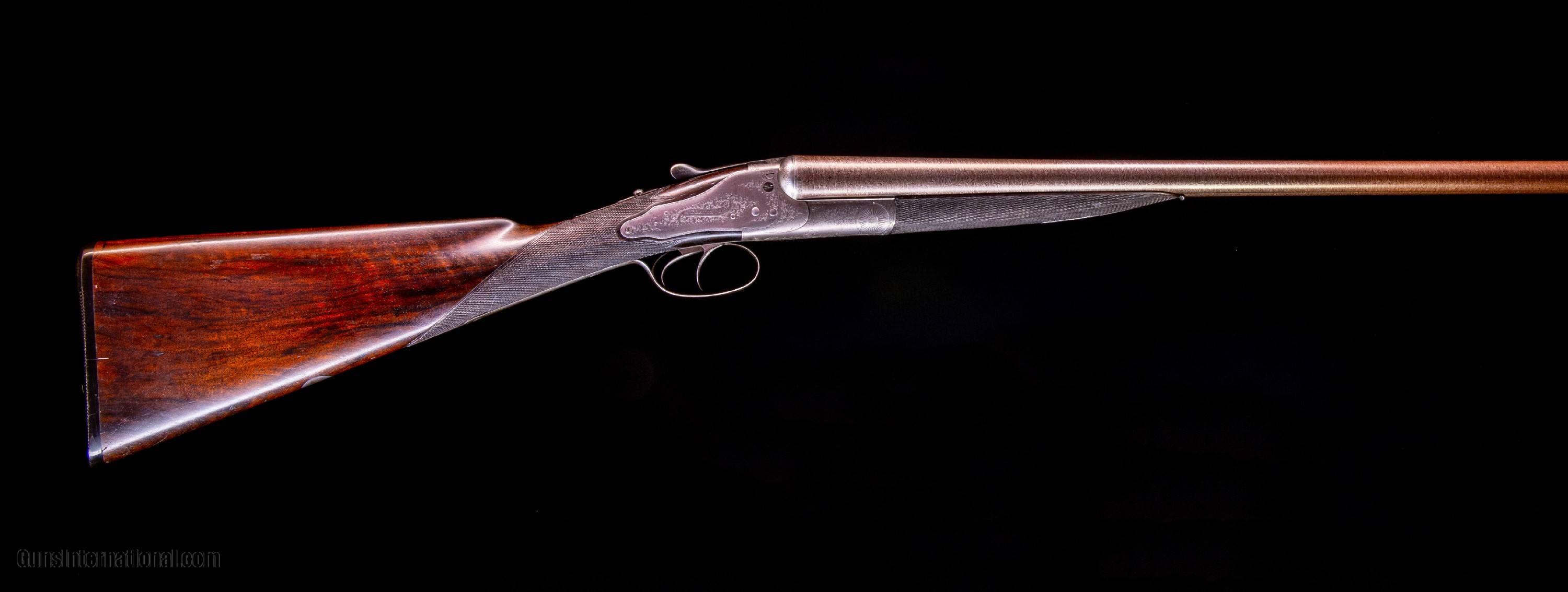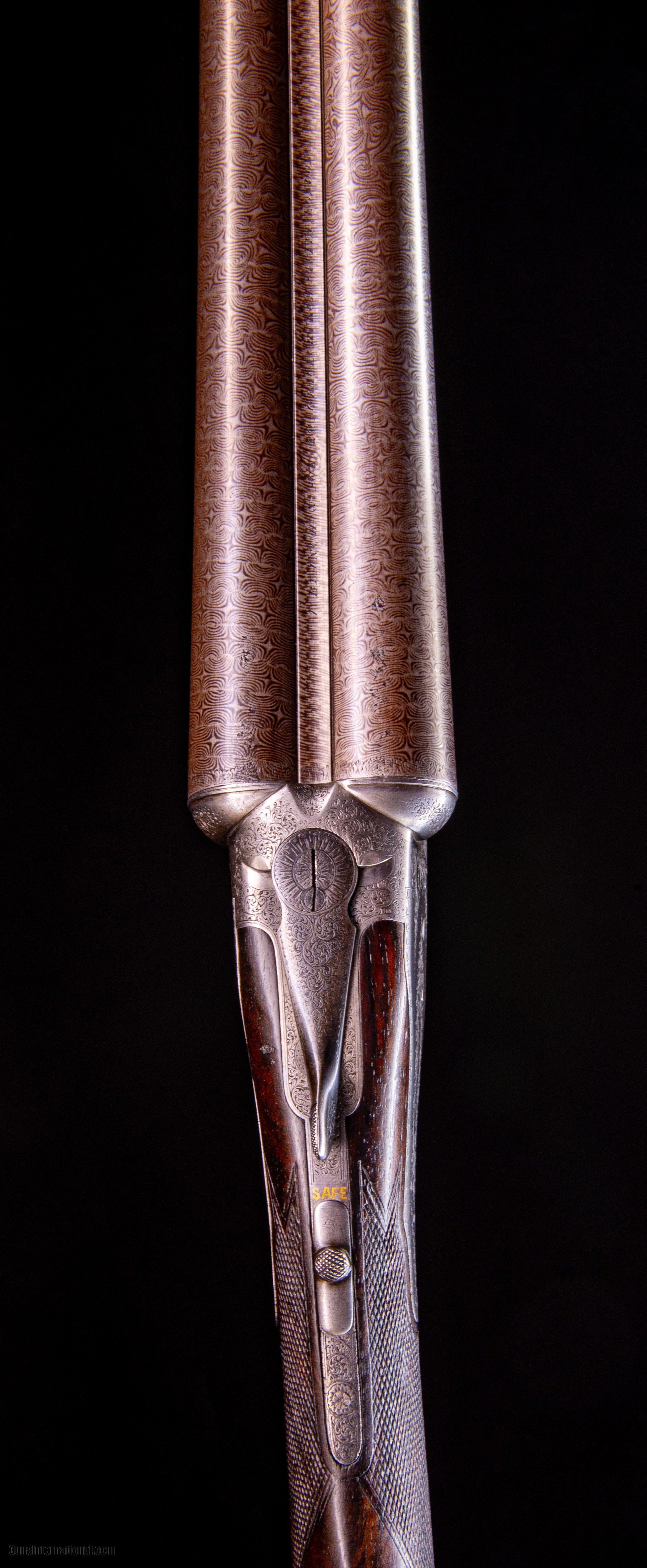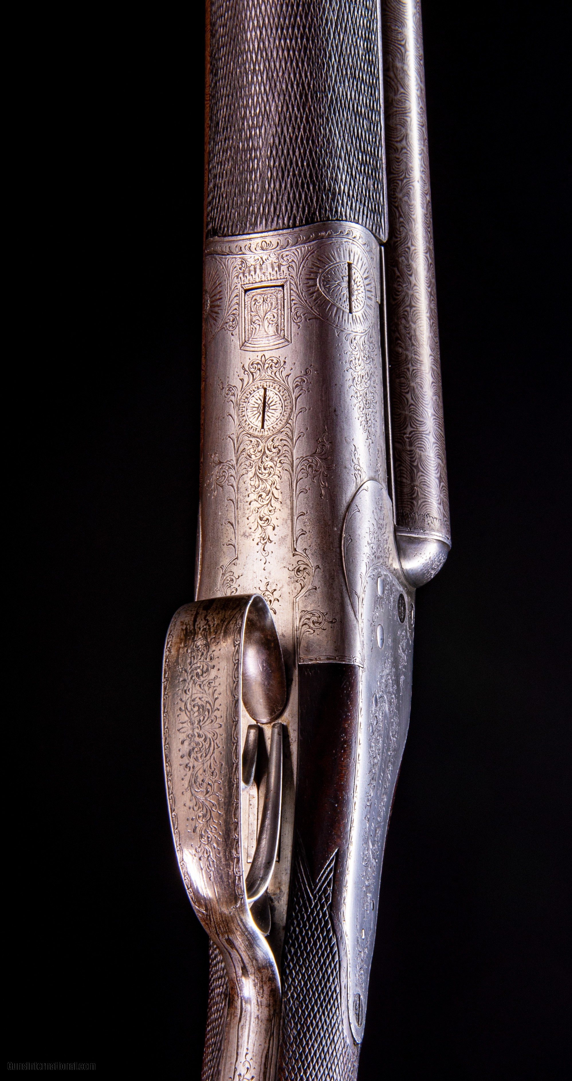 An excellent example of a hammerless, damascus barreled London gun. *** Note: To see this gun with high resolution photos and a zoom-in feature, go to the vintagedoubles main site and search for the gun ID: 5981 or browse the main site to see our full gun collection.
