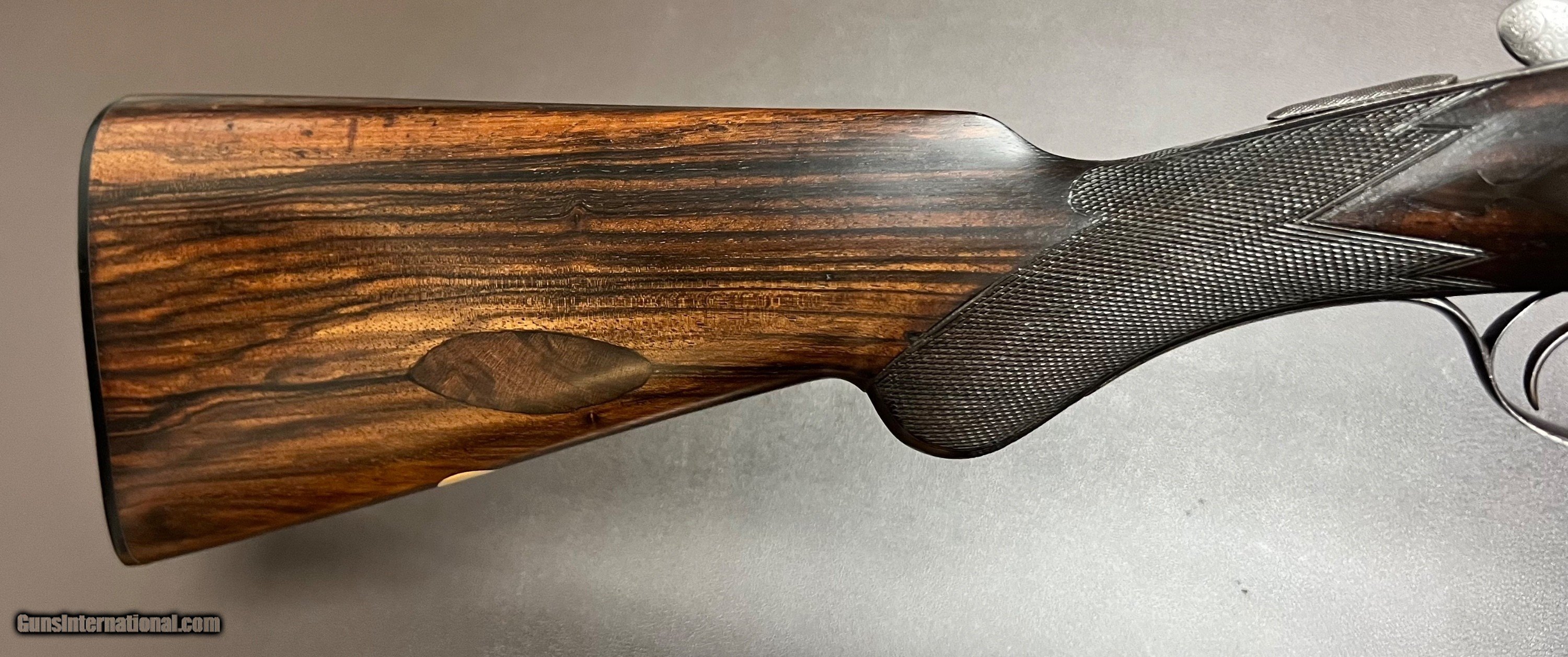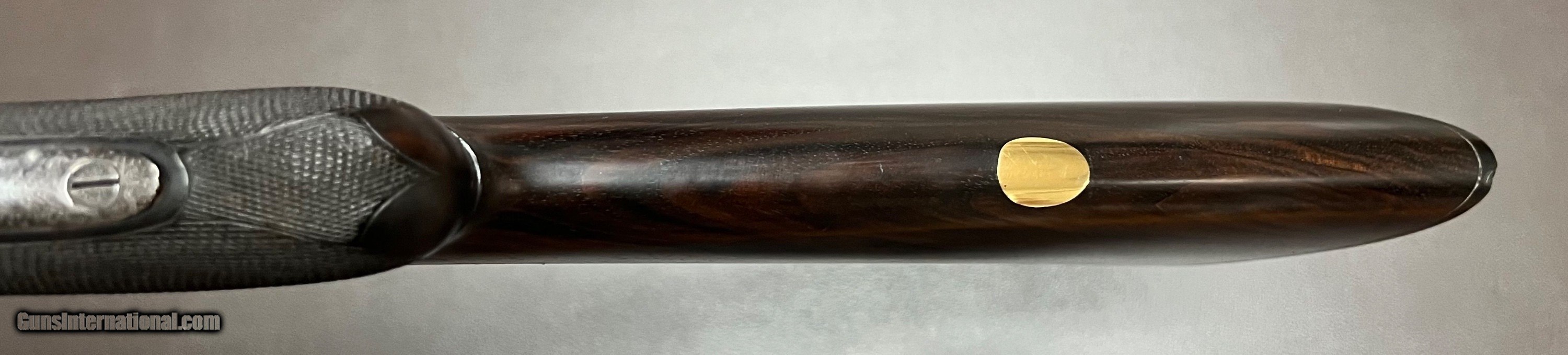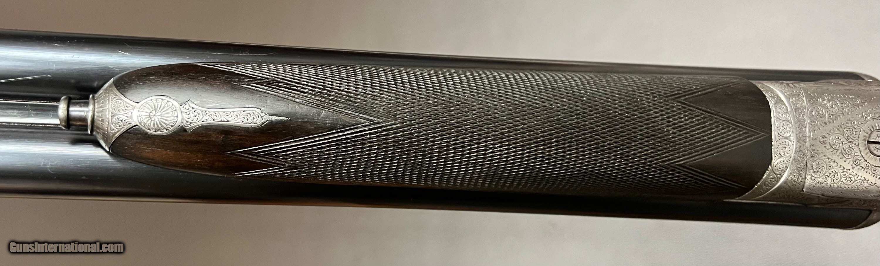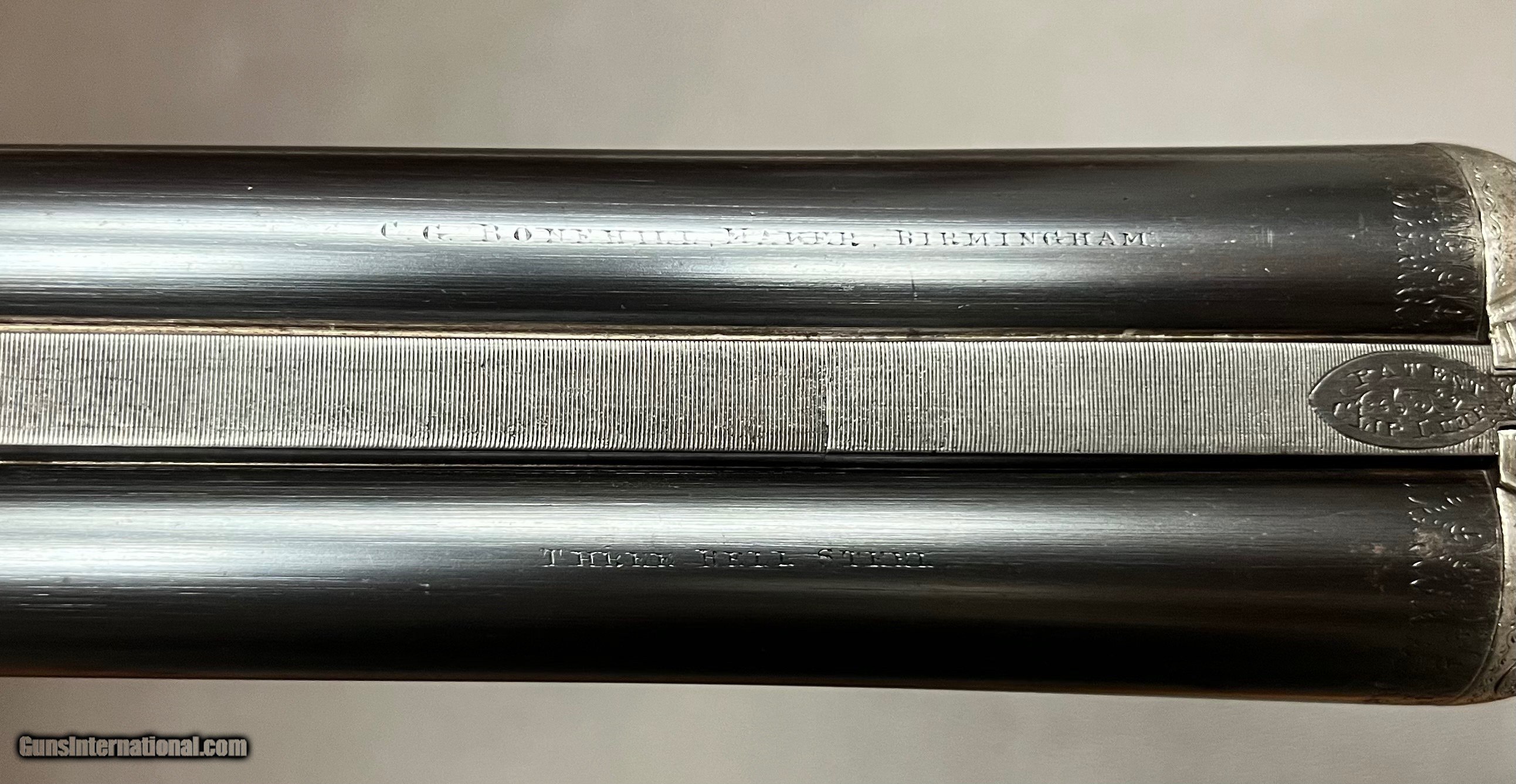 Description: C.G. Bonehill "patent clip lump" 16GA best boxlock ejector 30" ejector (Three Bell Steel) flat hand filed rib barrels with single front bead 2 1/2" nitro proof Chokes: .008/.025 IC/IM Bore measurements: .671/.674 Proofed at .669/.669 well within proof specs Minimum wall thickness R:0.026 L:0.027 Lockup is tight, no movement with forend removed Bores are bright & clean Disc set strikers Ejectors are well timed Crisp trigger pulls Figured Prince of wales stock with splinter forend LOP 14" over Bonehill trademark horn buttplate DAC 1 5/8 DAH 2 3/8 Cast off 3/8" at heel 6lbs 11oz balance point 1" in front of the hinge pin Built in 1897 Fine condition Bonehill "patent clip lump" best boxlock ejector 16ga. Nicely shaped rounded bar action with full coverage rose & scroll engraving and beaded fences, wood is in excellent condition with deluxe checkering & horn inlays behind checkered panels. Heavier set of barrels with really nice tapered hand filed pigeon type rib, barrels do have light handling marks. Classic long barreled 16ga English double that is perfectly setup for game or clays. This gun is an Antique and can be shipped directly. Antique: Yes Shotgun Gauge: 16 Gauge Price: $2,750.00 Buy Now Contact Seller |