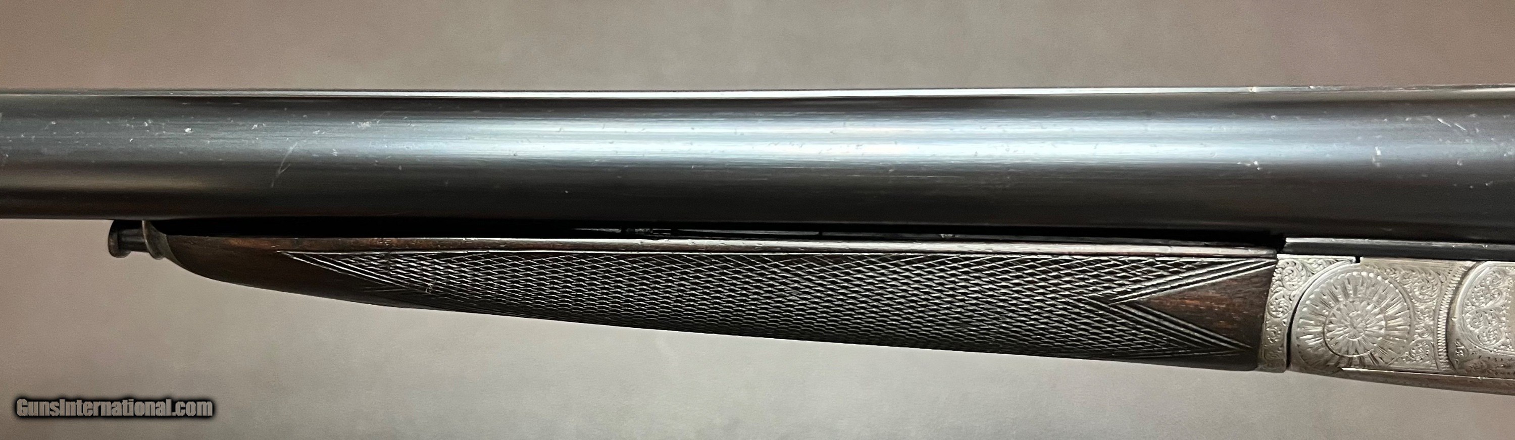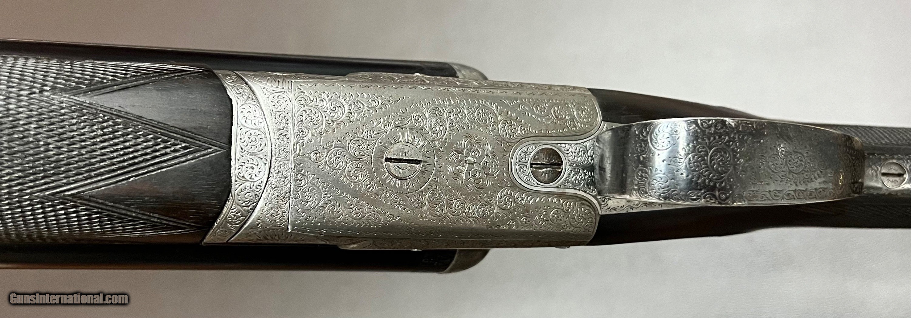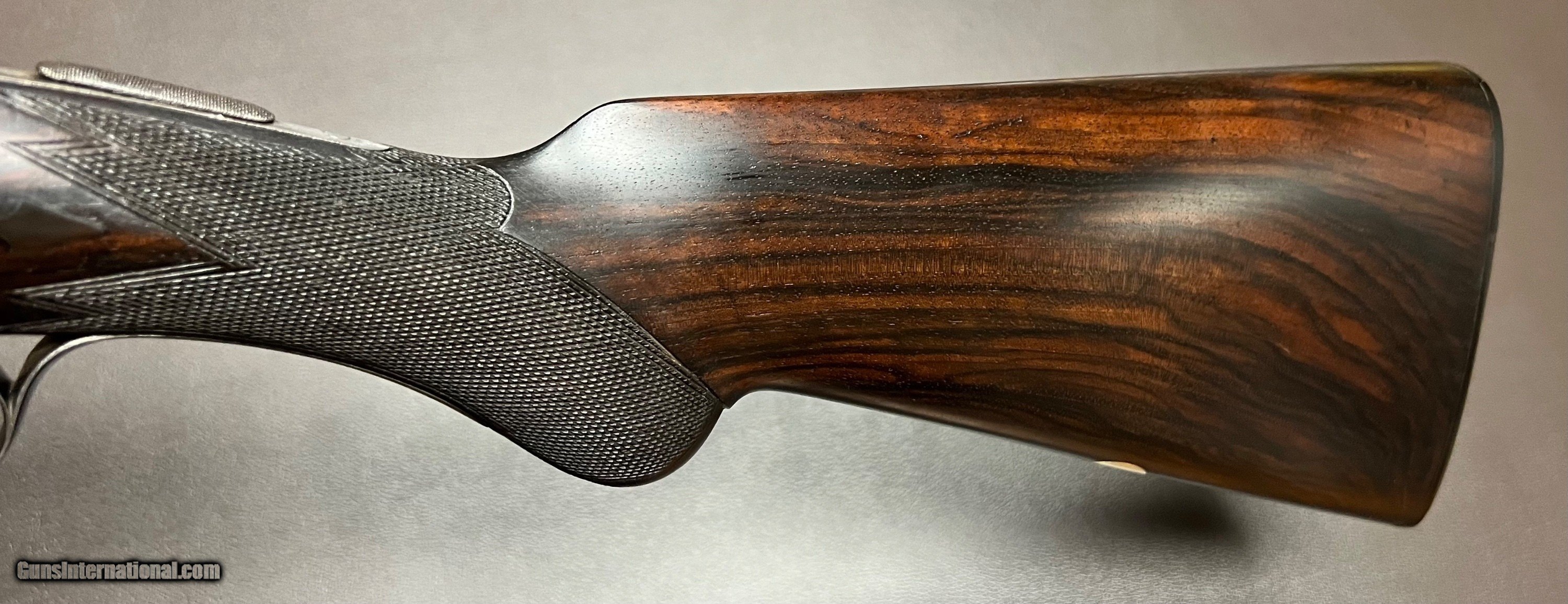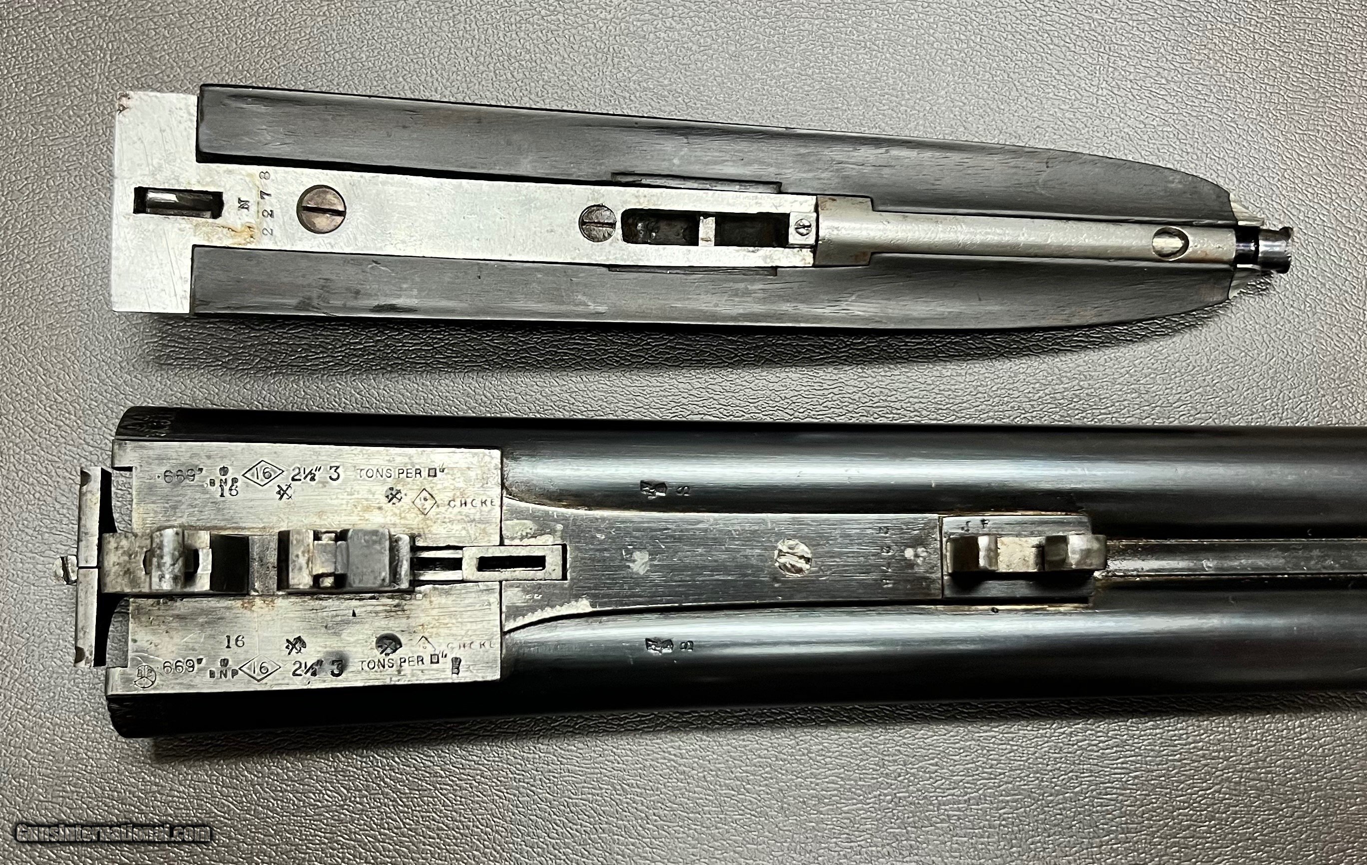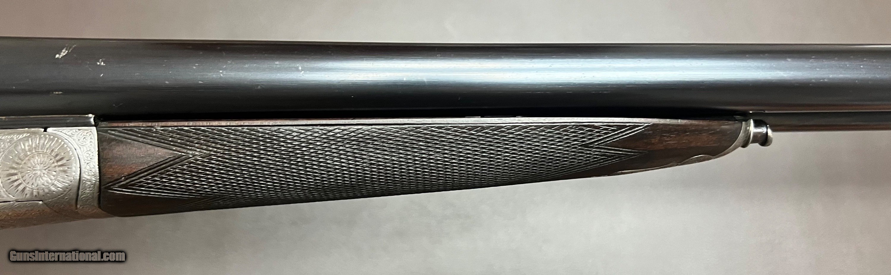 Description: C.G. Bonehill "patent clip lump" 16GA best boxlock ejector 30" ejector (Three Bell Steel) flat hand filed rib barrels with single front bead 2 1/2" nitro proof Chokes: .008/.025 IC/IM Bore measurements: .671/.674 Proofed at .669/.669 well within proof specs Minimum wall thickness R:0.026 L:0.027 Lockup is tight, no movement with forend removed Bores are bright & clean Disc set strikers Ejectors are well timed Crisp trigger pulls Figured Prince of wales stock with splinter forend LOP 14" over Bonehill trademark horn buttplate DAC 1 5/8 DAH 2 3/8 Cast off 3/8" at heel 6lbs 11oz balance point 1" in front of the hinge pin Built in 1897 Fine condition Bonehill "patent clip lump" best boxlock ejector 16ga. Nicely shaped rounded bar action with full coverage rose & scroll engraving and beaded fences, wood is in excellent condition with deluxe checkering & horn inlays behind checkered panels. Heavier set of barrels with really nice tapered hand filed pigeon type rib, barrels do have light handling marks. Classic long barreled 16ga English double that is perfectly setup for game or clays. This gun is an Antique and can be shipped directly. Antique: Yes Shotgun Gauge: 16 Gauge Price: $2,750.00 Buy Now Contact Seller |