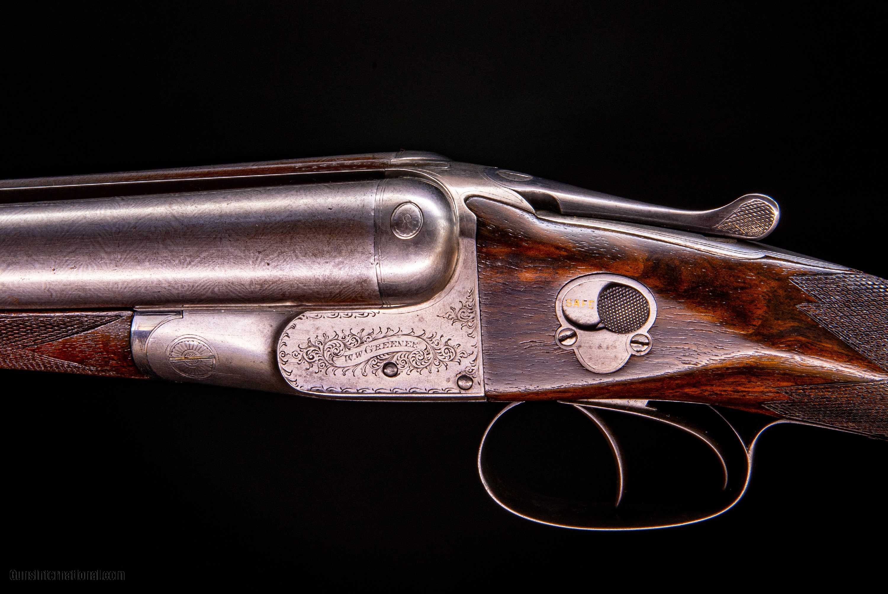 Description: Boxlocks - Antique damascus barreled W.W. Greener from 1892 featuring the Greener\'s Treble Wedge Fast lock-up and the distinctive side safety. Addressed to their \'St Mary\'s Square, Birmingham\' premises and proudly inscribed \'Winner at All Gun Trials 1875 to 1891\'. The barrels are surprisingly good for 133 years old. Some of the brown has been worn, but the bores are good and the walls plenty thick. Choked for traditional English high pheasant shooting. The new owner will need to have a new butt plate or pad fitted. We can recommend a great gunsmith for this.