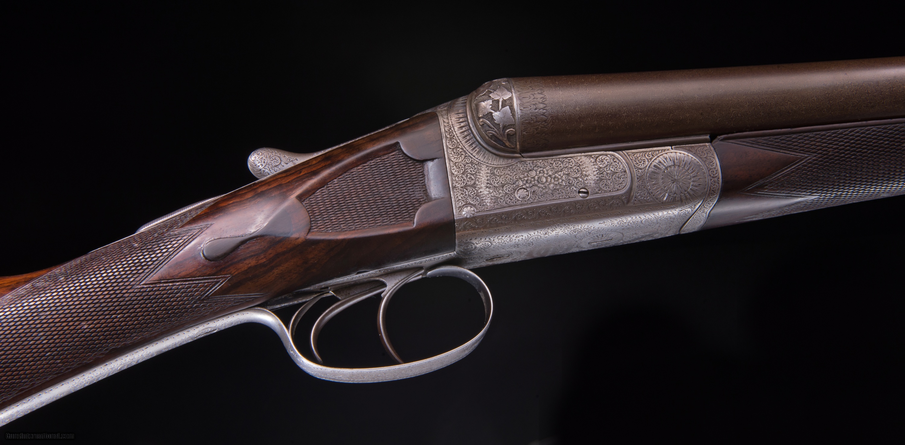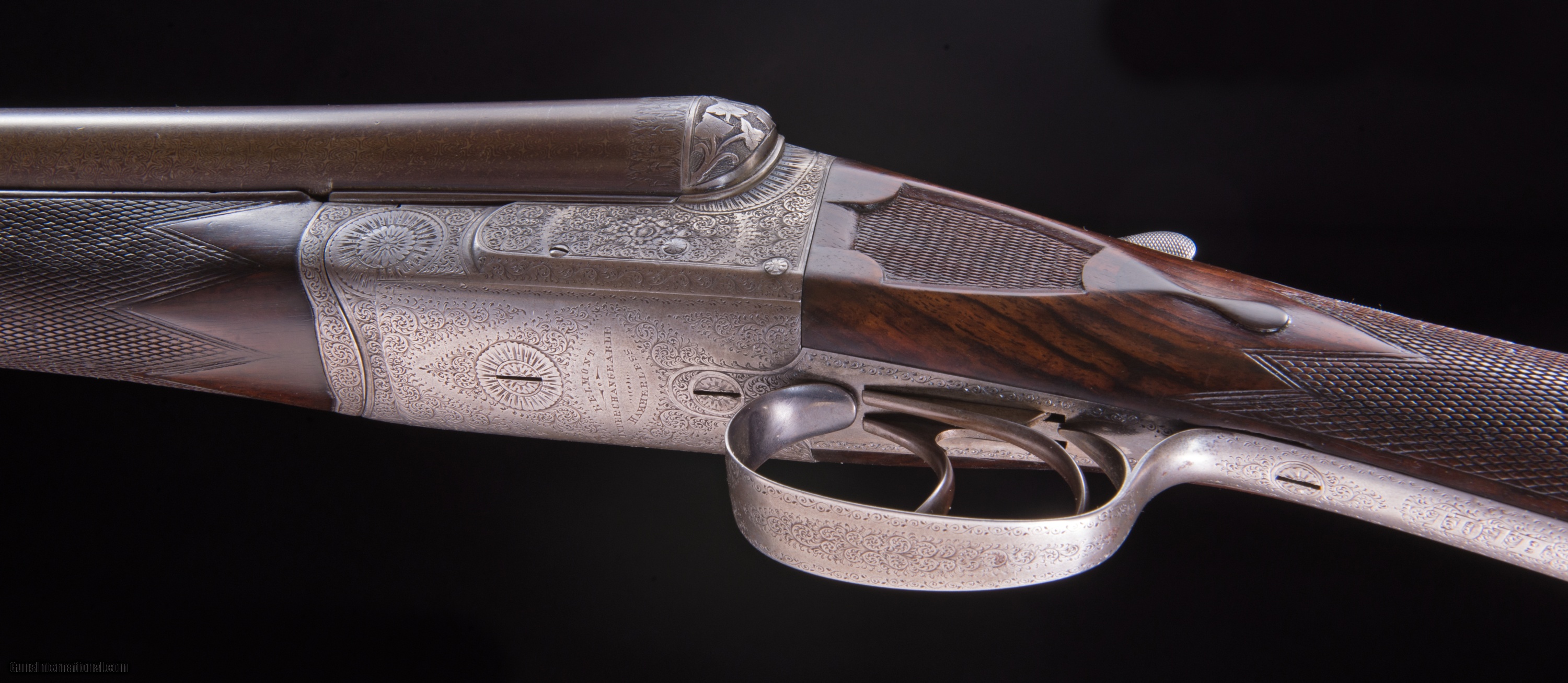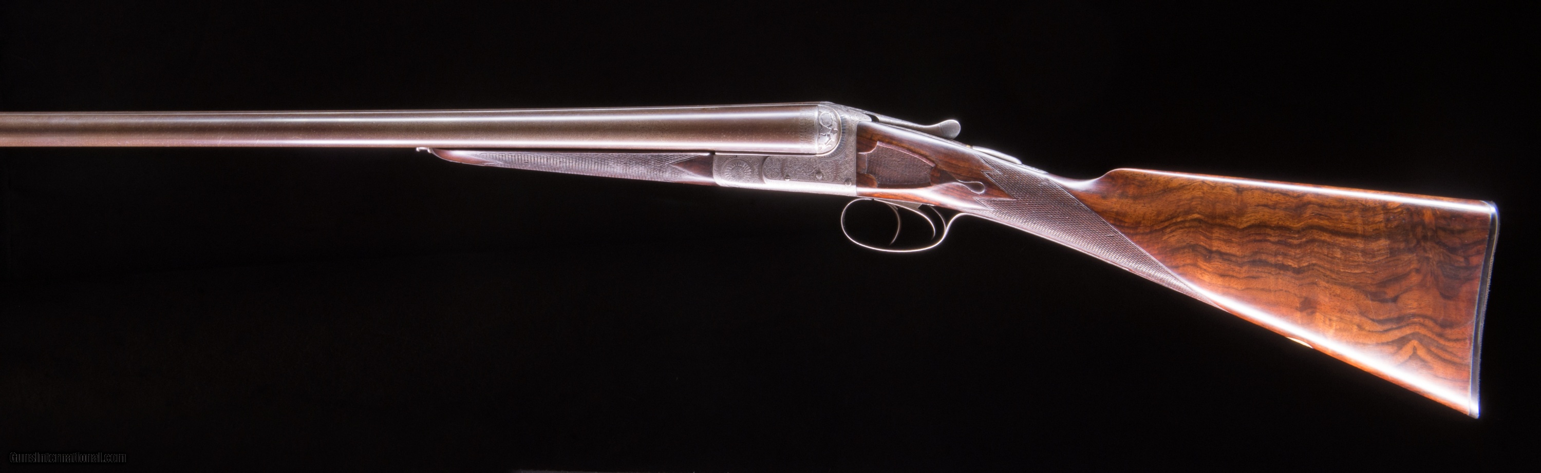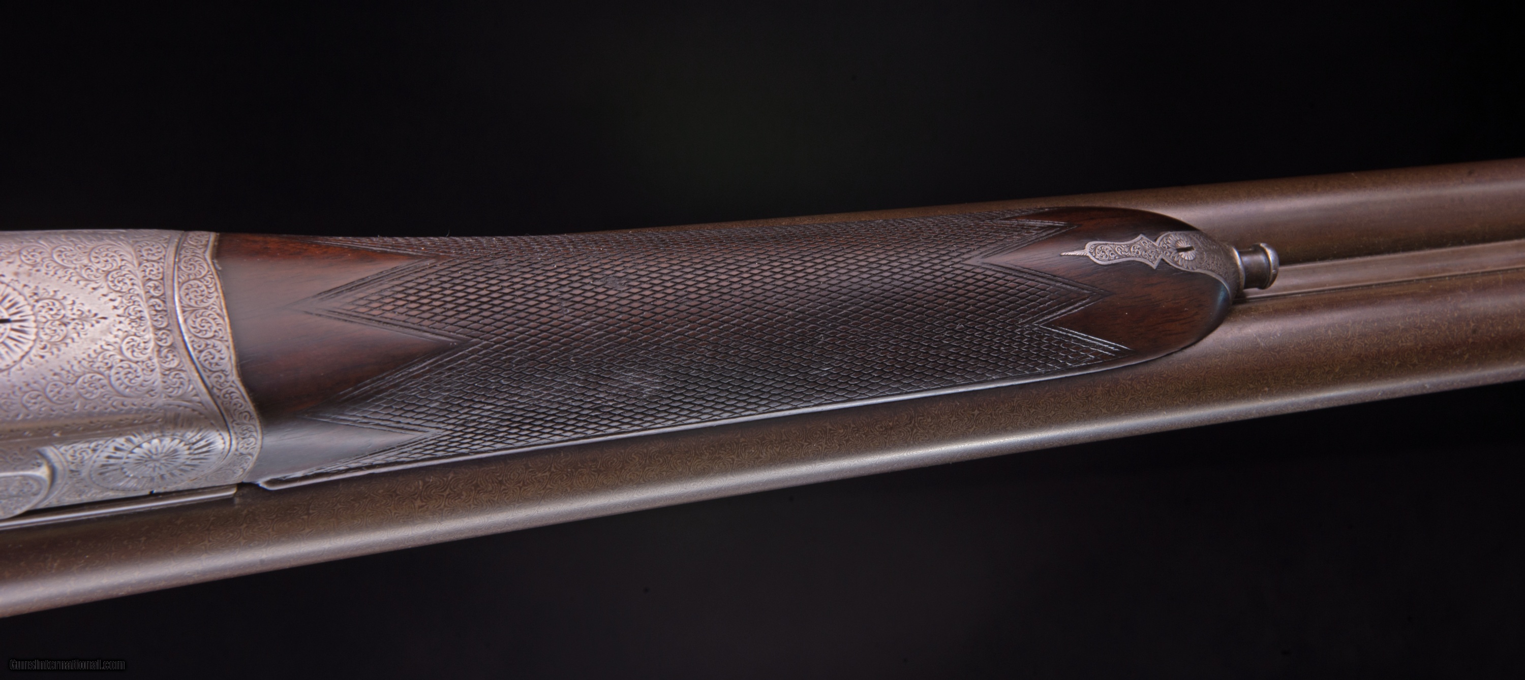 Description: Boxlocks - This is one sweet gun. I absolutely love the marbled and quarter sawn French walnut, the stunning engraving, and the beautiful Damascus. I actually see nothing here not to like! The gun it appears was built by C.G. Bonehill for Dixon in the early 1890\'s as it features the Bonehill " Belmont Interchangeable" name and has their initials on the original butt plate.