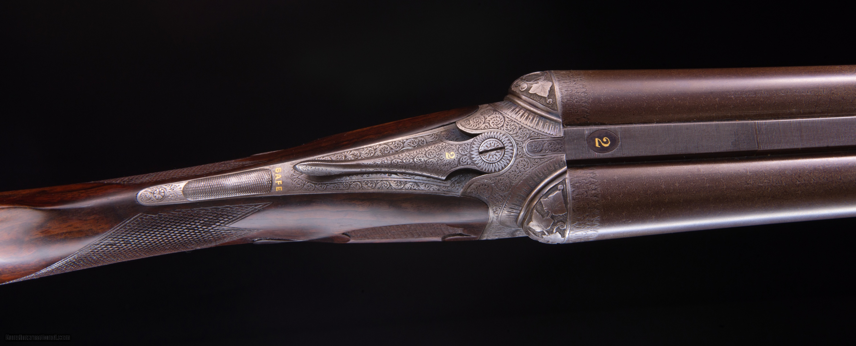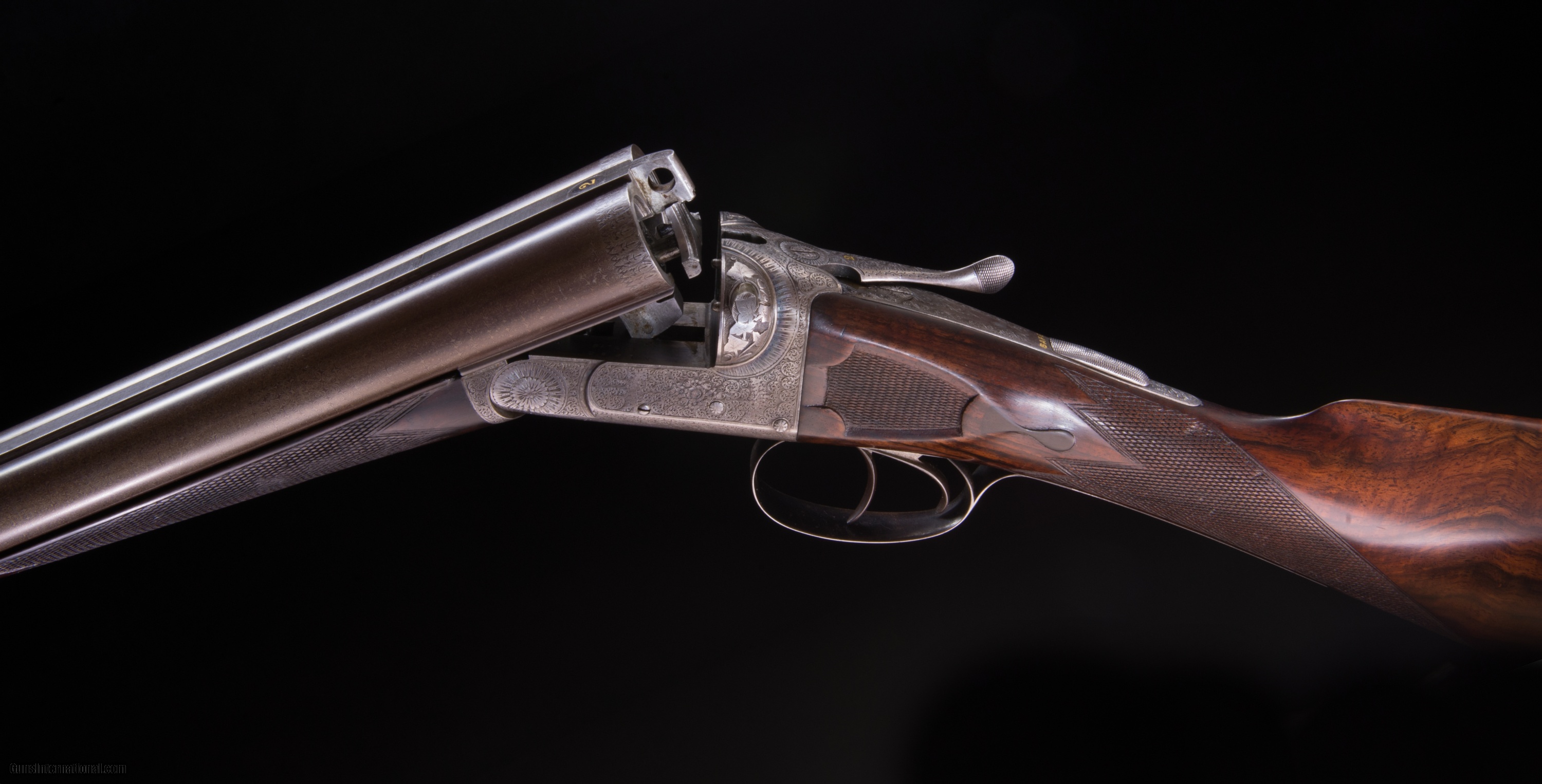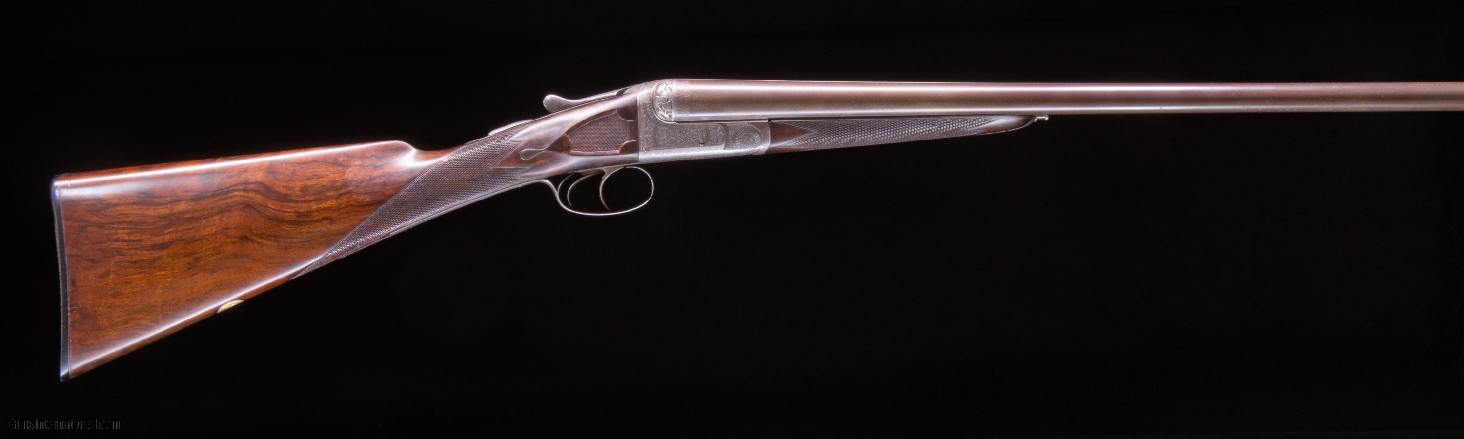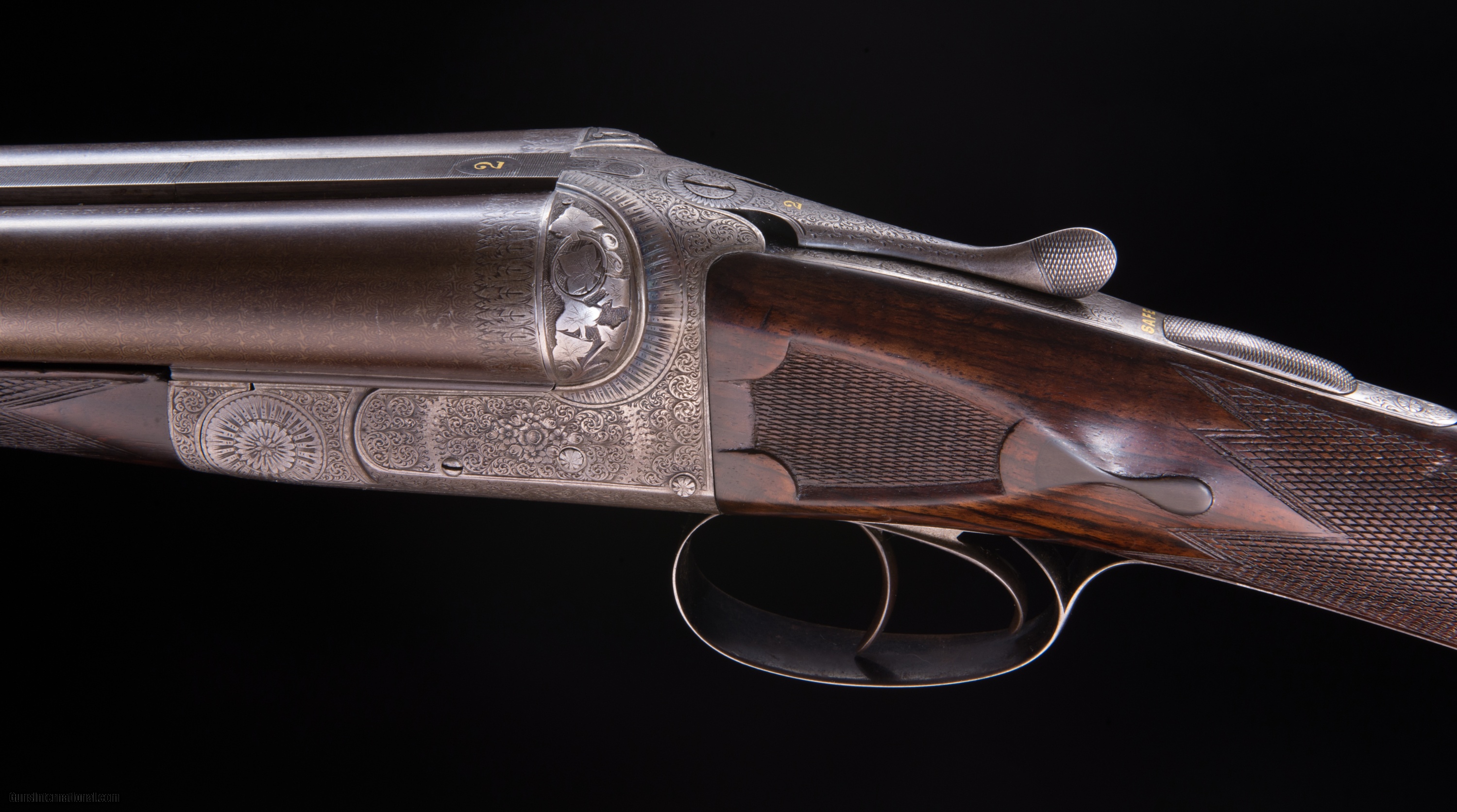 Description: Boxlocks - This is one sweet gun. I absolutely love the marbled and quarter sawn French walnut, the stunning engraving, and the beautiful Damascus. I actually see nothing here not to like! The gun it appears was built by C.G. Bonehill for Dixon in the early 1890\'s as it features the Bonehill " Belmont Interchangeable" name and has their initials on the original butt plate.