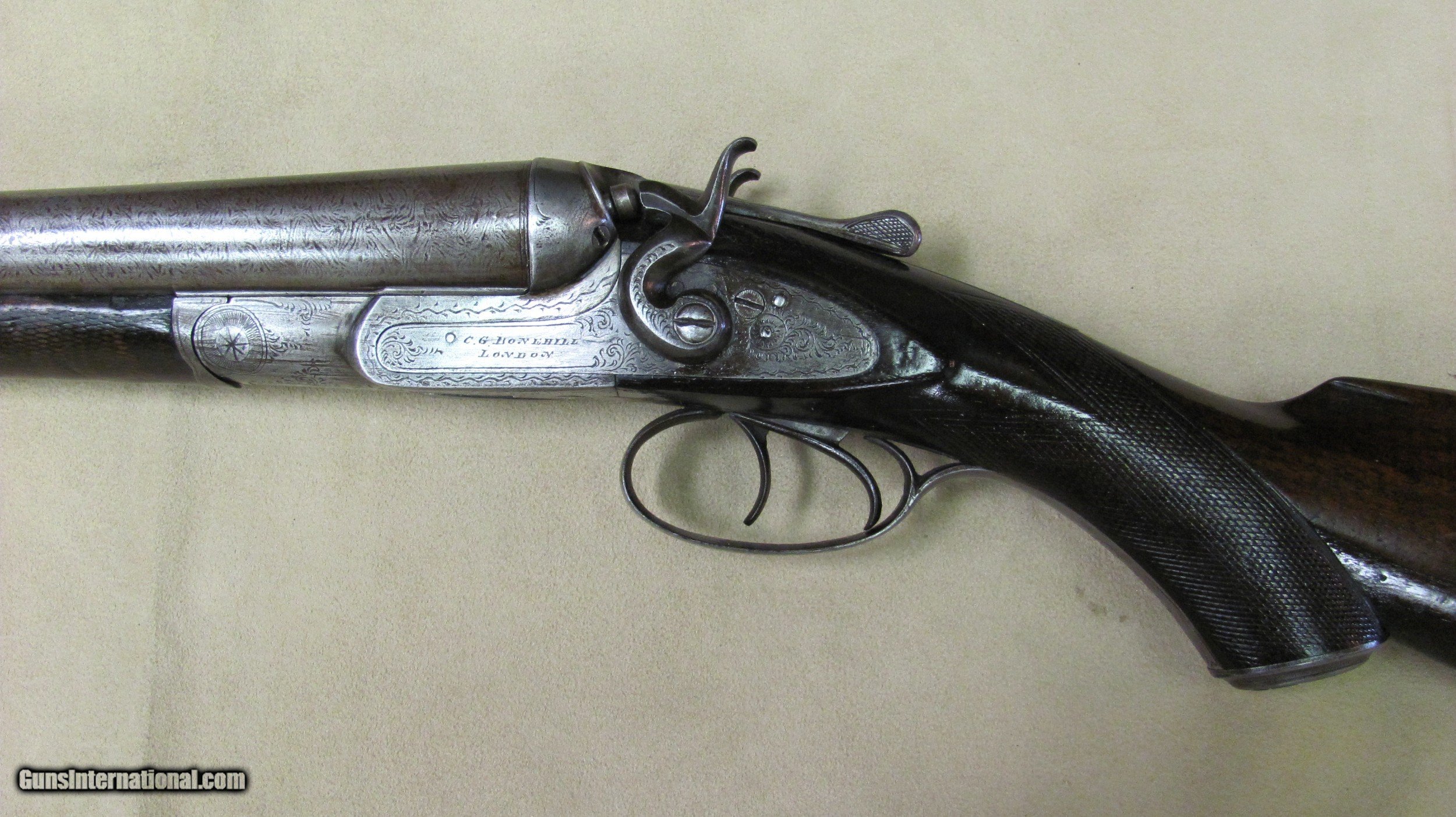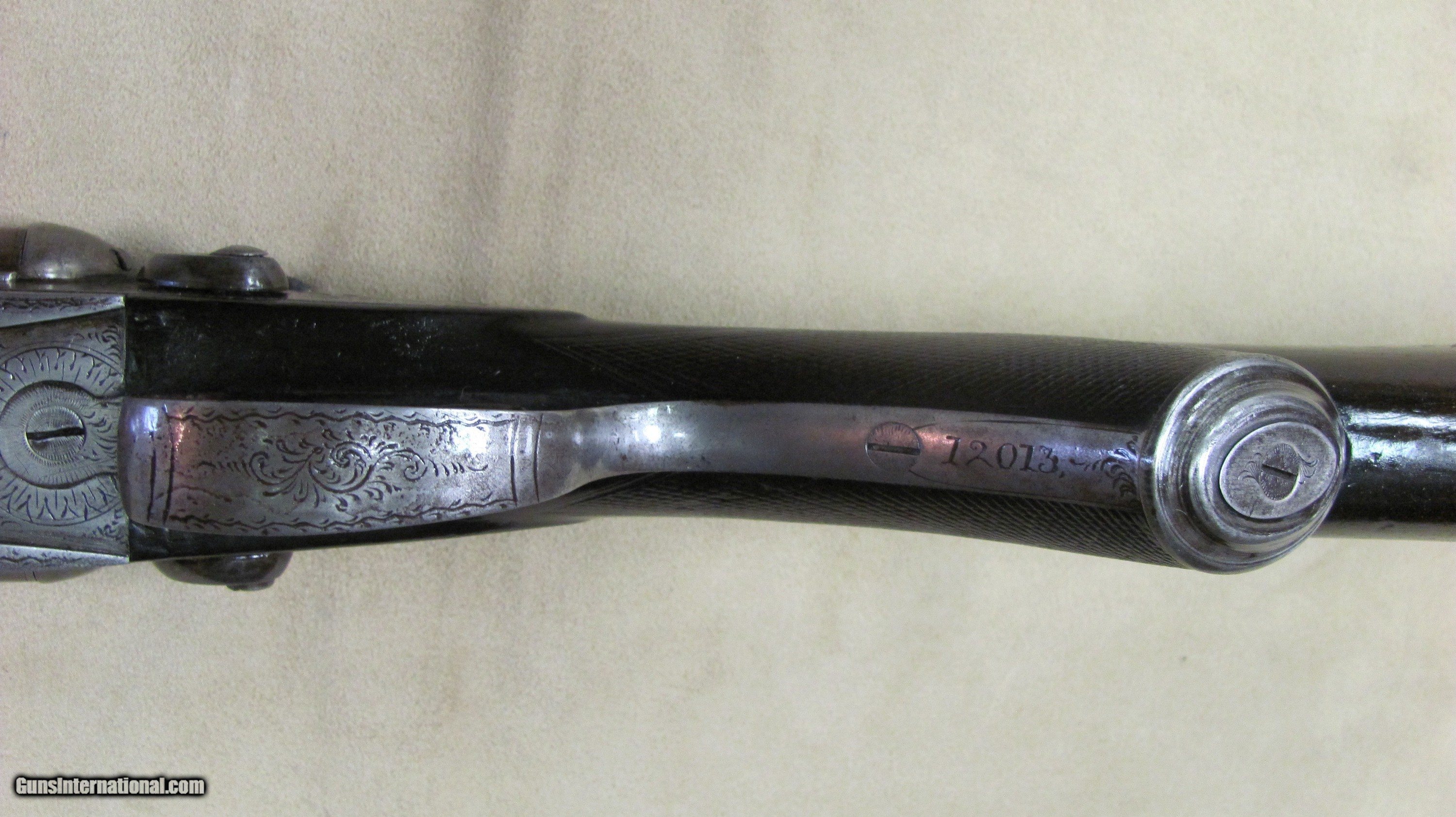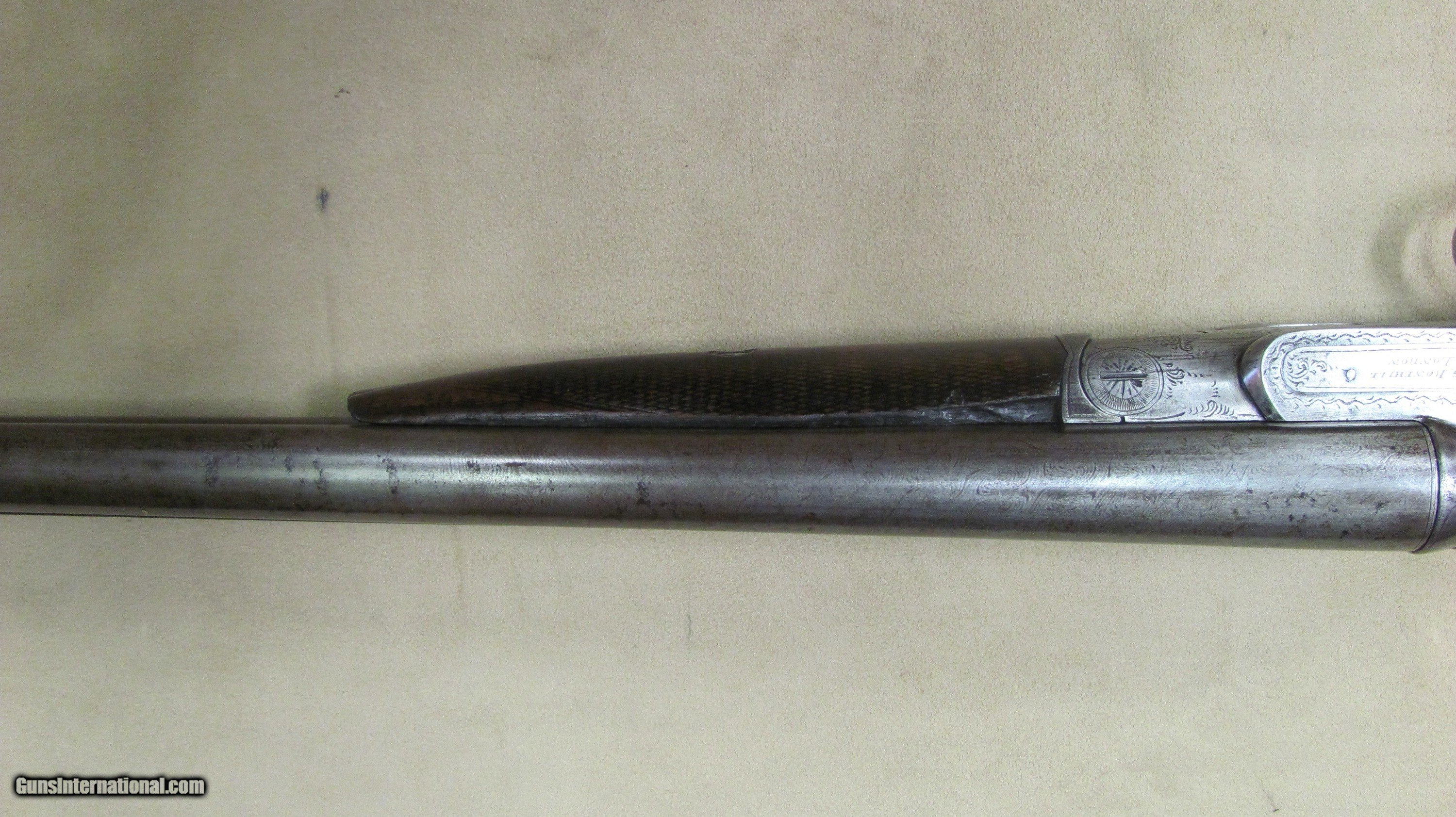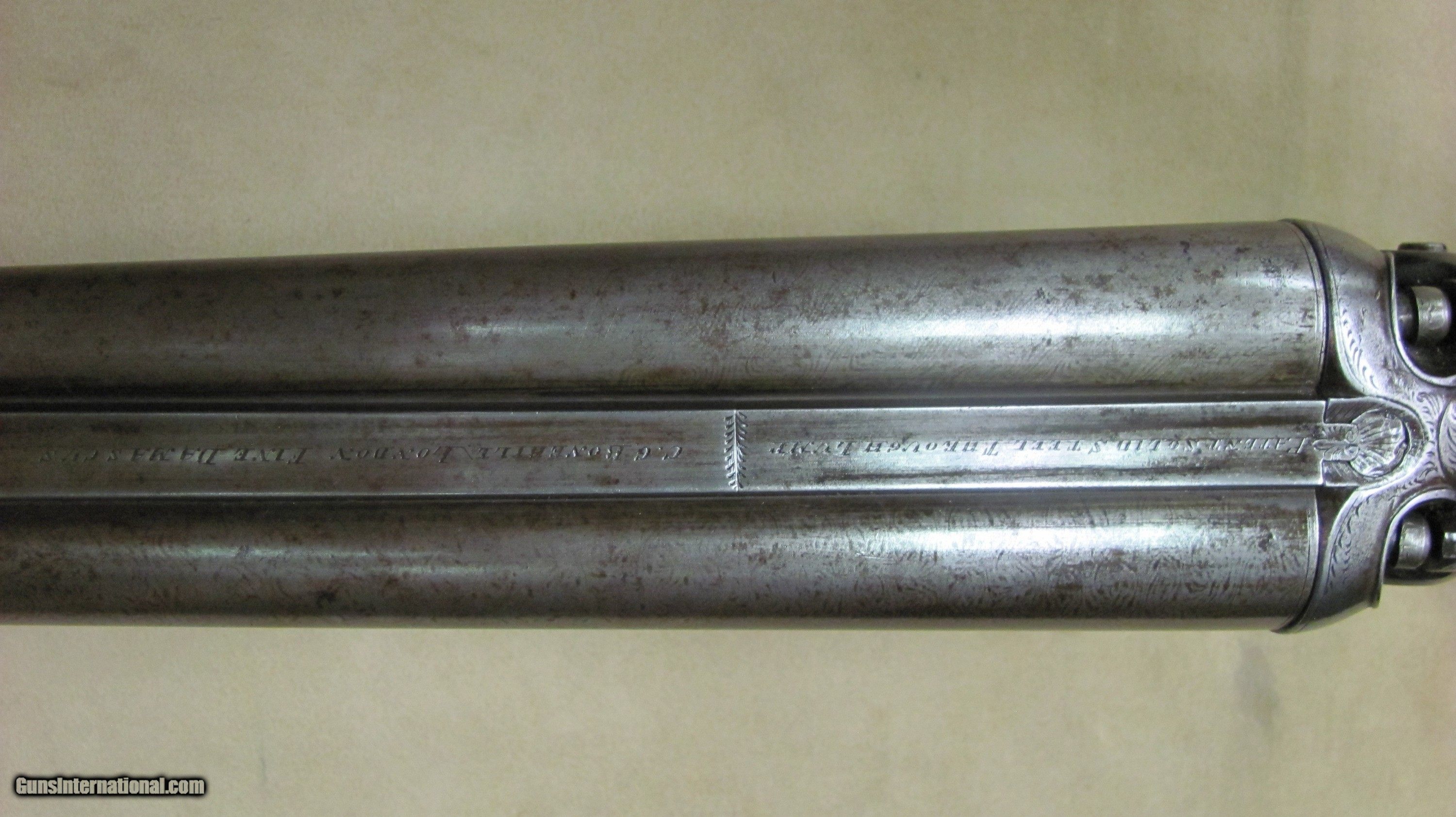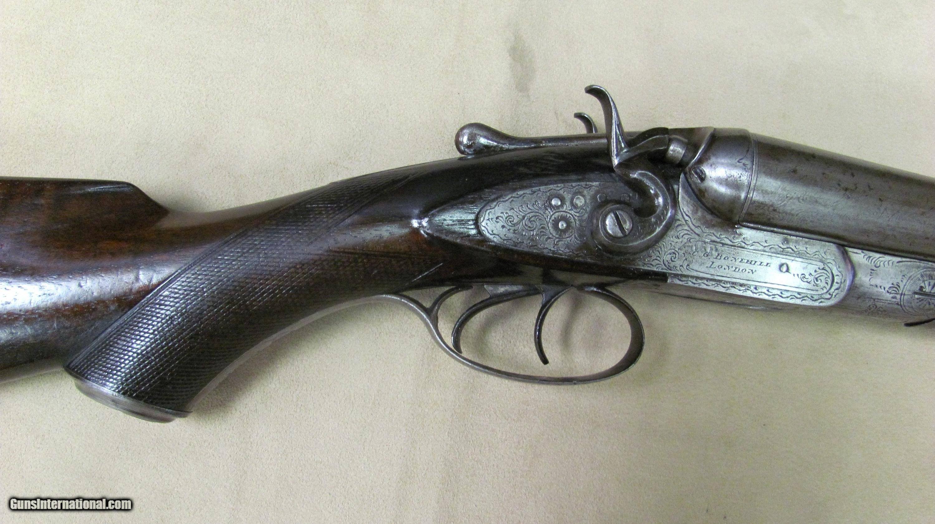Description: C. G. Bonehill 10 gauge double barrel hammer shotgun with 32" Damascus barrels that have very good bores with minor pitting. Beautifully engraved receiver and heel and toe buttplate. Great condition for this antique English 10 gauge double. SOLD Antique: Yes Shotgun Gauge: 10 Gauge Manufacturer: C. G. Bonehill (English) Model: High Grade Double Serial Number: 12013 Barrel Length: 32 Inches Chambers: 3.0 Inches Ejectors: No Condition: Very good Metal Condition: Very Good Wood Condition: Very Good Bore Condition: Very Good Barrels: Damascus Barrel Type: Fine Damascus Triggers: Double Triggers Stock: Walnut Stock Comb: 2.0 Inches Stock Heel: 3 1/4 Inches Butt Pad: Heel and Toe LOP: 14 7/8 Inches Weight: 9.0 lbs. Manufacture Date: Late 1800s Engraving: Yes Proof:Black: Black |