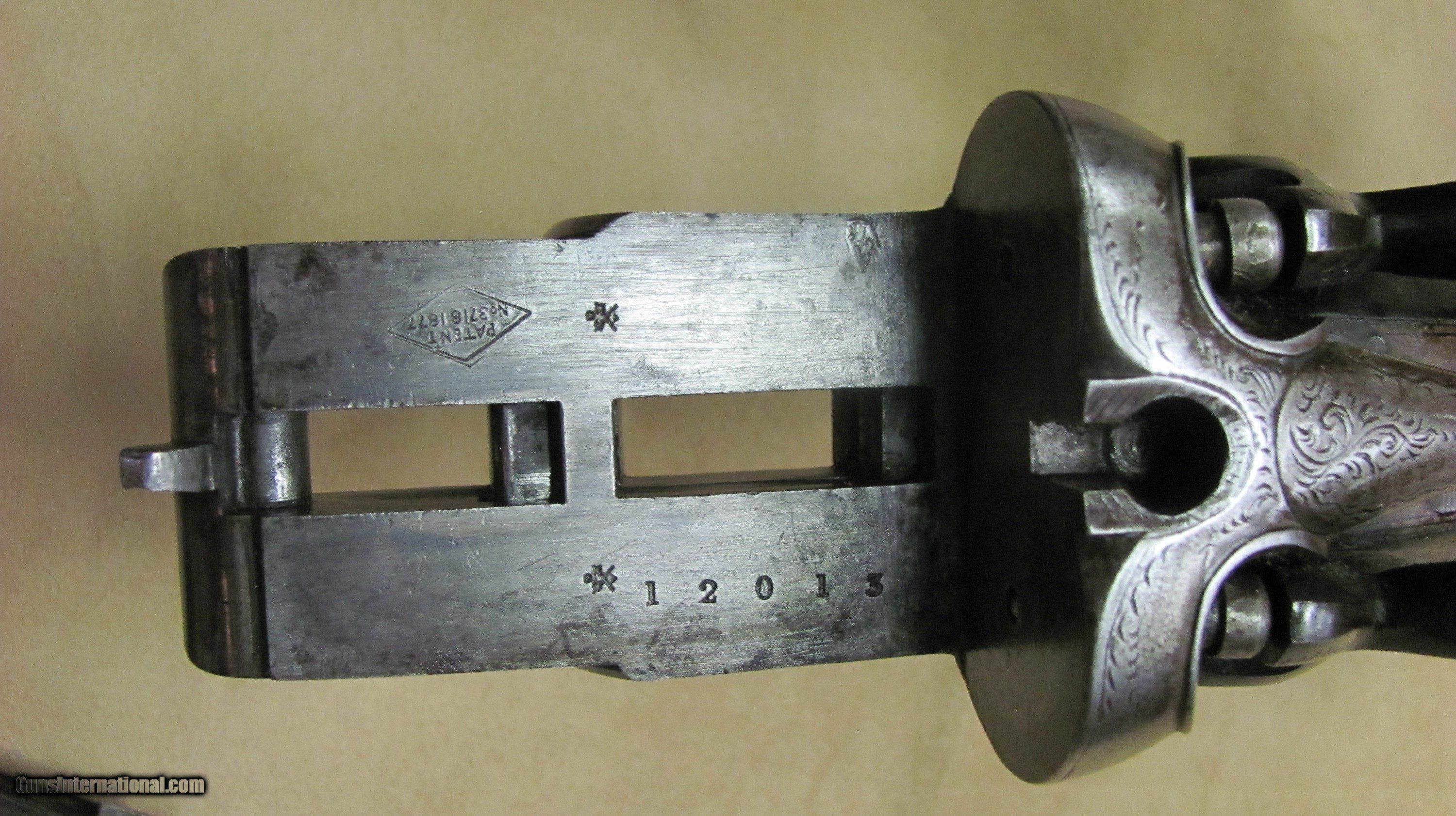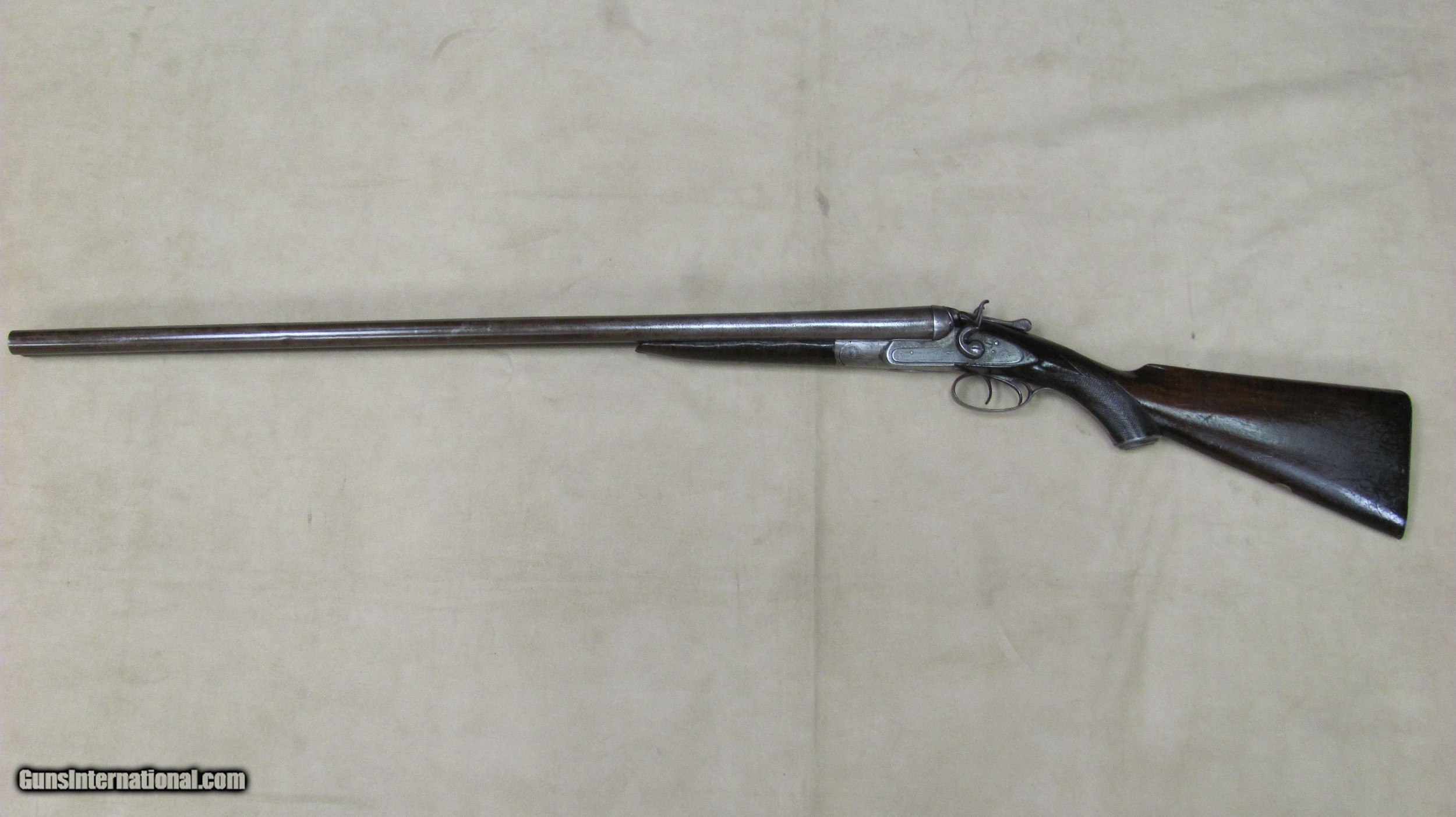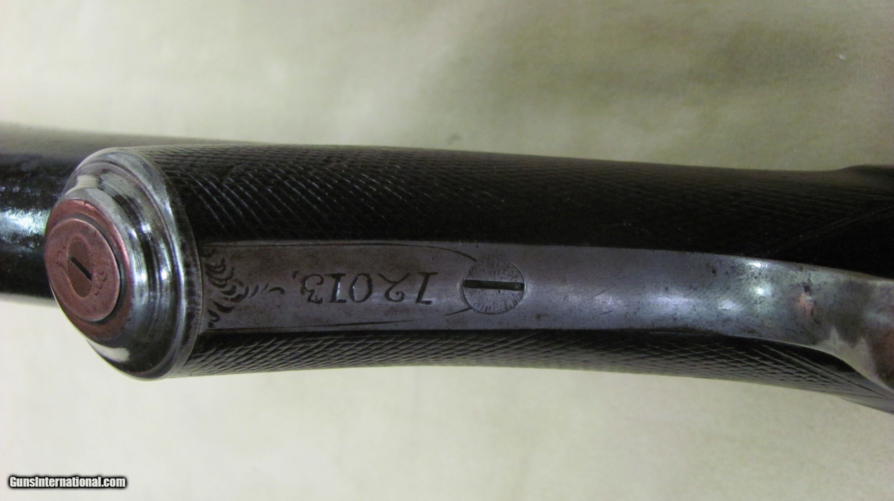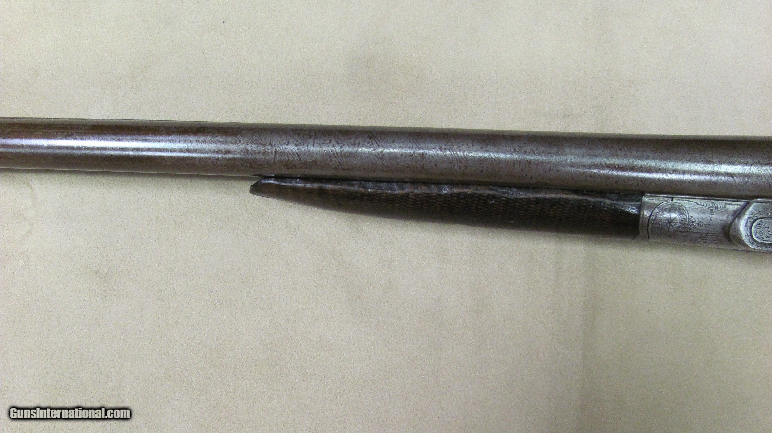 Description: C. G. Bonehill 10 gauge double barrel hammer shotgun with 32" Damascus barrels that have very good bores with minor pitting. Beautifully engraved receiver and heel and toe buttplate. Great condition for this antique English 10 gauge double. SOLD Antique: Yes Shotgun Gauge: 10 Gauge Manufacturer: C. G. Bonehill (English) Model: High Grade Double Serial Number: 12013 Barrel Length: 32 Inches Chambers: 3.0 Inches Ejectors: No Condition: Very good Metal Condition: Very Good Wood Condition: Very Good Bore Condition: Very Good Barrels: Damascus Barrel Type: Fine Damascus Triggers: Double Triggers Stock: Walnut Stock Comb: 2.0 Inches Stock Heel: 3 1/4 Inches Butt Pad: Heel and Toe LOP: 14 7/8 Inches Weight: 9.0 lbs. Manufacture Date: Late 1800s Engraving: Yes Proof:Black: Black |