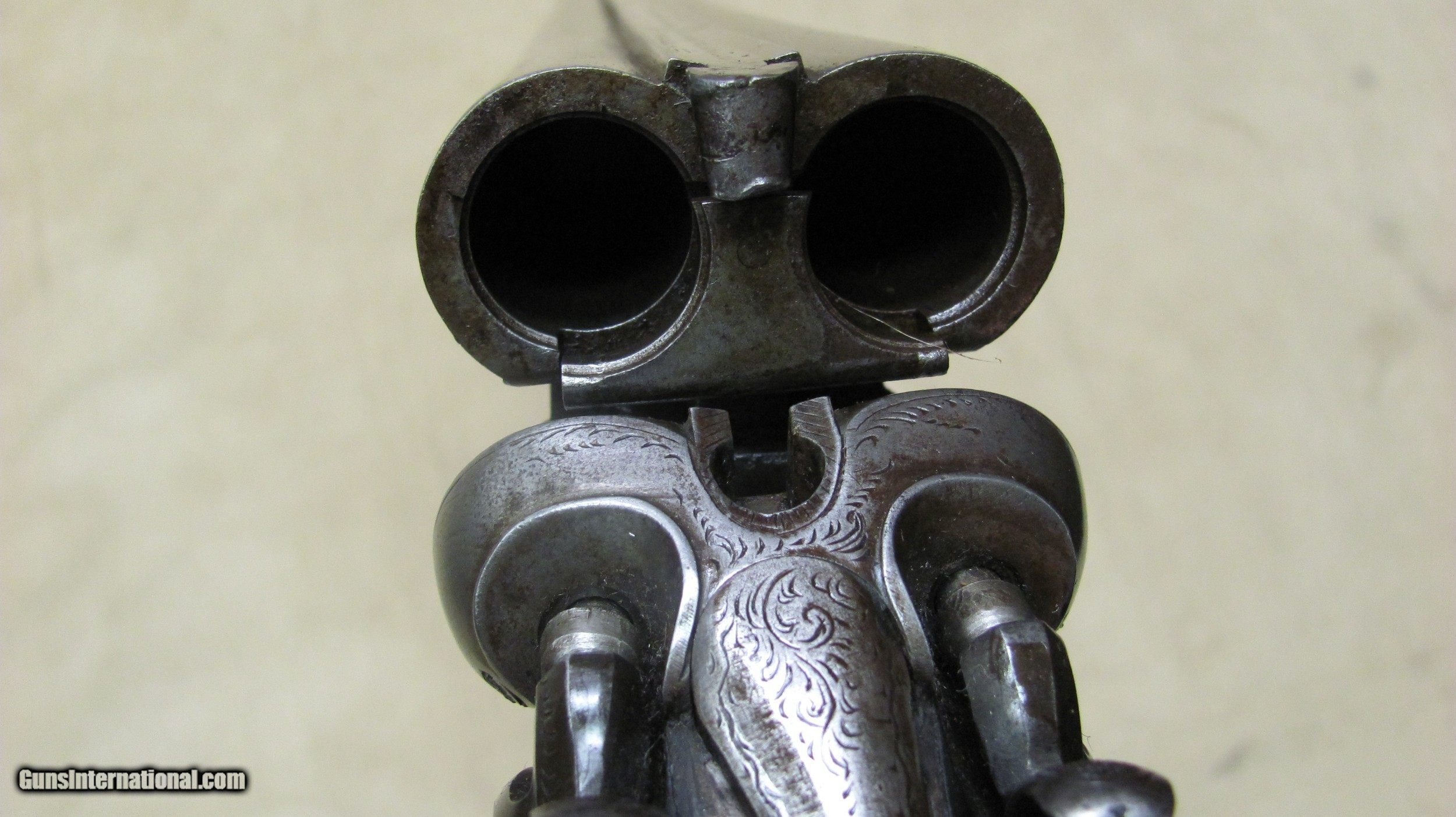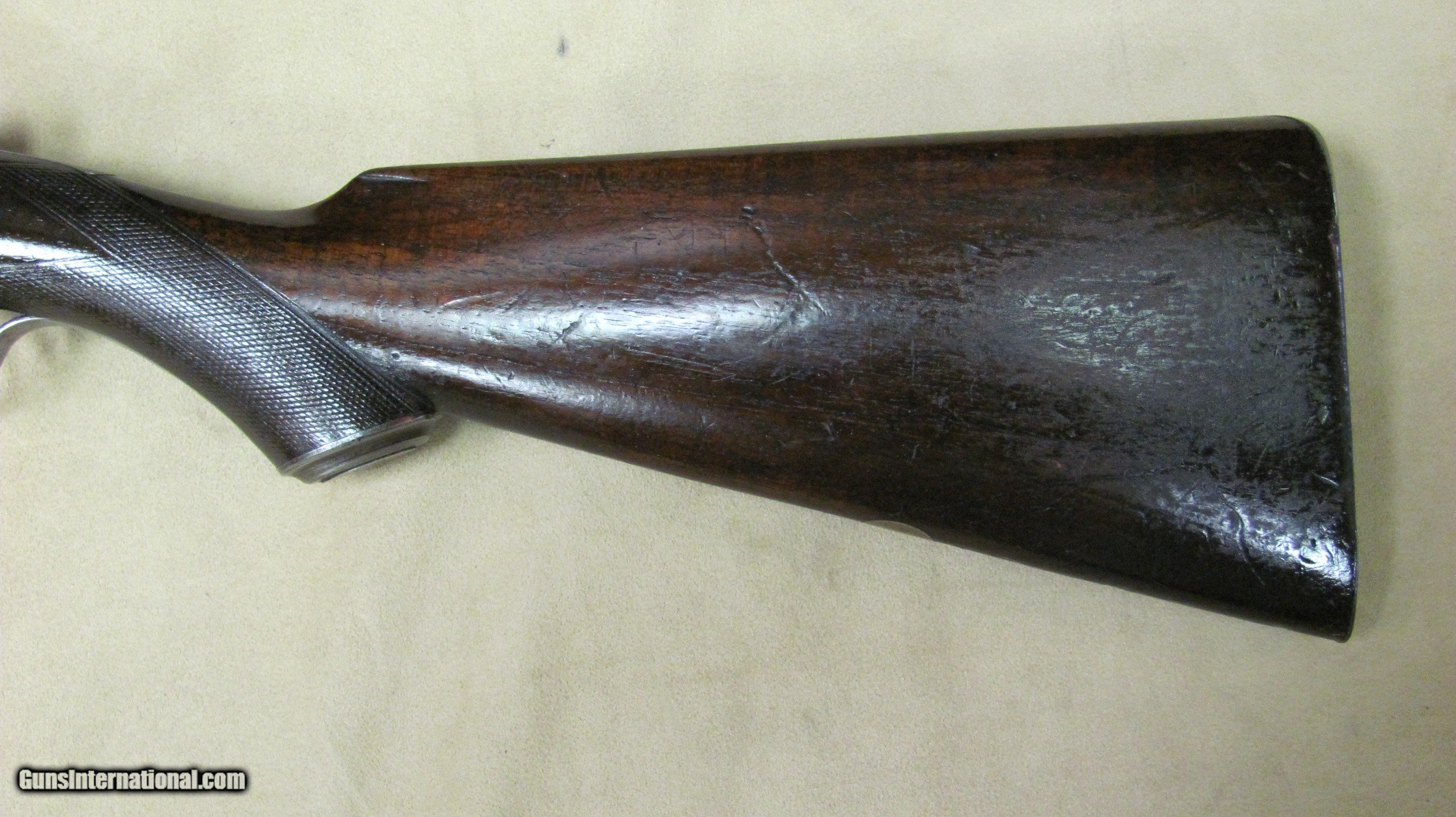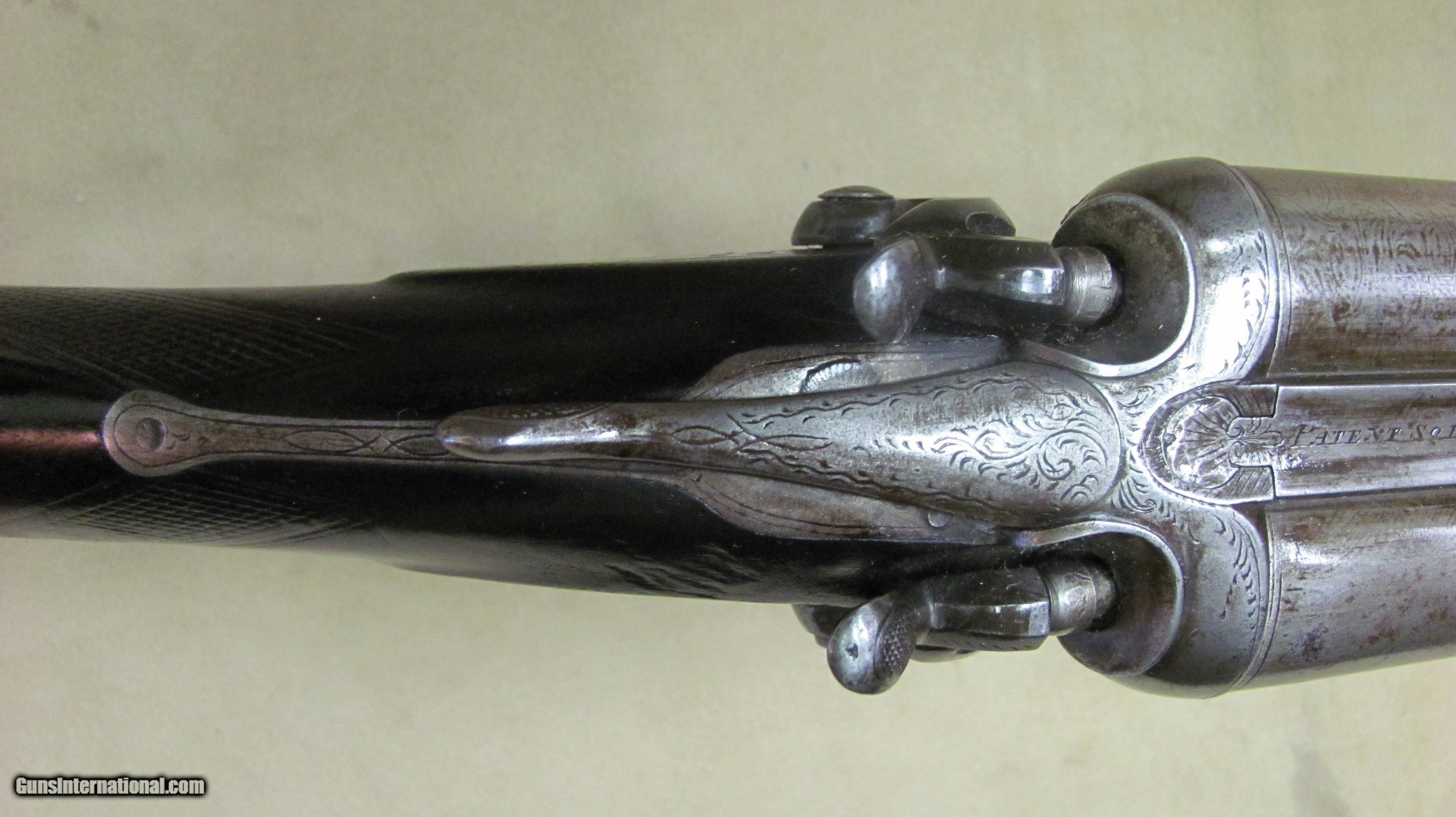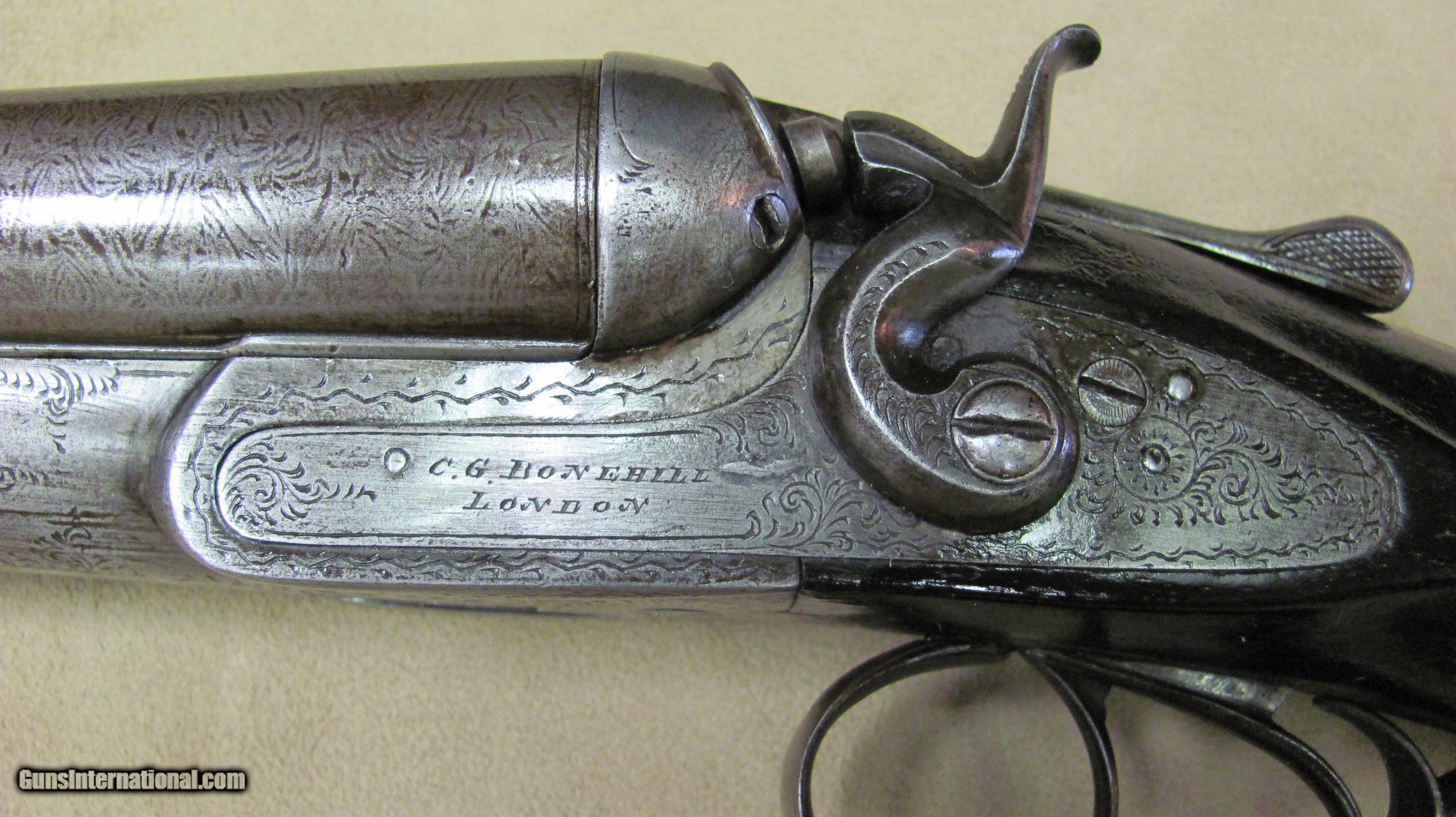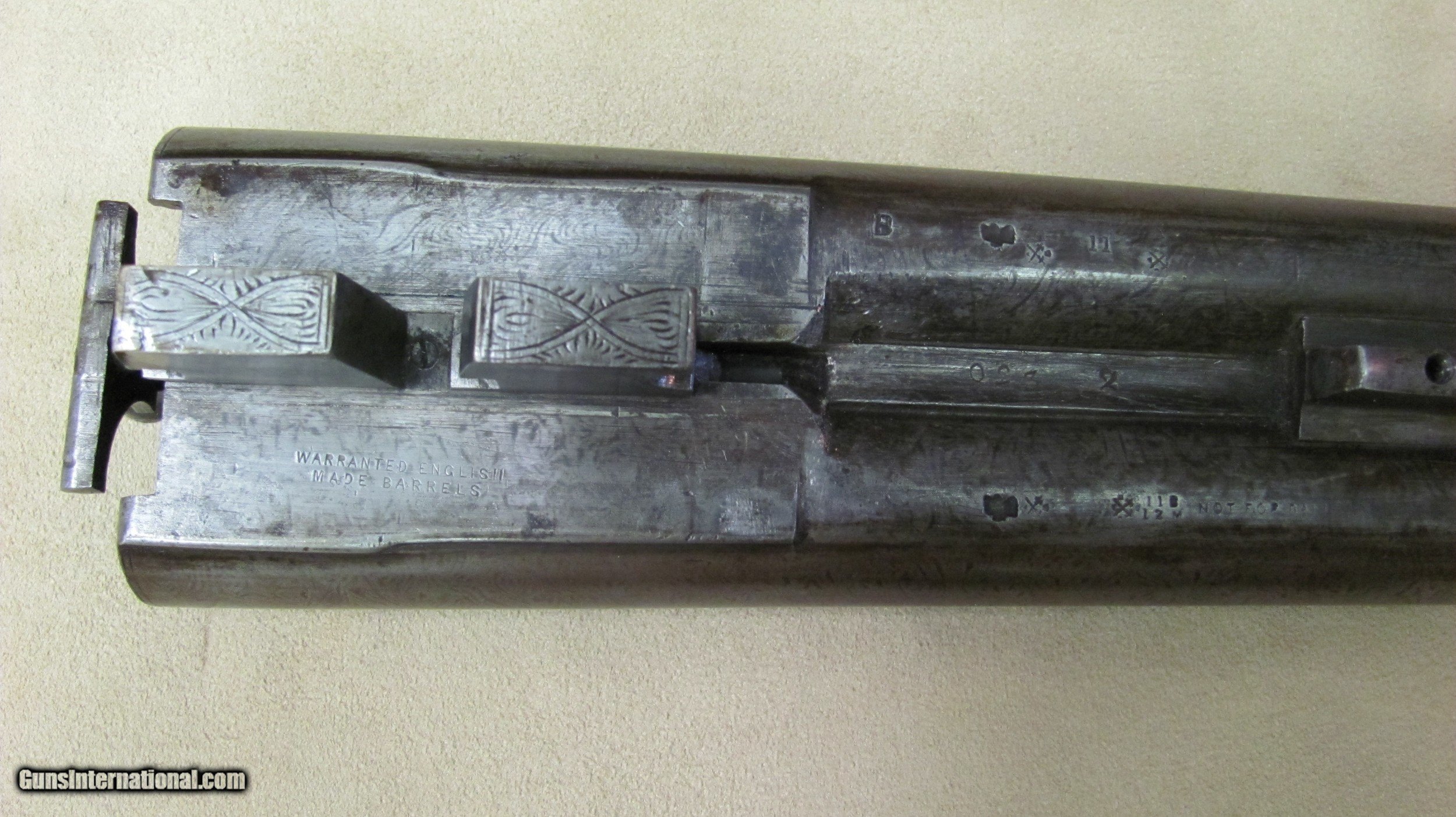 Description: C. G. Bonehill 10 gauge double barrel hammer shotgun with 32" Damascus barrels that have very good bores with minor pitting. Beautifully engraved receiver and heel and toe buttplate. Great condition for this antique English 10 gauge double. SOLD Antique: Yes Shotgun Gauge: 10 Gauge Manufacturer: C. G. Bonehill (English) Model: High Grade Double Serial Number: 12013 Barrel Length: 32 Inches Chambers: 3.0 Inches Ejectors: No Condition: Very good Metal Condition: Very Good Wood Condition: Very Good Bore Condition: Very Good Barrels: Damascus Barrel Type: Fine Damascus Triggers: Double Triggers Stock: Walnut Stock Comb: 2.0 Inches Stock Heel: 3 1/4 Inches Butt Pad: Heel and Toe LOP: 14 7/8 Inches Weight: 9.0 lbs. Manufacture Date: Late 1800s Engraving: Yes Proof:Black: Black |
