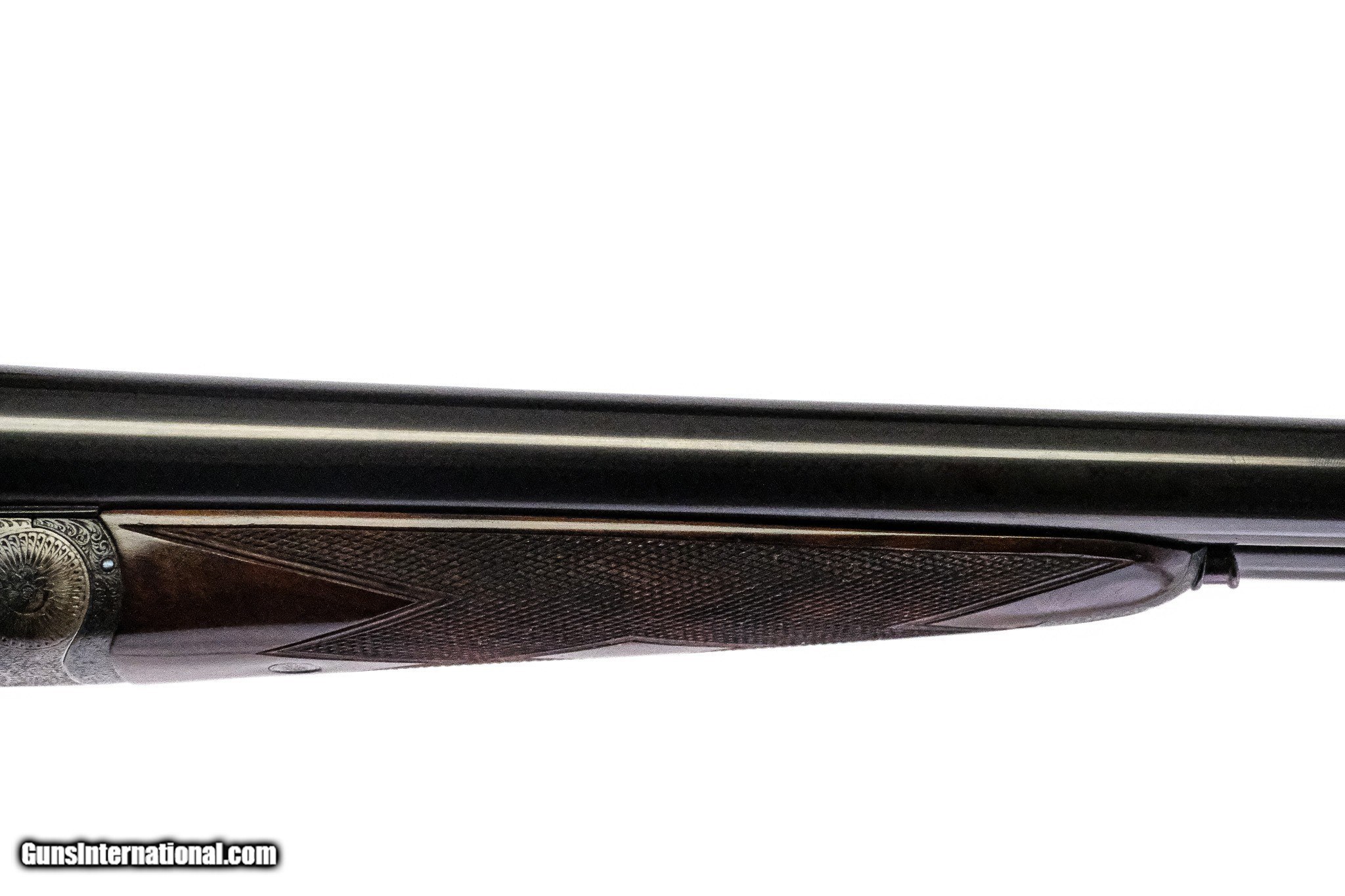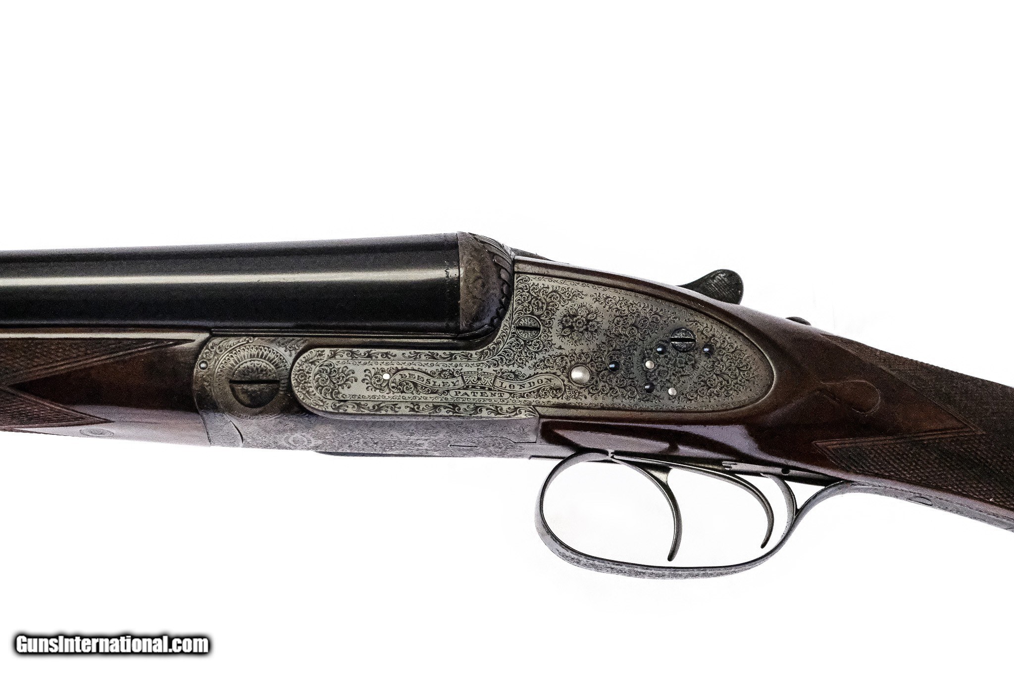 Description: F. Beesley - Best Quality Full Sidelock, SxS, 12ga. 28" Barrels Choked IC/M. Double trigger automatic ejector, 100% Case Colored, Barrel Blue, and wood finish. “James Woodward’s Fluid Press steel” marked on both barrels, London Pali, Mall Corner Address. Number one of a pair, outstanding full coverage Rose and Scroll engraving, with deep chiseled breeches and name in banners on each side of the frame. Beautifully marble cake Turkish Walnut. This gun has gone through a complete London style refurbishment and looks absolutely new! Every screw is perfect, engraving is sharp and clear, wood is without any defects. Blue is English and perfect (We have the corresponding gun that we’ll sell as a pair). Inv: 71688 6 lbs. 9 oz. 15 3/8" x 1 3/8" x 2 ¾" $10,995.00 SOLD |