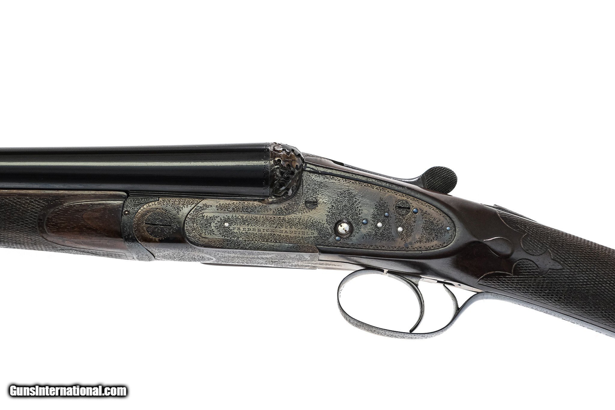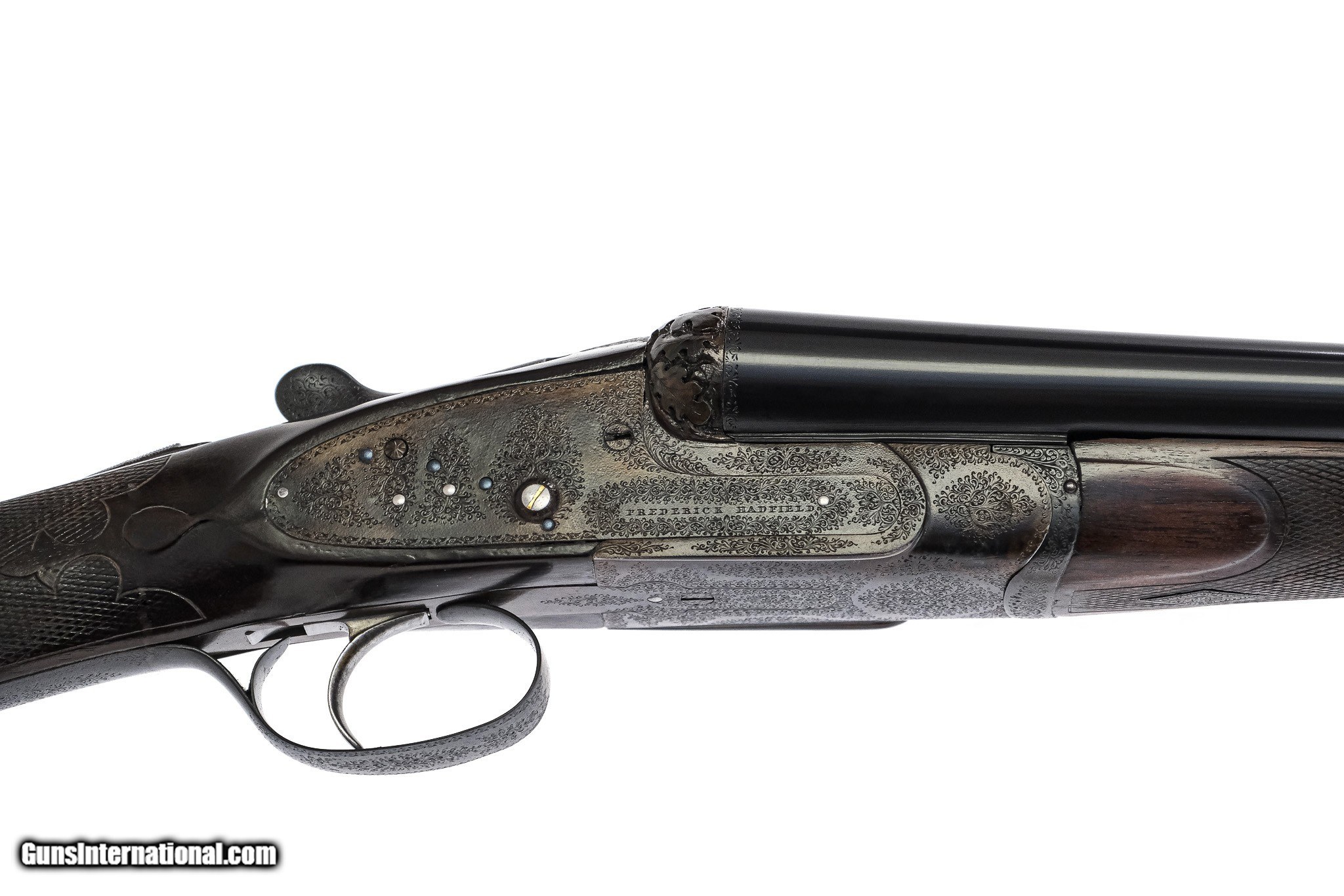 Description: Frederick Hadfield - SxS, 20ga. 28" Wentworth Steel Barrels Choked M/IM. Birmingham, 2 ¾ Chambers Choked M/IM, gun has deep carved fences with relief oakleaf and acorn, the receiver is delicately engraved with miniature scroll, protruding tumbrils, safe in gold, single trigger, drop points, forrelle checkering, steel heel and toe plates, straight grip, full sidelock, this a very high grade gun, lots of case color and barrel blue, square top checkering, hidden third fastener, splinter forend, extreme high quality very unusual small bore. Inv: 71910 5 lbs. 6 oz. 13 ½" x 1 ½" X 2 ¾" $9,500.00 SOLD |
