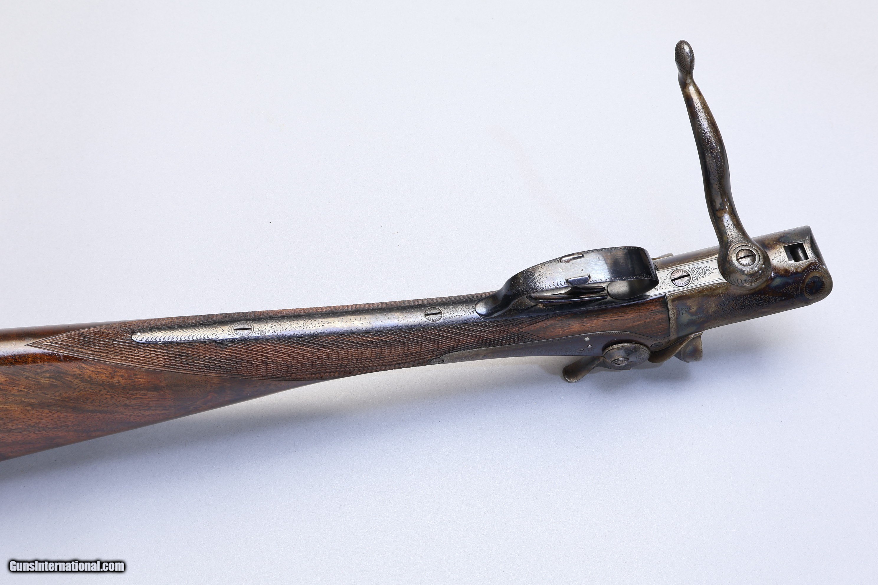 Description: 3" Chambers | Extractors | Very Good Condition This Hammer Gun - Black Powder only in 10 Ga is a classic United Kingdom-made rotary underlever design built for traditional black powder shooting. It has a strong build, English Walnut furniture, and a solid rib set over Damascus barrels. This example has original colour hardening on the receiver and the browning on the barrels remains in very good shape with only a few worn areas on the underside. It has a checkered butt stock, thick barrels, and the overall condition is very good for its age, with the black powder setup requiring no FFL.