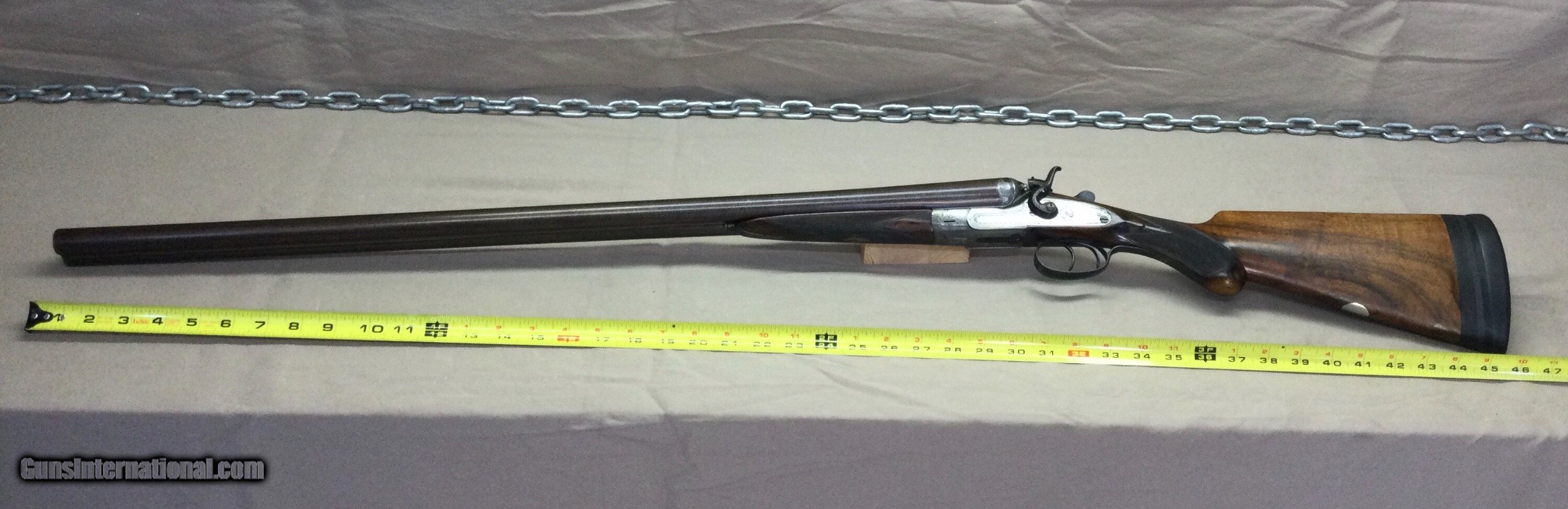 Description: Midland SxS Shotgun … 12 Gauge ... Damascus Steel Barrels … 3 bar I think … Classic brown color … Probably a high end gun when it was made … Traditional engraving that gives the gun a really classic look … Very attractive wood … good grain … good condition ... no cracks … Maker was Midland Guns … Birmingham England … circa late 1800s ... Double trigger … true sidelock hammer gun ... All serial numbers match … Weight 7.0 lbs ... Spacer added between stock and butt pad to create 14.5 LOP ... 30 Inch Ribbed Barrel … Greener style crossbolt ... Tight fitting barrels … Chambered 2 ¾ inch … Good triggers, smooth and consistent … firing pins replaced about 10 years ago … Extractors not ejectors … simple and reliable … easy to clean ... Barrels were nitro proofed for modern ammo - see the base of the barrels ... Fixed choked … right barrel Cyl, left barrel IC ... Well formed 50/50 patterns with both barrels ... Overall condition is excellent for 120+ year old gun … This is not a gun for display only, it is also a gun to shoot ... Last 15 years the gun was used for vintage sporting clay shoots … Comes in a new leather case … classic leg-o-mutton style … perfect … Really fun to shoot … I’ve posted good tournament scores with this gun ... SOLD Antique: Yes Shotgun Gauge: 12 Gauge Manufacturer: Midland Barrel Length: 30 inch Bore: 12 Ga Condition: Excellent Metal Condition: Excellent Wood Condition: Very Good Bore Condition: Excellent Barrels: 30 inch Barrel Type: Damascus Triggers: Double Hammer Rib: Yes Finish: Brown Weight: 7.0 lbs Choke Left: IC Choke Right: Cyl Engraving: Yes Case: Leg o mutton Proof:Nitro: Yes |
