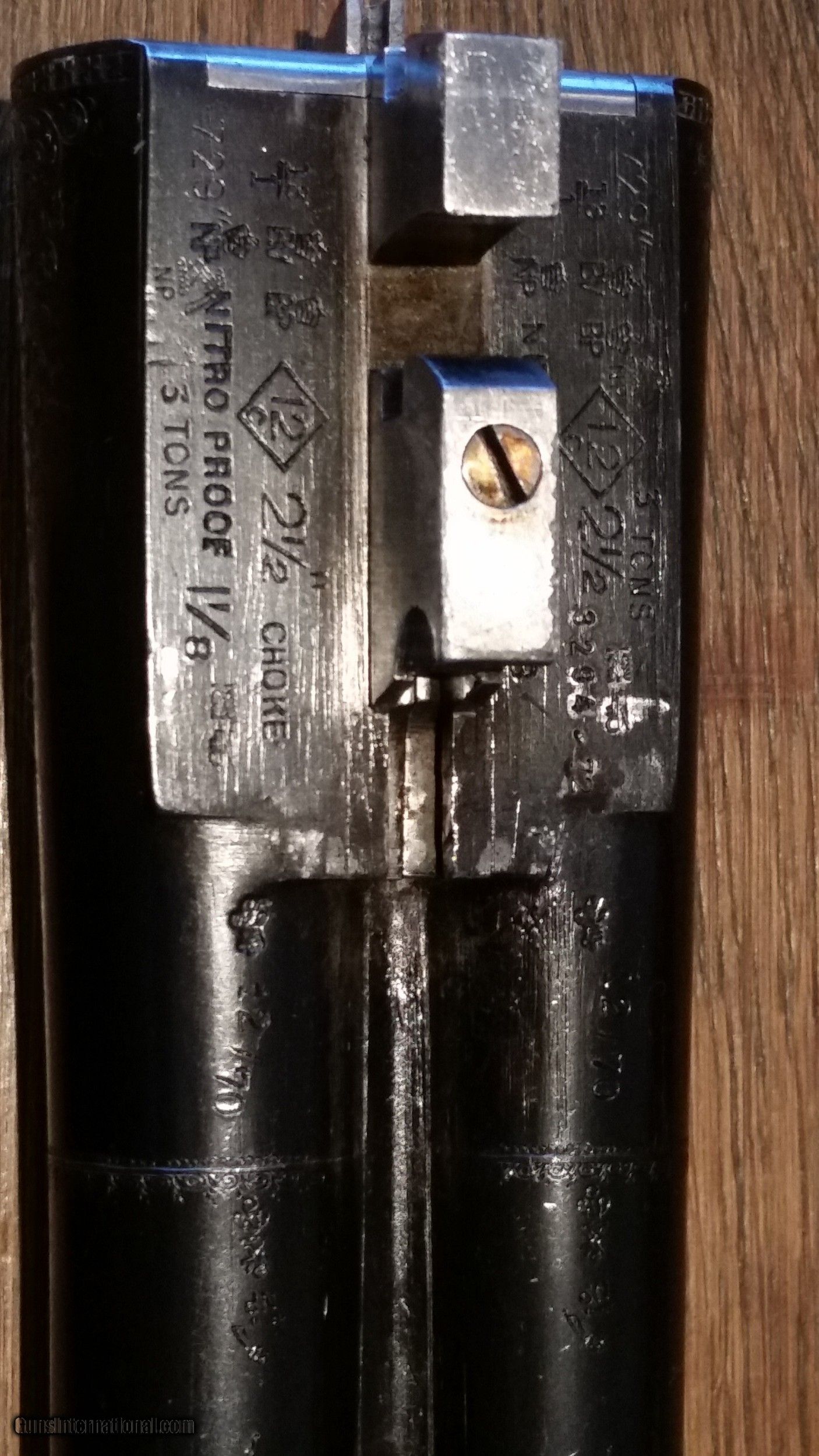 This is a pre-1898 antique as reflected by the original “13/1” (.719) antique annotation on both barrel flats indicating bore measurements when it was originally black powder proof. The barrels themselves also possess the original antique black powder Birmingham proof marks from the late 1880’s / early 1890’s, including the provisional proof mark “GP” under a crown, as well as the original antique Birmingham definitive proof marks of crossed halberds further up the barrel rounds. Original antique load measurements for 2 & ½” chambers reflected in “1 & 1/8” markings on the barrel flats.