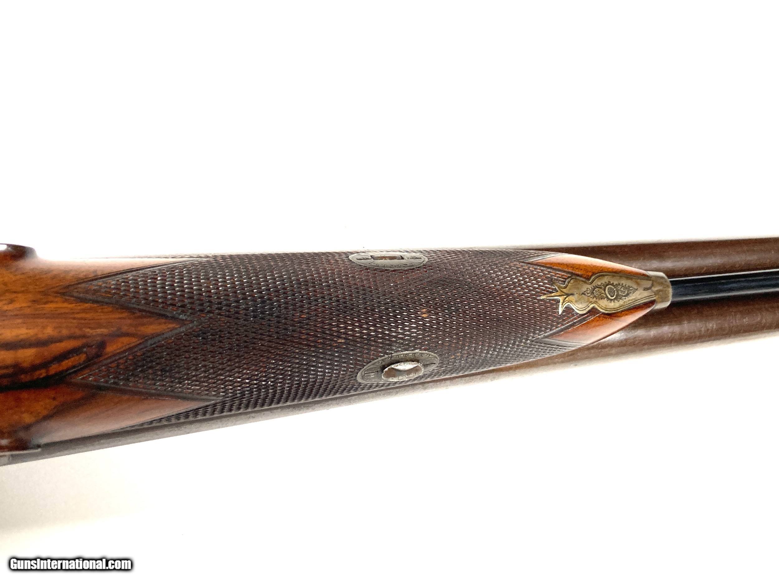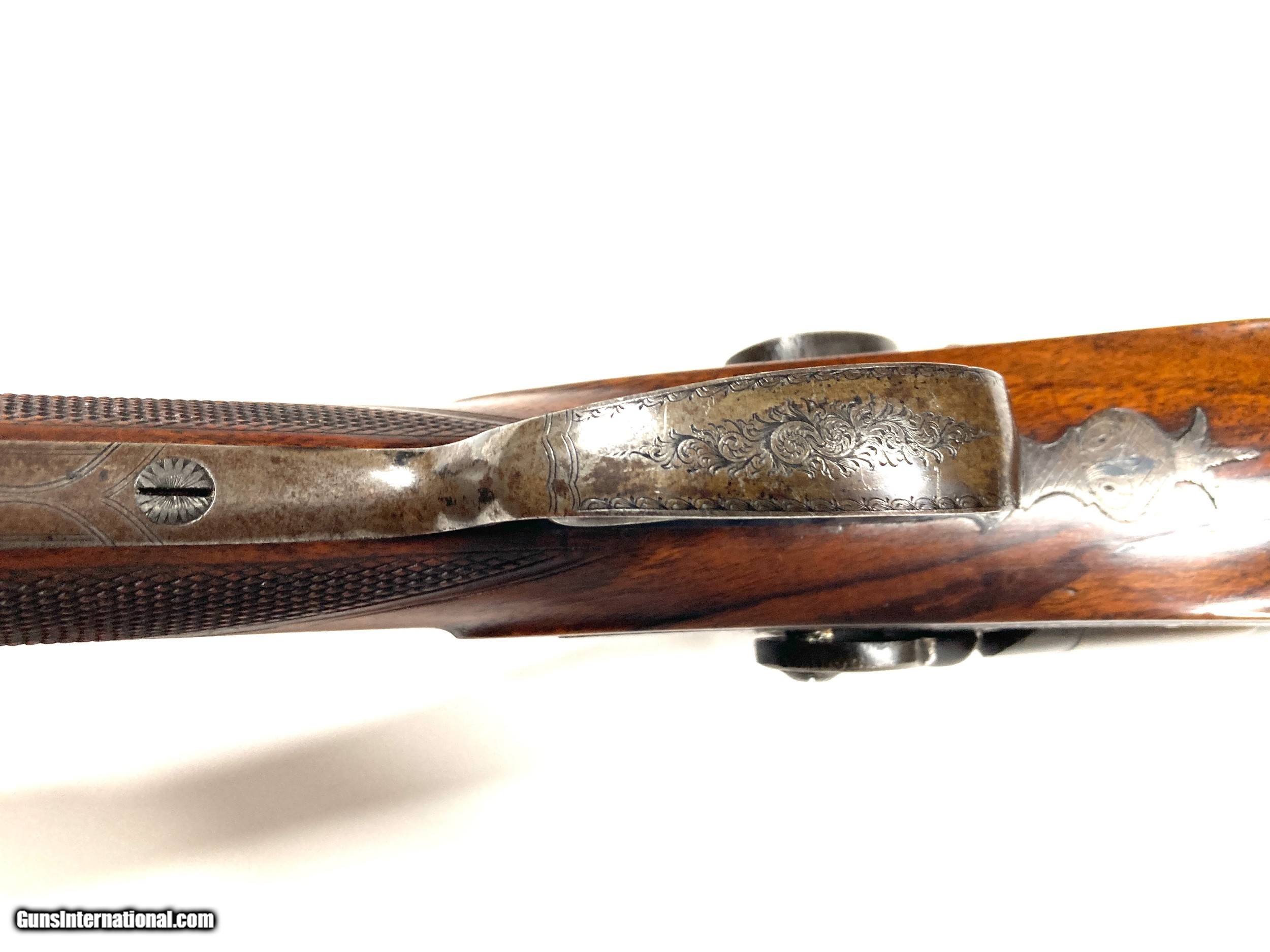 Description: Thomas Turner Marlborough 12 ga percussion shotgun 29 1/2" damascus barrels in great condition( fantastic bores) LOP 14 1/4 DAC 1 3/8 DAH 1 3/4 6lbs 15oz Great percussion bird gun that is ready to go afield Harrison sporting arms is always looking for quality firearms to buy and new consignments SOLD Antique: Yes Shotgun Gauge: 12 Gauge Serial Number: NSN Condition: Very good/Exellent Proof:Black: yes |
