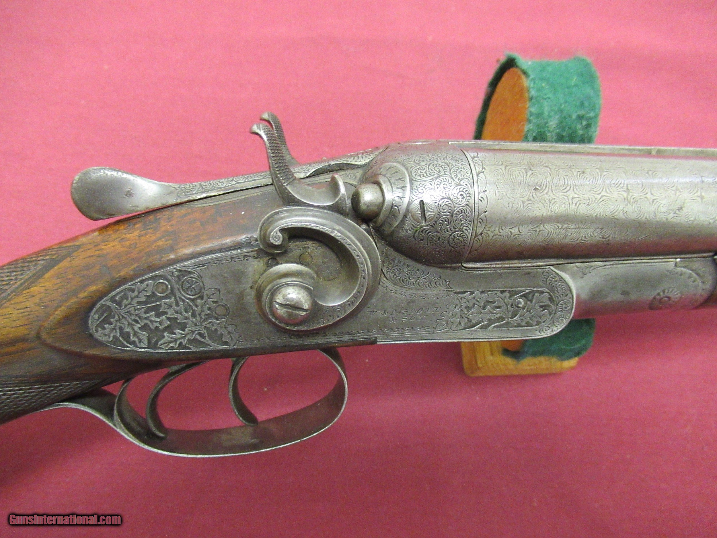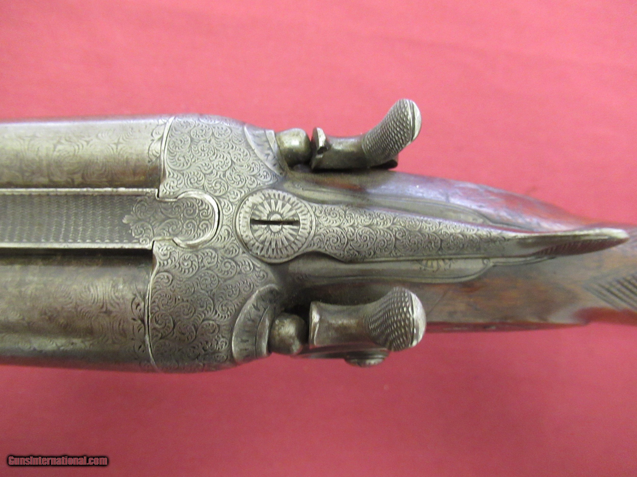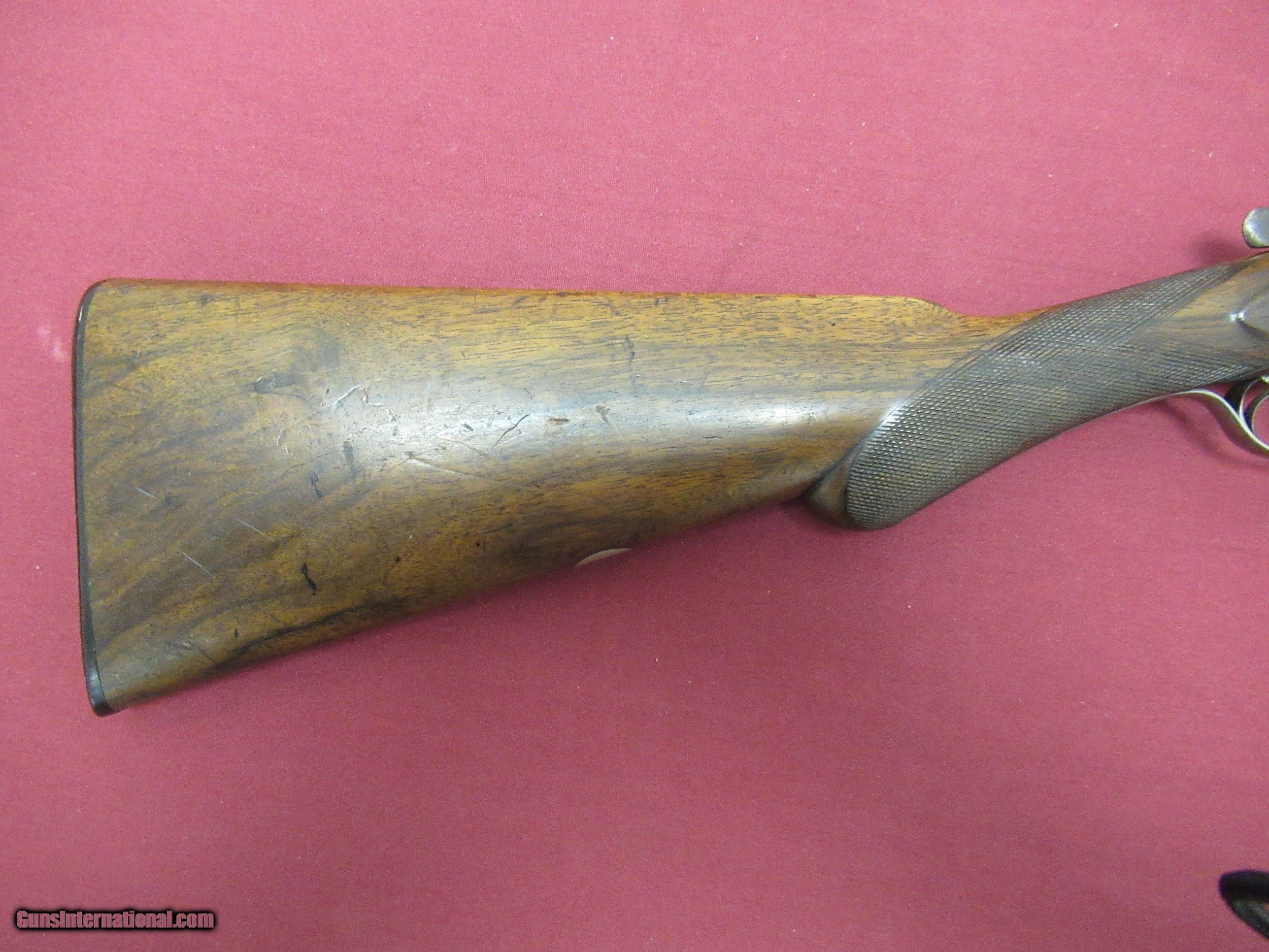 Description: Well Preserved W&C Scott & Son 20 Gauge Double. Right Barrelis marked W&C Scott & Son ( BOGARDUS CLUB GUN ) MAKERS. Nicely Engraved Receiver (no color left) Trigger Guard and 28" Barrels at Breach. Bores are very good (Bright) with no pits. A few small scratches (lines) past the right chamber but nothing major. Still a fairly strong Damascus Pattern on the barrels. Wood is Solid with no apparent splits or cracks, strong checkering but numerous handling marks (pictured). Original Butt Plate. Right Barrel choked Cylinder with Left Barrel choked IC. I believe 2&1/2" chambers ( Can't locate my chamber guage.) Very small dent in left barrel (pictured) Nice old delicate shootable double. Thanis for Looking. SOLD Antique: Yes Serial Number: 40052 Barrel Length: 28 Caliber Info: 20 Ejectors: Extractors Action: Sidelock Triggers: Double Gauge Info: 20 Stock Comb: 2&1/4 Stock Heel: 3&3/8 LOP: 14&1/4 |