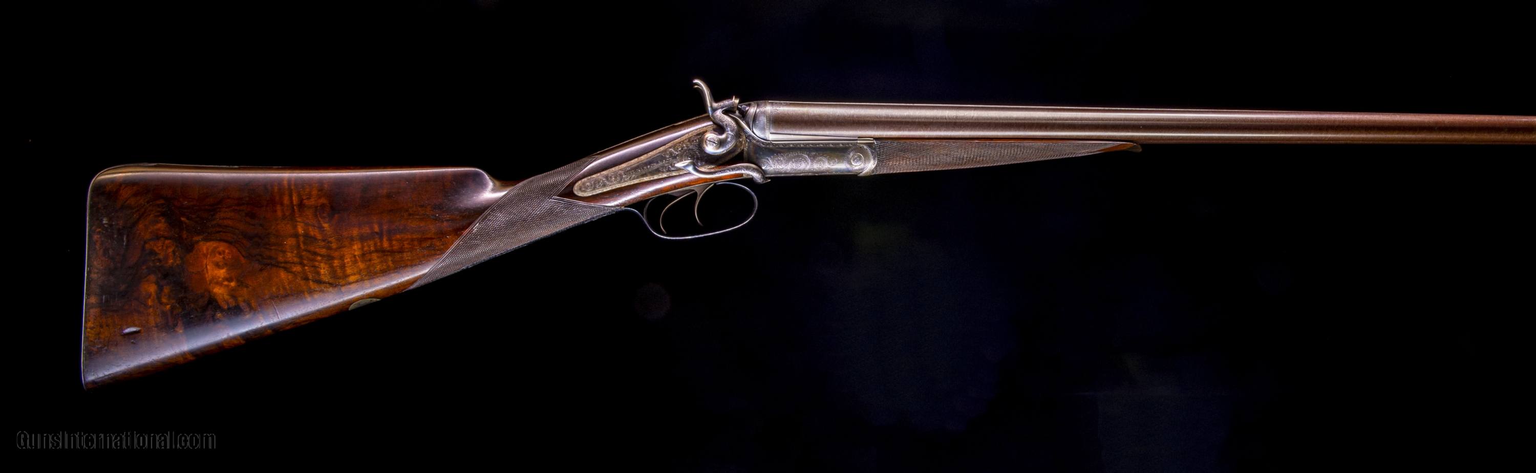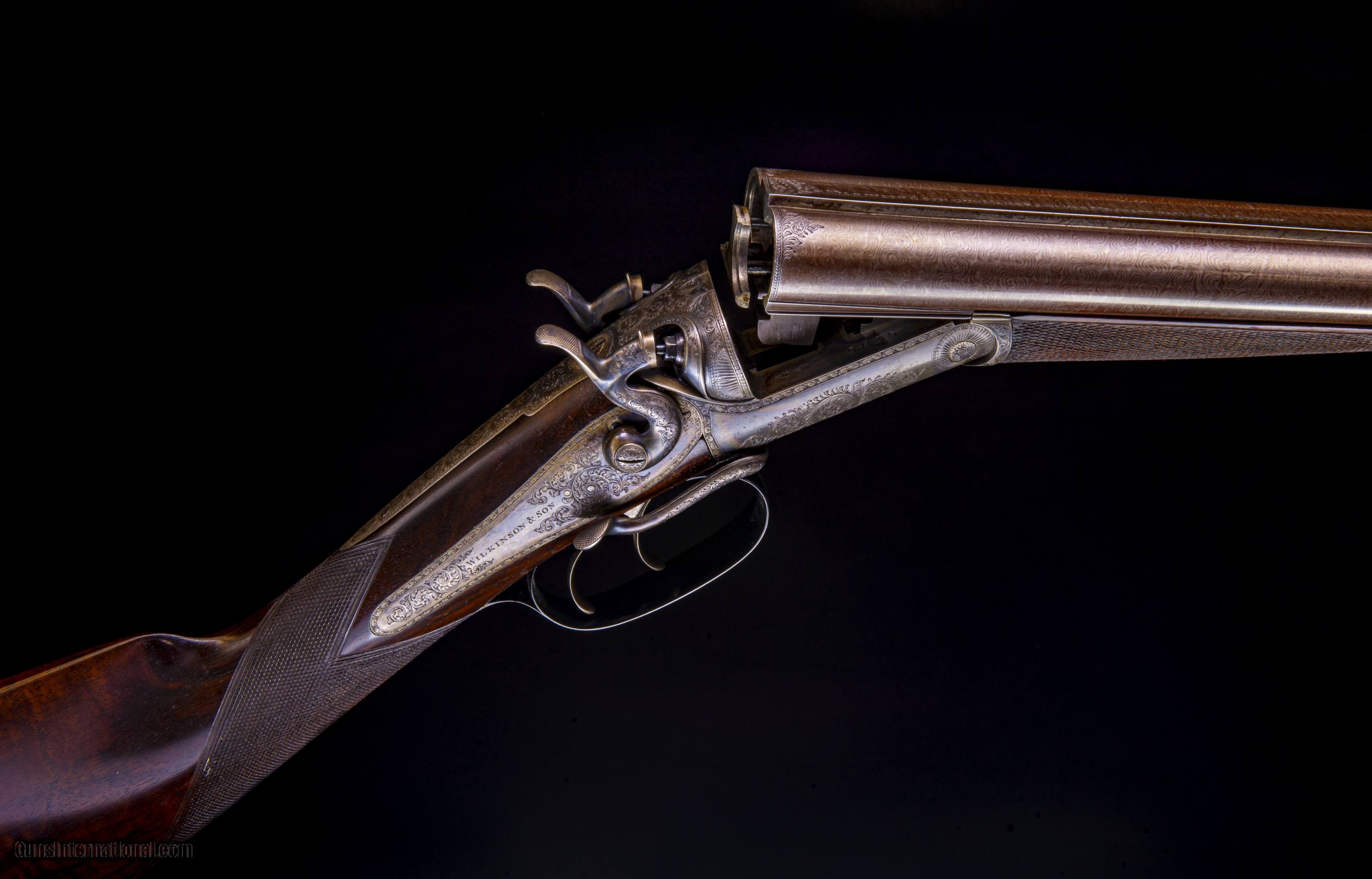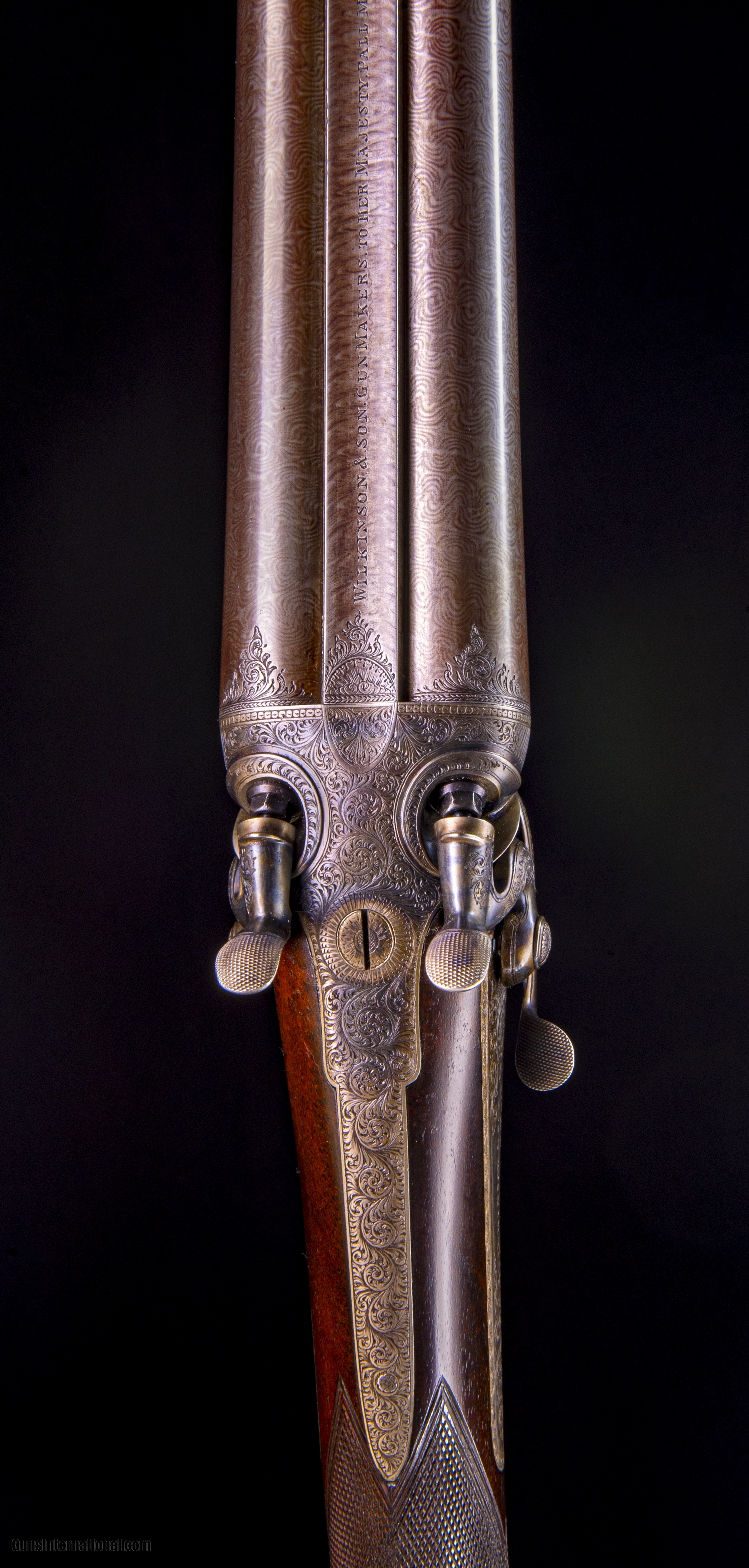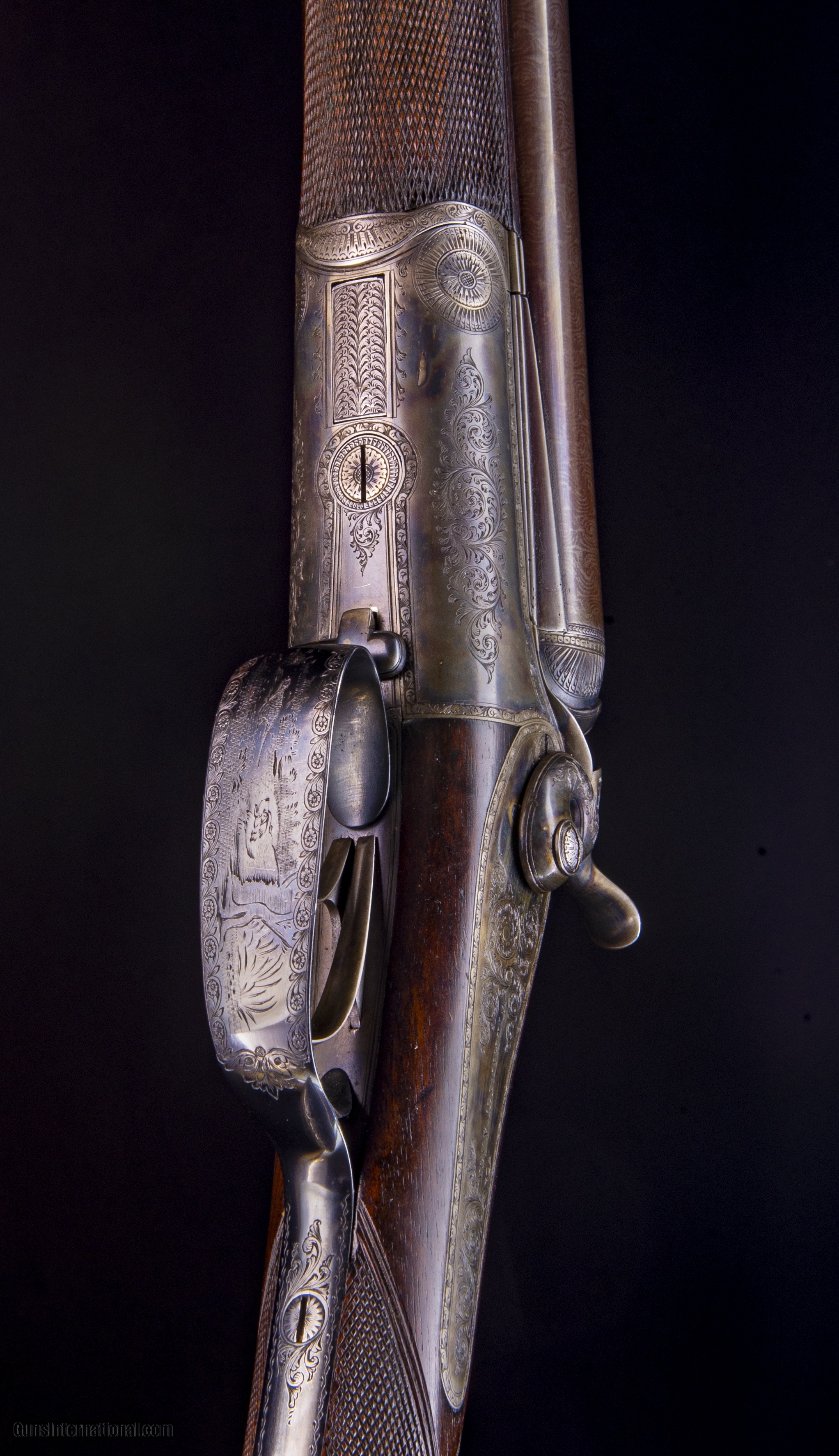 Description: Hammerguns - This is a stunning 16g. sidelever hammer gun with its original Damascus barrels which are now nitro proofed. Bores are basically bright and shiny with the exception of some minor pits in the left barrel which were certainly there when the gun was nitro proofed. *This gun screams to get afield. It is tight and ready. What a great quail gun this would make! *The engraving is exceptionally sharp, high quality, and features a tremendous amount of color case hardening.