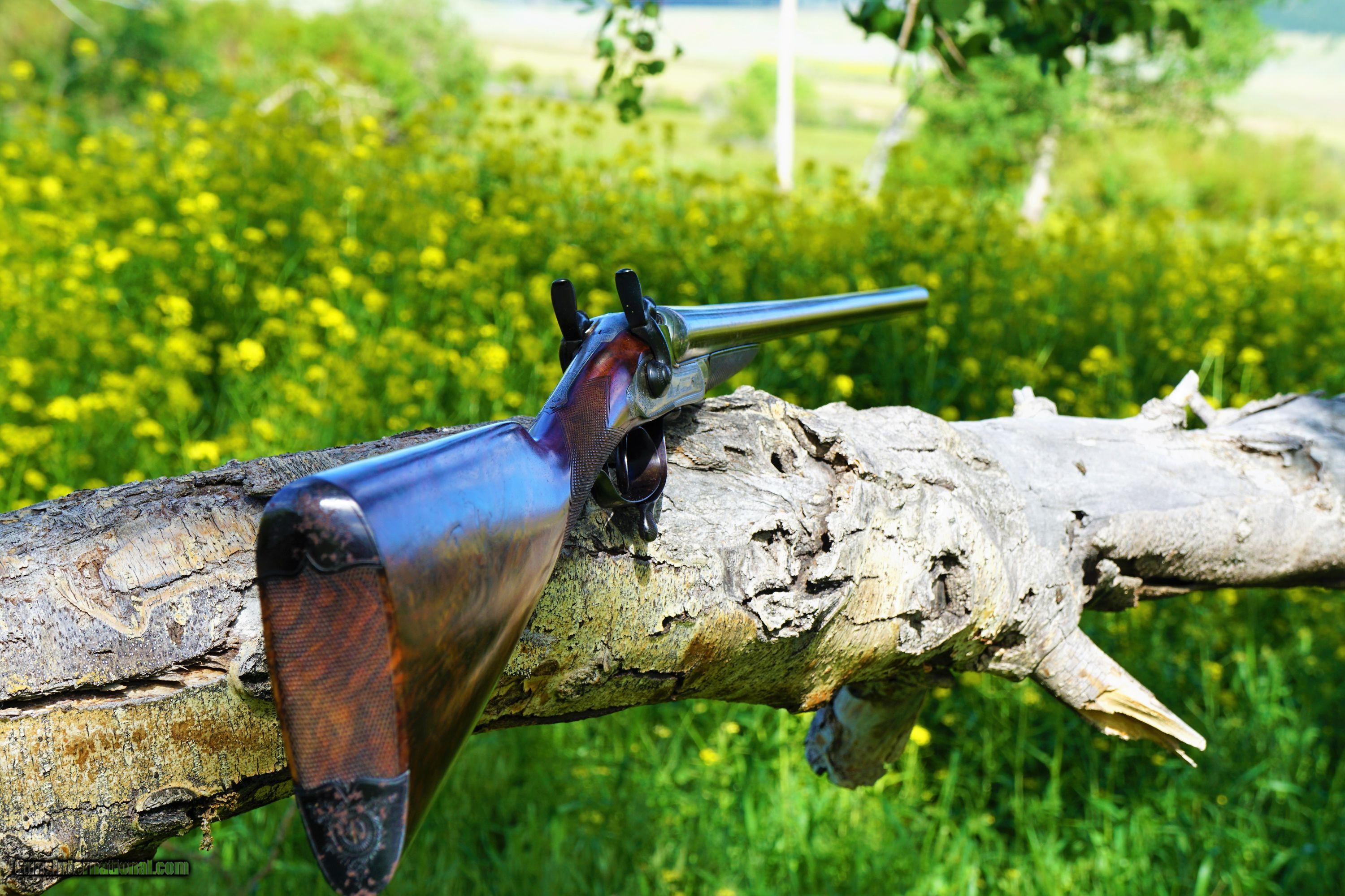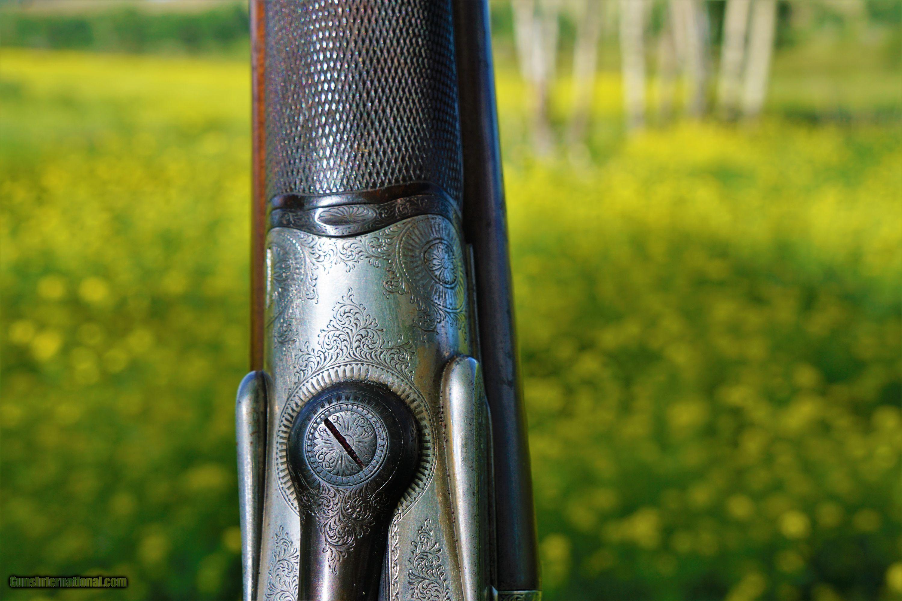 Description: FREE SHIPPING. RETURNS ALWAYS ACCEPTED. LAYAWAY CONSIDERED. Beautiful, Jones patent underlever hammergun by William Griffiths of Manchester. The 30" Nitro-proved Damascus barrels have 2 1/2" chambers. They are choked .013/.025 (approximately IC/M). The gun locks up tight, and the rebounding locks function crisply. The action is very distinctive, with carved percussion fences, excellent game scene vignettes surrounded by acanthus scroll engraving, and unusual stepped sidelock extensions (see photos.) The trademark Griffiths dog is engraved on the trigger guard bow. (Please see the Griffith's boxlock I have listed for comparison). The gun weighs 6 lbs 13 oz. The wood is attractive, figured French walnut, and the stock measures 1 1/2" x 1 3/4" x 14 3/8" over a checkered butt with engraved heel and toe plates. The cast is close to neutral. A wonderful classic bird gun. Please feel free to email with any and all questions. SOLD Antique: Yes Manufacturer: WILLIAM GRIFFITHS Bore: 12 Chambers: 2 1/2 Ejectors: NO Bore Condition: VG Choke Left: .025 Choke Right: .013 Proof:Nitro: NITRO |
