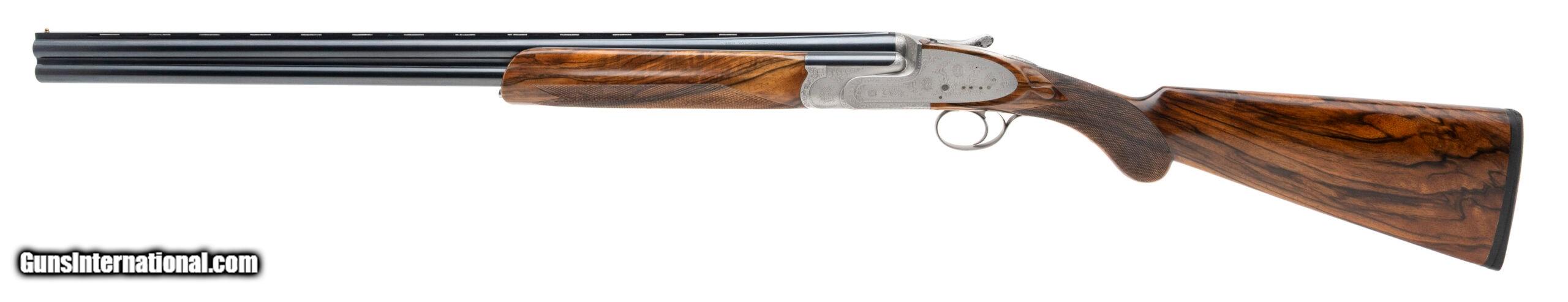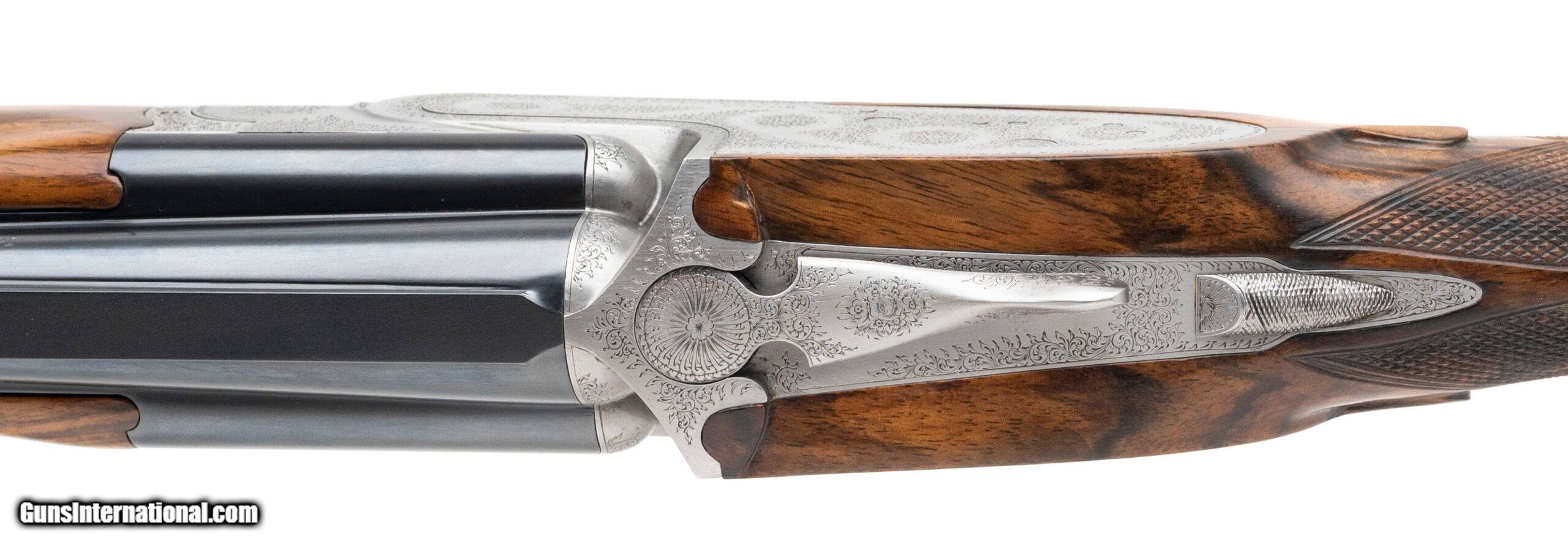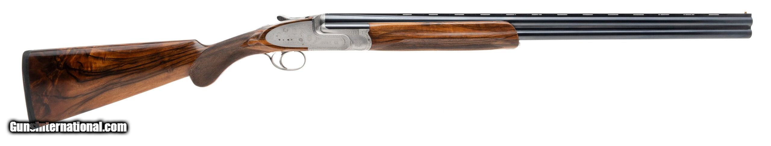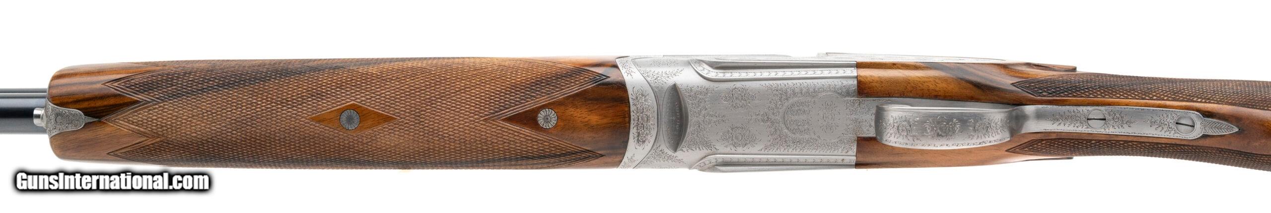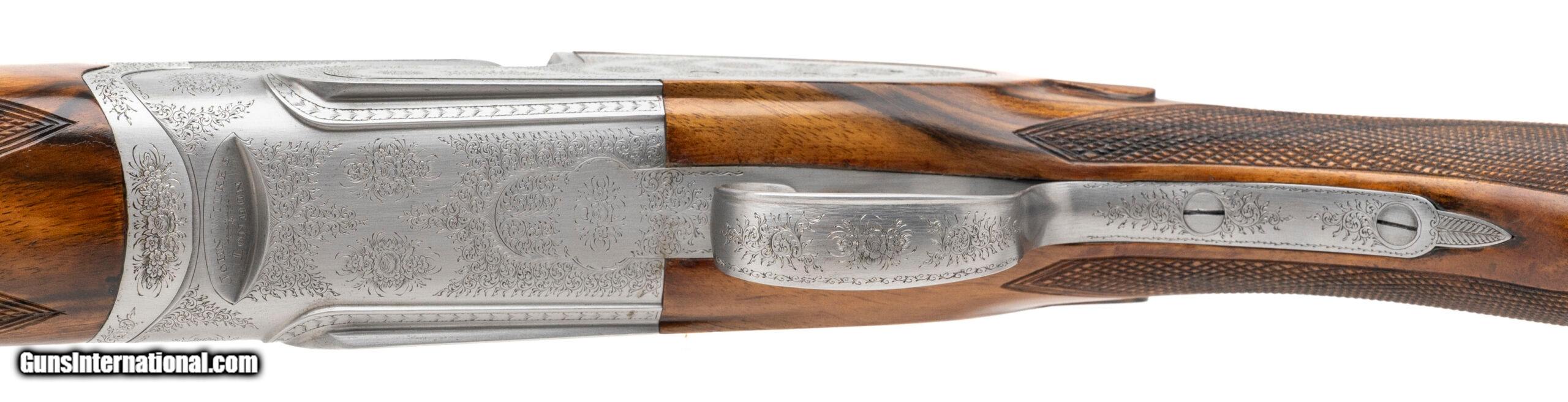 Description: "SN: 15521 made circa 2004 in London, distributed to John Wilkes Gunmakers Ltd. in Colorado Springs. Boss clone 20 gauge over under shotgun with 26" Brazier solid/solid monoblock vent rib barrels, 3" chambers and Briley removable chokes. Nicely engraved in British style rose and scroll coin finished 6 pin sidelock with non-selective single trigger, auto ejectors and a manual safety. Highly figured walnut furniture hand checkered and oil finished with a 15" LOP to the Decelerator recoil pad with a drop of 1 5/8" to 2 ¼". Some very light handling marks but overall in near excellent condition with excellent bores. Comes with original case and extra Briley chokes. Price: $18,995.00 Contact Seller |
