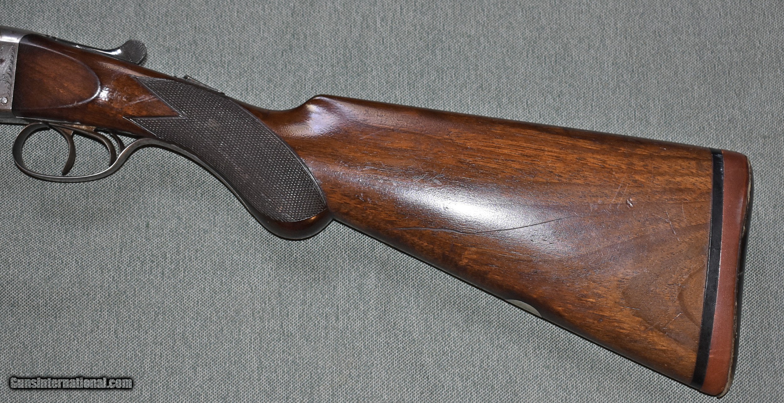 Description: 20 gauge boxlock ejector by William Cashmore. built in the 1920s, this little gun has 28" fluid steel barrels choked improved cylinder (.010") and modified (.017"). The bores are minit and free of any rust,dents,or pitting. The barrels are proved for 29/16" chambers. (234") and 1 oz of shot. A bit unusual for an English 20,but very serviceable for U.S. shooters. The barrels are on face and lock up to the action with no play. The barrels retain 98% of the original blue. The stock is sound with no cracks or damage. The stock has a 14"LOP over a leather faced recoil pad. The receiver has light scroll engraving and the makers name engraved on each side. The receiver has a nice silver patina. The ejector are timed and strong and the triggers break cleanly. This would make a wonderful walking bird gun for grouse,pheasants,or quail. It would also be deadly in the dove fields. C&R eligible. SOLD Curio/Relic: Yes Shotgun Gauge: 20 Gauge Manufacturer: Willaim Cashmore Model: Boxlock Ejector Serial Number: 20468 Barrel Length: 28 Chambers: 23/4 Ejectors: yes Condition: excellent Metal Condition: excellent Wood Condition: excellent Bore Condition: mint Barrel Type: fluid steel Action: double barrel Triggers: double Stock Dimensions: 14x11/2"x21/2 Fore End: splinter Butt Pad: leather covered pad Weight: 5-12 Manufacture Date: 1920s Choke Left: mod(.017") Choke Right: IC (.010") |