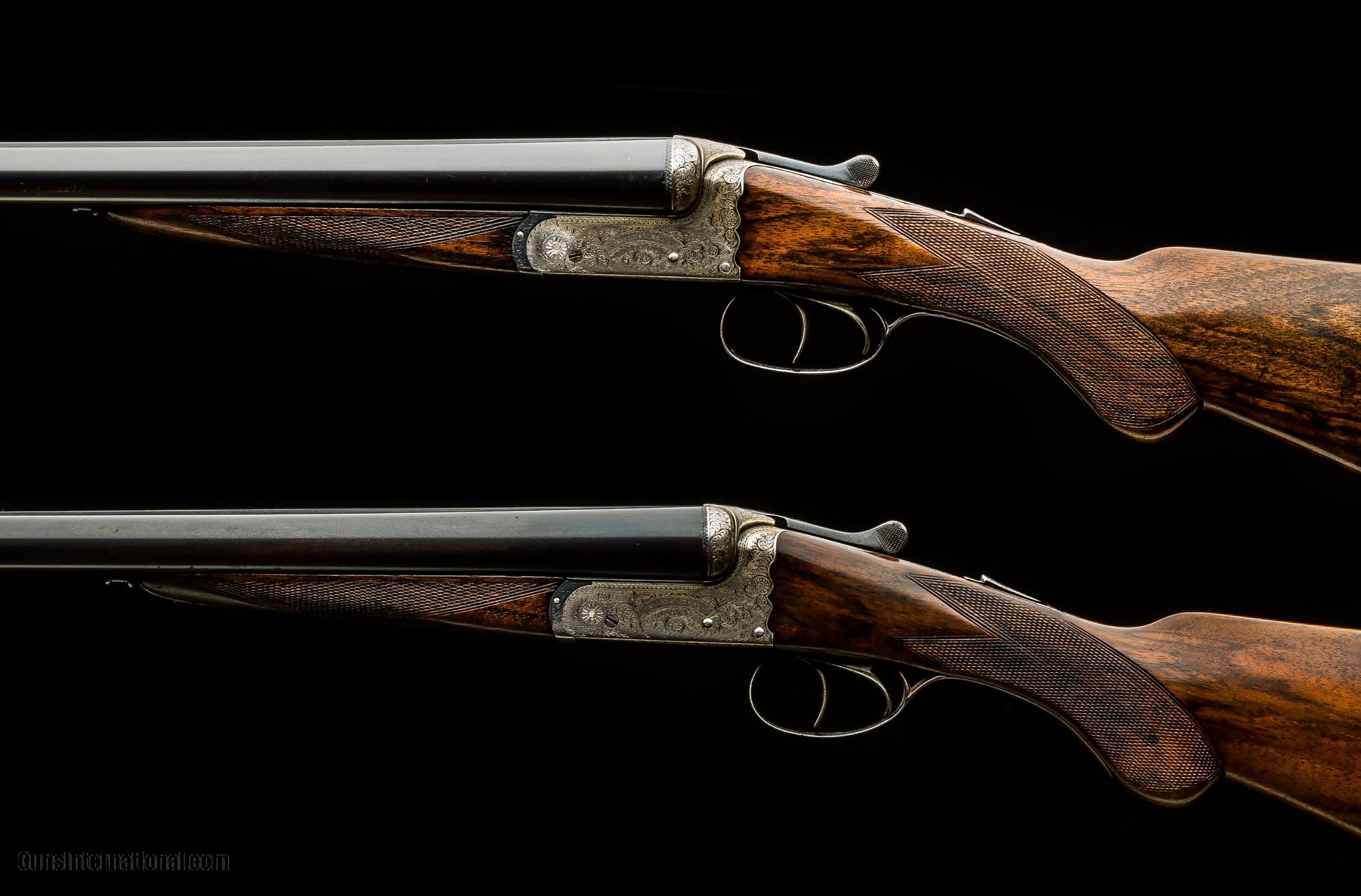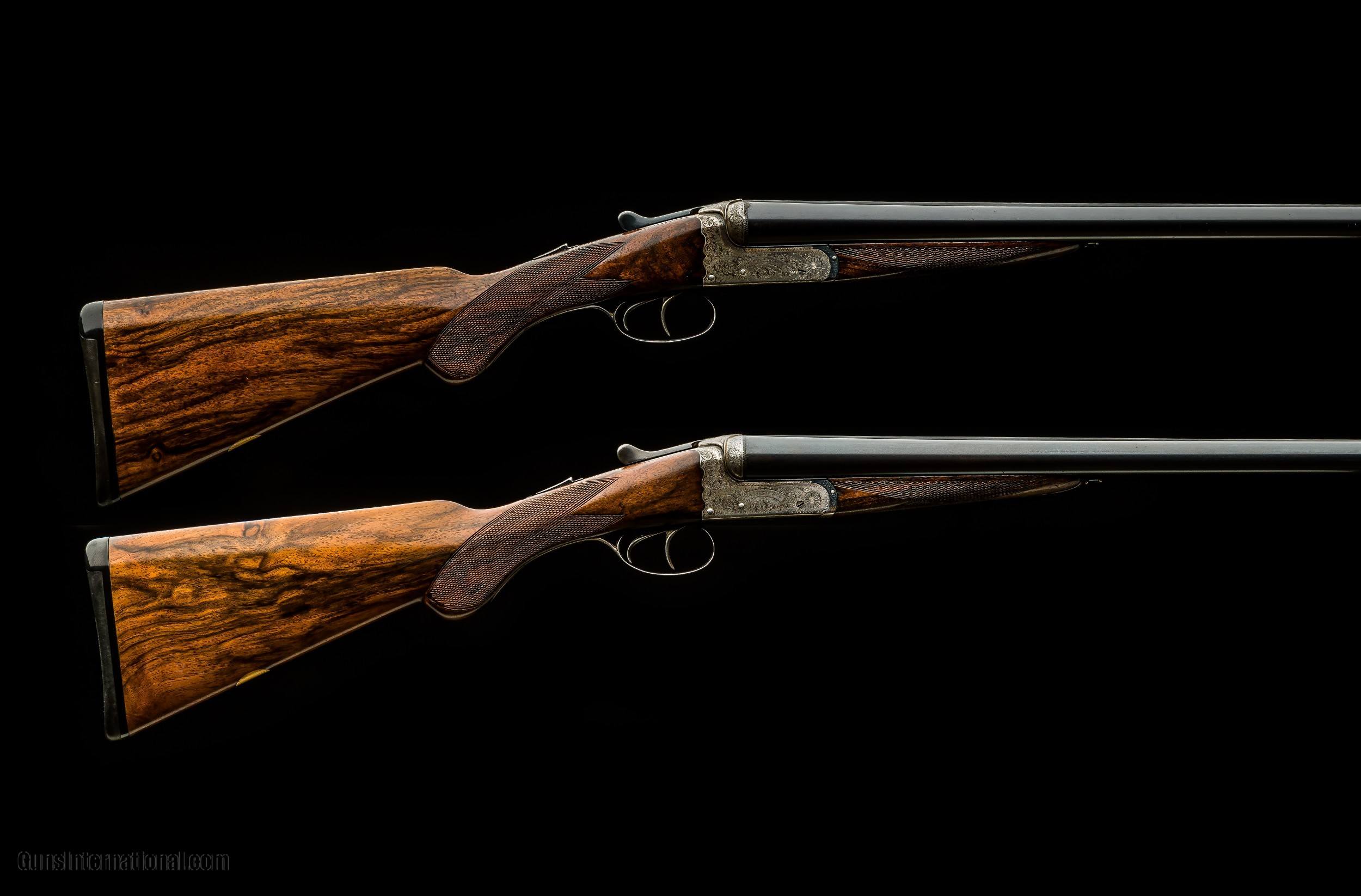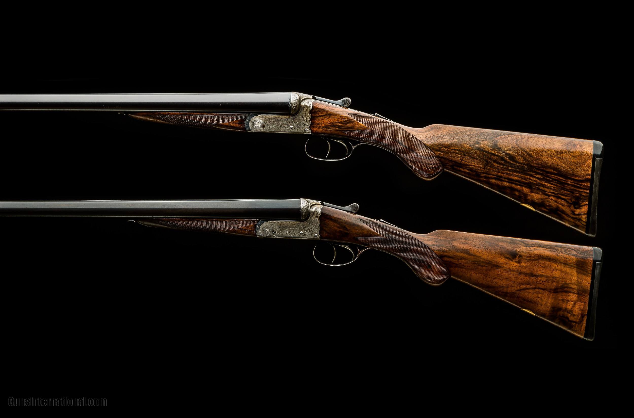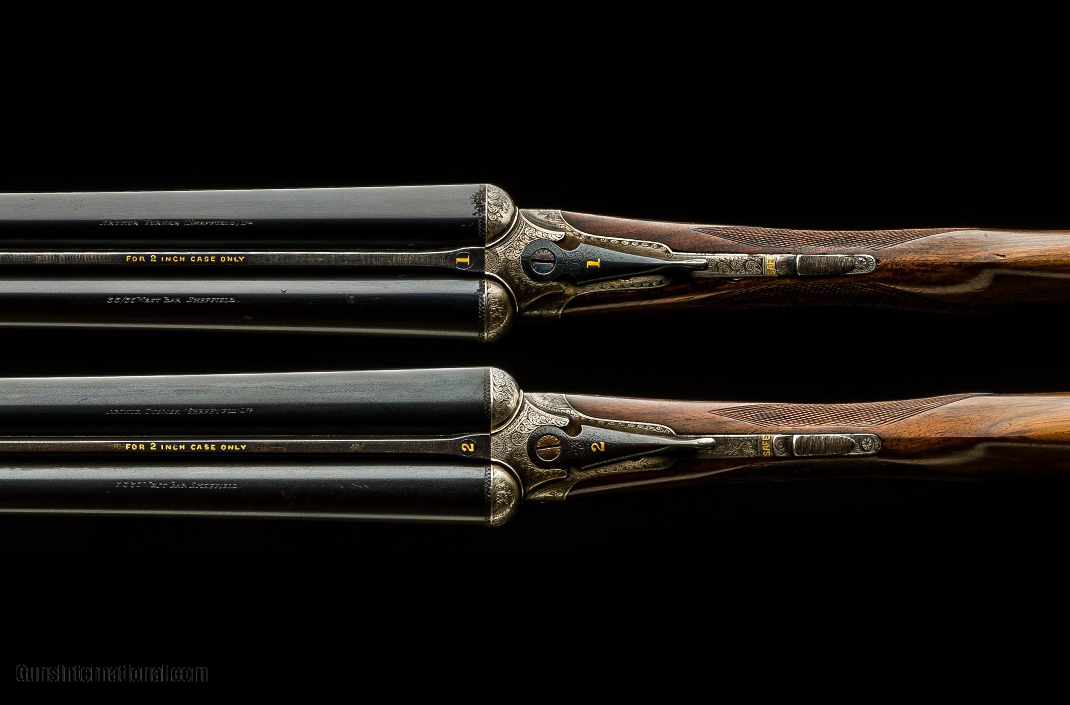 Description: A rare pair of 12g boxlock ejector, 2 Inch shotguns by Arthur Tuner of Sheffield. Built on a fixed lock, scroll back, ejector actions with two triggers and automatic game safeties. Tastefully engraved with a decorative scroll and the name in a banner, with some very slight traces of colour still present. They are narrow actions with a slim file up. Replacement 26" barrels by the maker which have 1982 London proof marks have 2" chambers, a raised engine turned top rib engraved in gold 'FOR 2 INCH CASE ONLY'. No. 1 gun is choked 1/2 in the right and Full in the left, the No. 2 gun is choked improved cylinder in the right and 3/8" in the left, with some external pitting at the muzzle end. The semi pistol stocks measure 13 5/8" to the centre of the rubber recoil pads, gold ovals and splinter forends. The guns are gold numbered 1 & 2 in the normal places. Weighing 5lbs 4oz and cased in the makers motorcase, these are a neat pair of 'Boys Guns'. Location: UK Make: Arthur Turner Calibre/Gauge: 12g Action: Boxlock Triggers: 2 Ejectors: Yes Barrel Length: 26" Rib: Engine Turned Raised Rib Chamber: 2" Stock: Semi Pistol Grip LOP: 13 5/8" Weight: 5lbs 4oz Case: Motor Case These shotguns are located in our Birmingham, UK factory and would require importation through our Gulf Breeze, Florida agency, which we would handle. Costs of shipping vary but it would be around $1,000. There is 2.6% duty to be paid on the value of the shotguns. SOLD |