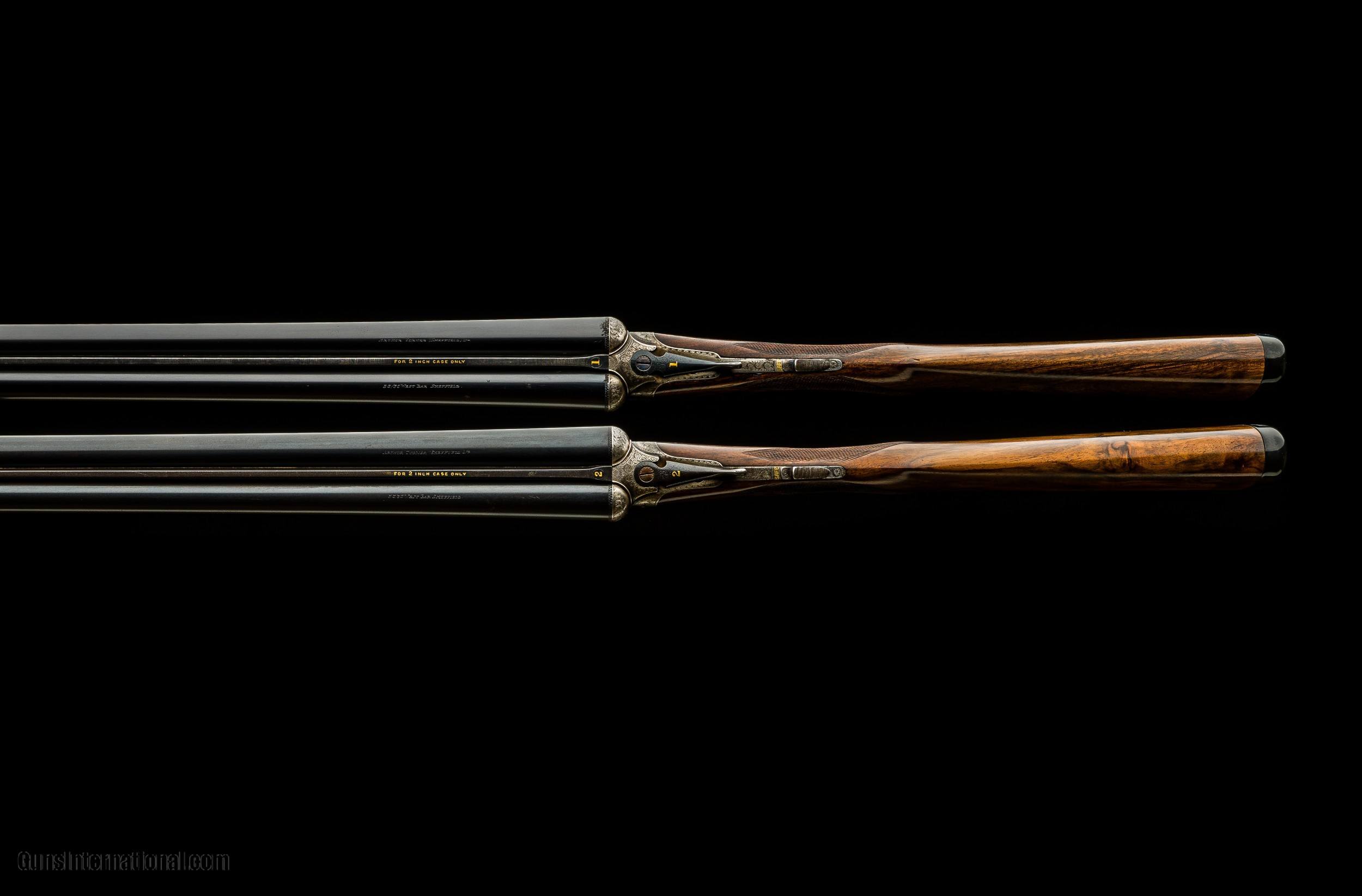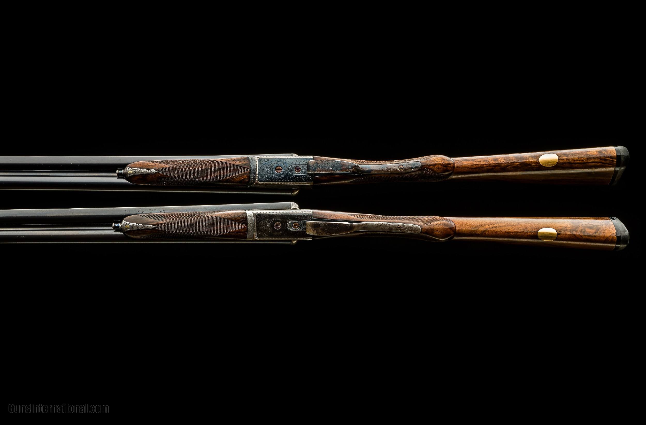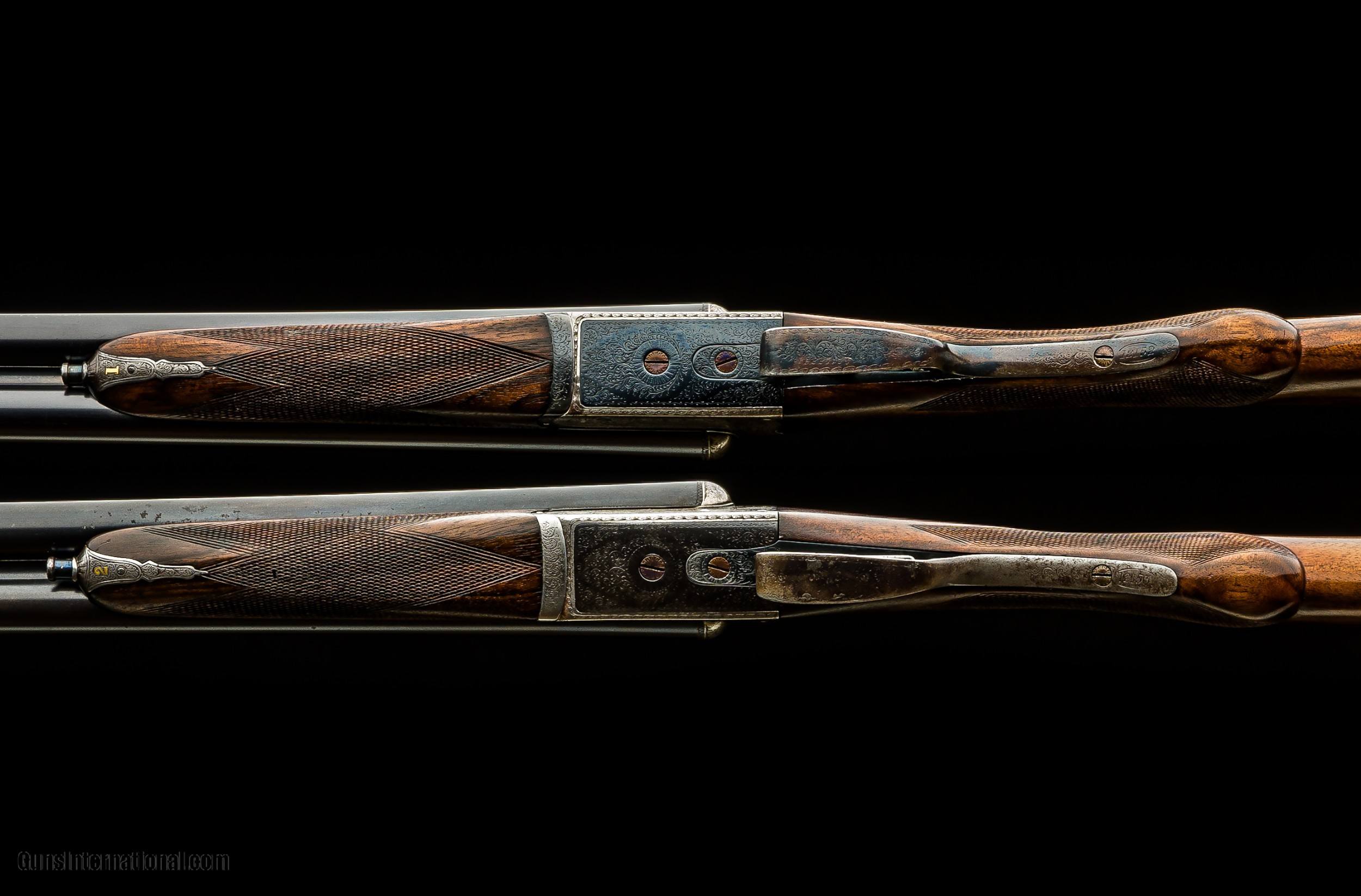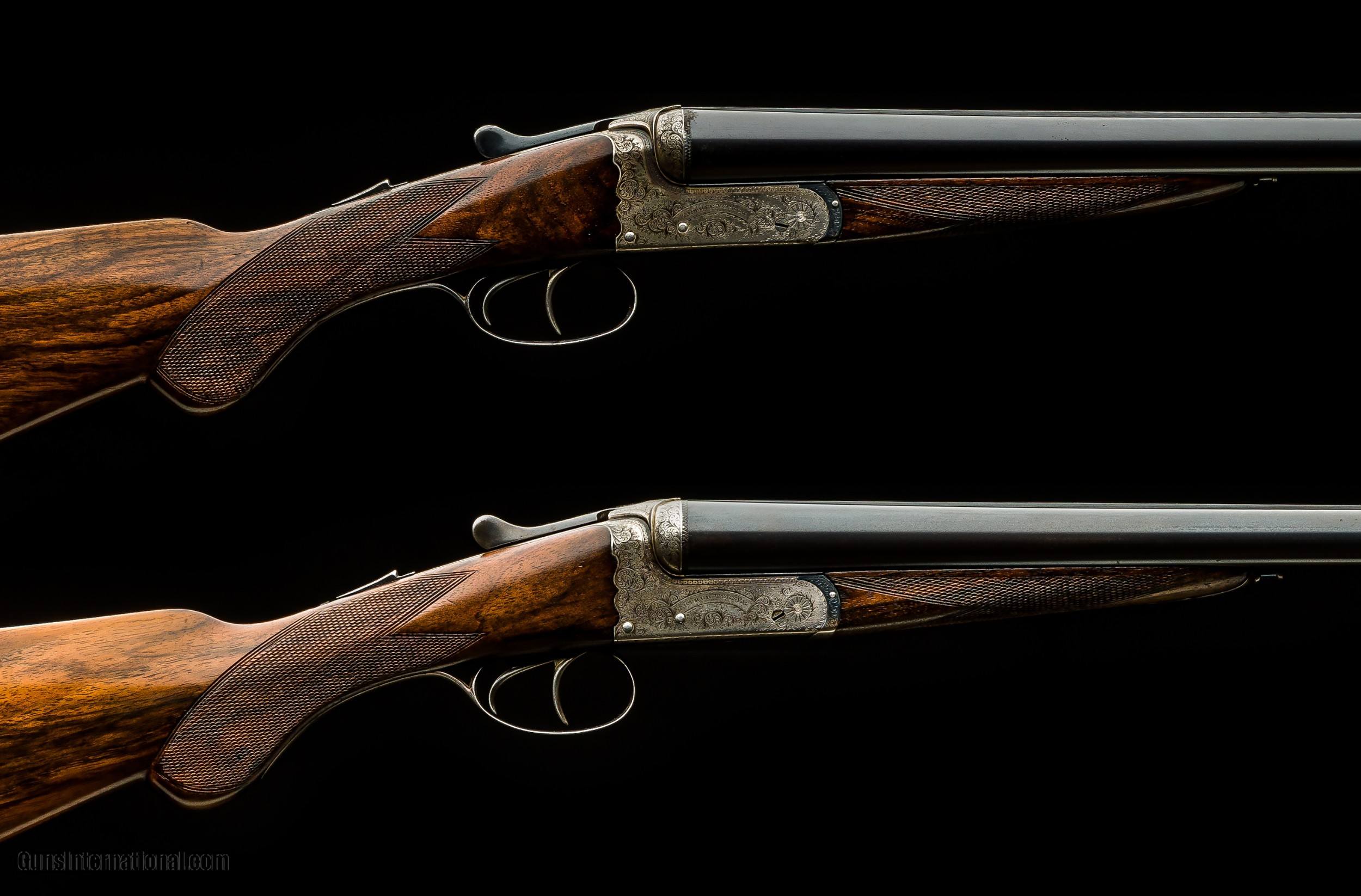 Description: A rare pair of 12g boxlock ejector, 2 Inch shotguns by Arthur Tuner of Sheffield. Built on a fixed lock, scroll back, ejector actions with two triggers and automatic game safeties. Tastefully engraved with a decorative scroll and the name in a banner, with some very slight traces of colour still present. They are narrow actions with a slim file up. Replacement 26" barrels by the maker which have 1982 London proof marks have 2" chambers, a raised engine turned top rib engraved in gold 'FOR 2 INCH CASE ONLY'. No. 1 gun is choked 1/2 in the right and Full in the left, the No. 2 gun is choked improved cylinder in the right and 3/8" in the left, with some external pitting at the muzzle end. The semi pistol stocks measure 13 5/8" to the centre of the rubber recoil pads, gold ovals and splinter forends. The guns are gold numbered 1 & 2 in the normal places. Weighing 5lbs 4oz and cased in the makers motorcase, these are a neat pair of 'Boys Guns'. Location: UK Make: Arthur Turner Calibre/Gauge: 12g Action: Boxlock Triggers: 2 Ejectors: Yes Barrel Length: 26" Rib: Engine Turned Raised Rib Chamber: 2" Stock: Semi Pistol Grip LOP: 13 5/8" Weight: 5lbs 4oz Case: Motor Case These shotguns are located in our Birmingham, UK factory and would require importation through our Gulf Breeze, Florida agency, which we would handle. Costs of shipping vary but it would be around $1,000. There is 2.6% duty to be paid on the value of the shotguns. SOLD |