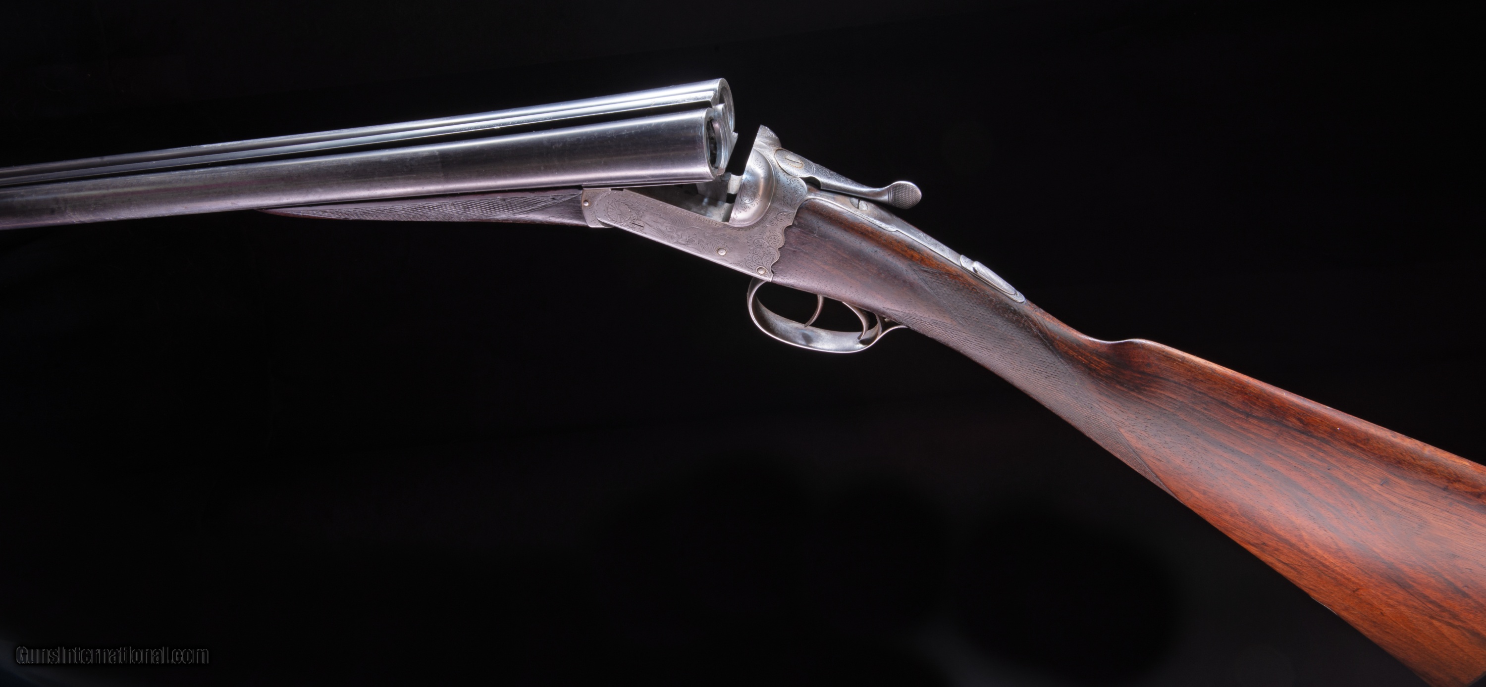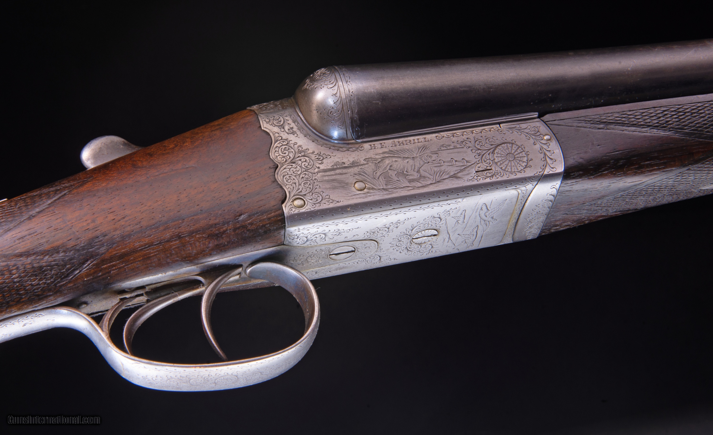 Description: Boxlocks - This is a very light, sound, well made little double while being ready to use as is it would benefit from a chip in the toe repaired, the wood cleaned up, and the checking perhaps picked up. The gun appears tight but I feel it is on the edge of needing a rejoin. We could arrange for this. I was planning to have rejoined and clean up the wood and sell this gun in the 2400 price range but I ran across the gun this morning and realized it has been sitting in the vault for over 6 months and I had not gotten to it so perhaps let someone else have it cheap and enjoy it as is or as a relatively easy restoration project. I really like the little game scenes and the scalloped action which we do not see often.