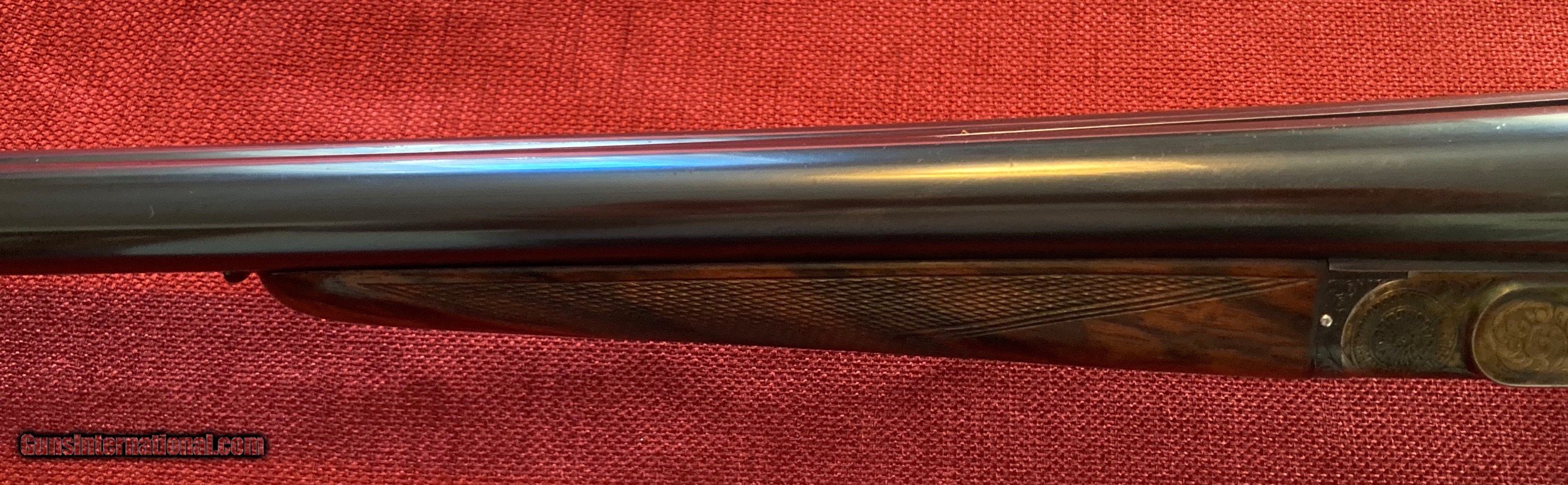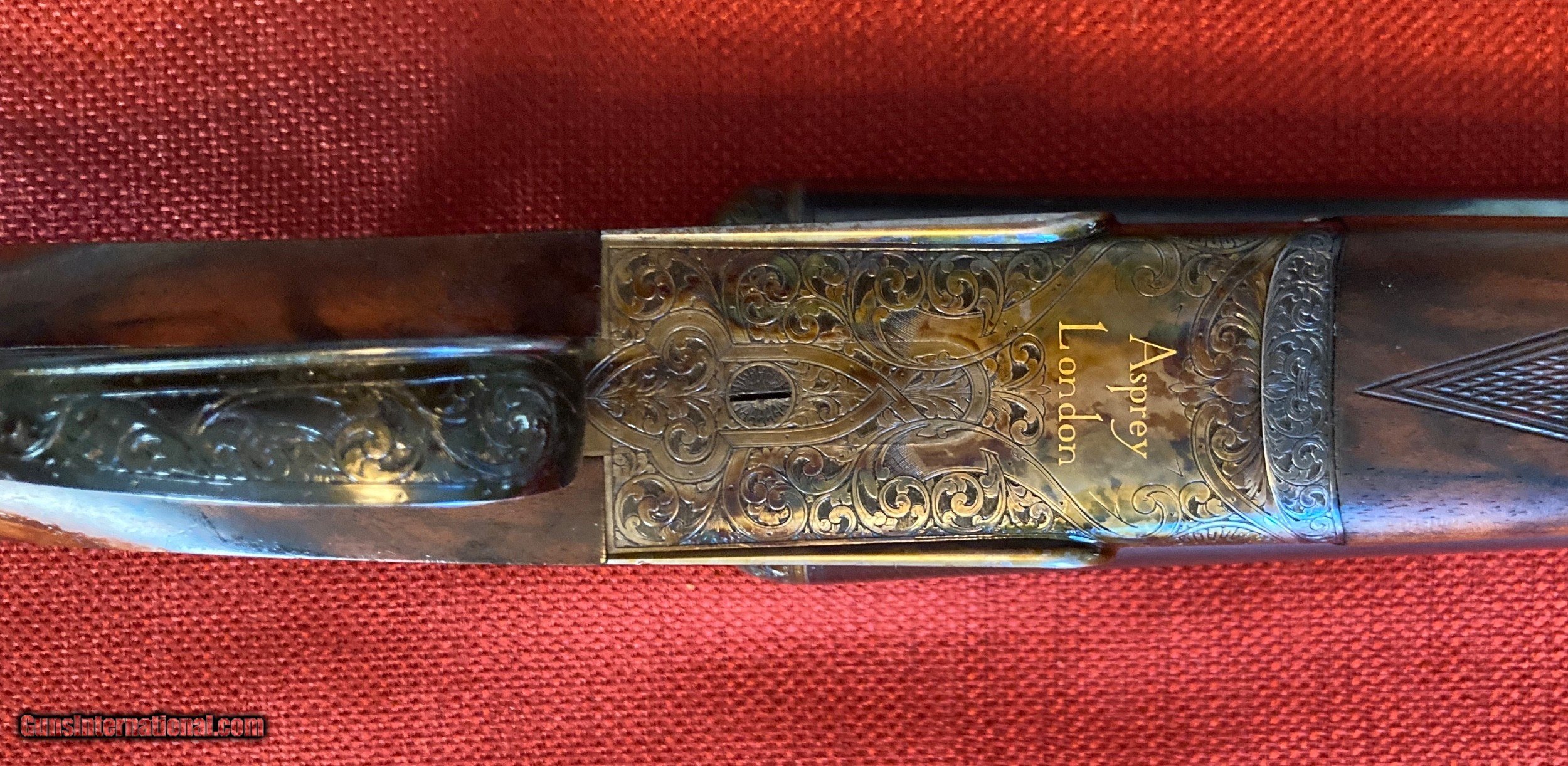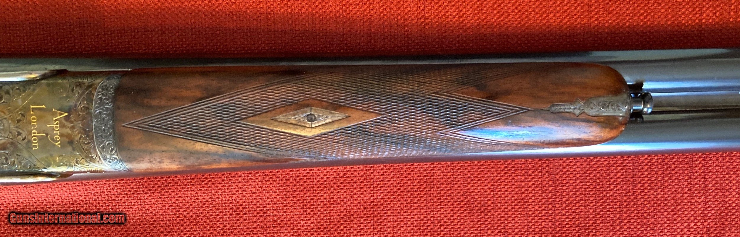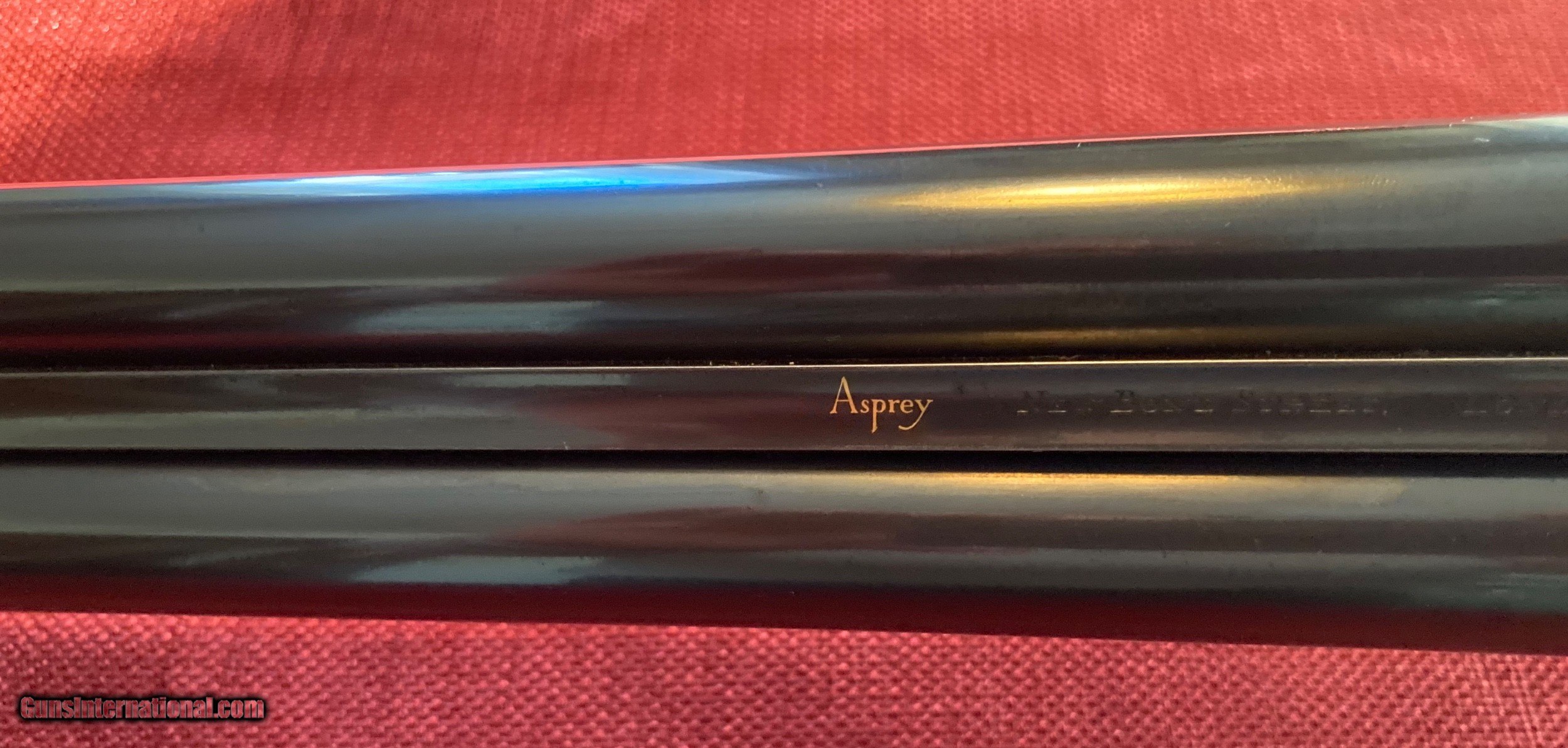 Description: Late 90s made Best Quality Side-by-Side by world renowned company, Asprey. Equipped with Holland & Holland style assisted opener. 100% coverage hand cut bold English engraving. "Asprey" in gold on top rib, "Aspey London" in gold on bottom panel. $55,000.00 "REDUCED" $42,500.00 SOLD Manufacturer: Asprey of London Model: Best Quality SLE Serial Number: 14xx Bore: Marked 18.4mm = .724" Measures Rt. .724", Lt. .725 Chambers: 2 3/4 Ejectors: Yes Metal Condition: Excellent Wood Condition: Excellent Bore Condition: Mirror Barrel Type: SxS Chopper Lump Action: Side Lock Triggers: Double Stock: Straight Hand, Splinter Stock Comb: 1 3/8 Stock Heel: 2 1/4 Stock Cast: OFF 5/16"comb, 1/2"heel & toe Fore End: Splinter Butt Pad: Checkered butt LOP: 14 3/4 Rib: Smooth concave Finish: Oil Weight: 6lbs 14.8oz Sights: Single Front Bead Manufacture Date: 1990s Choke Left: .018 Mod. Choke Right: .008" Imp. Cyl. Engraving: 100% coverage Bold Scroll & Gold Inlay Minimum Wall Thickness Left: .035 Minimum Wall Thickness Right: .040 |