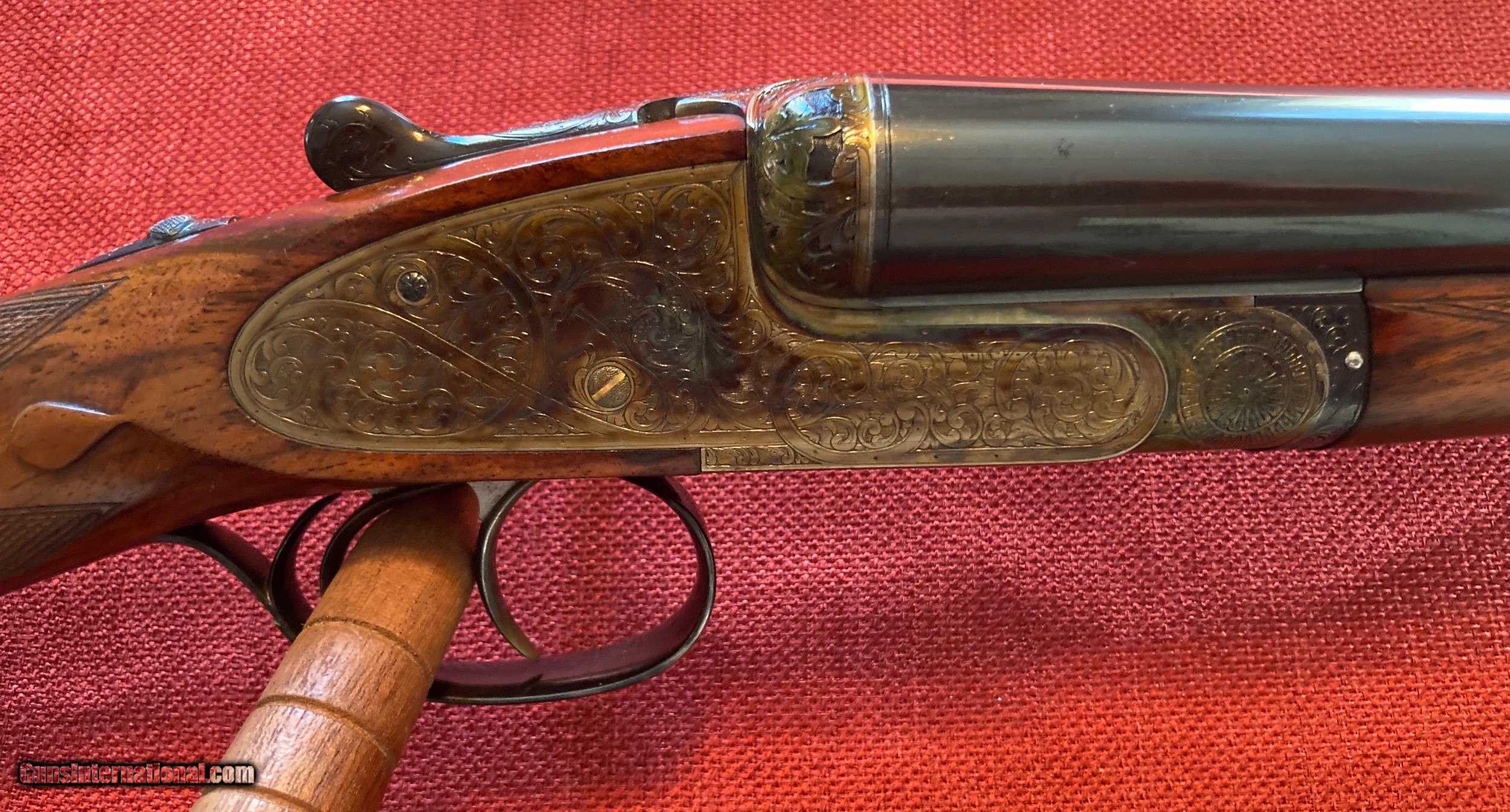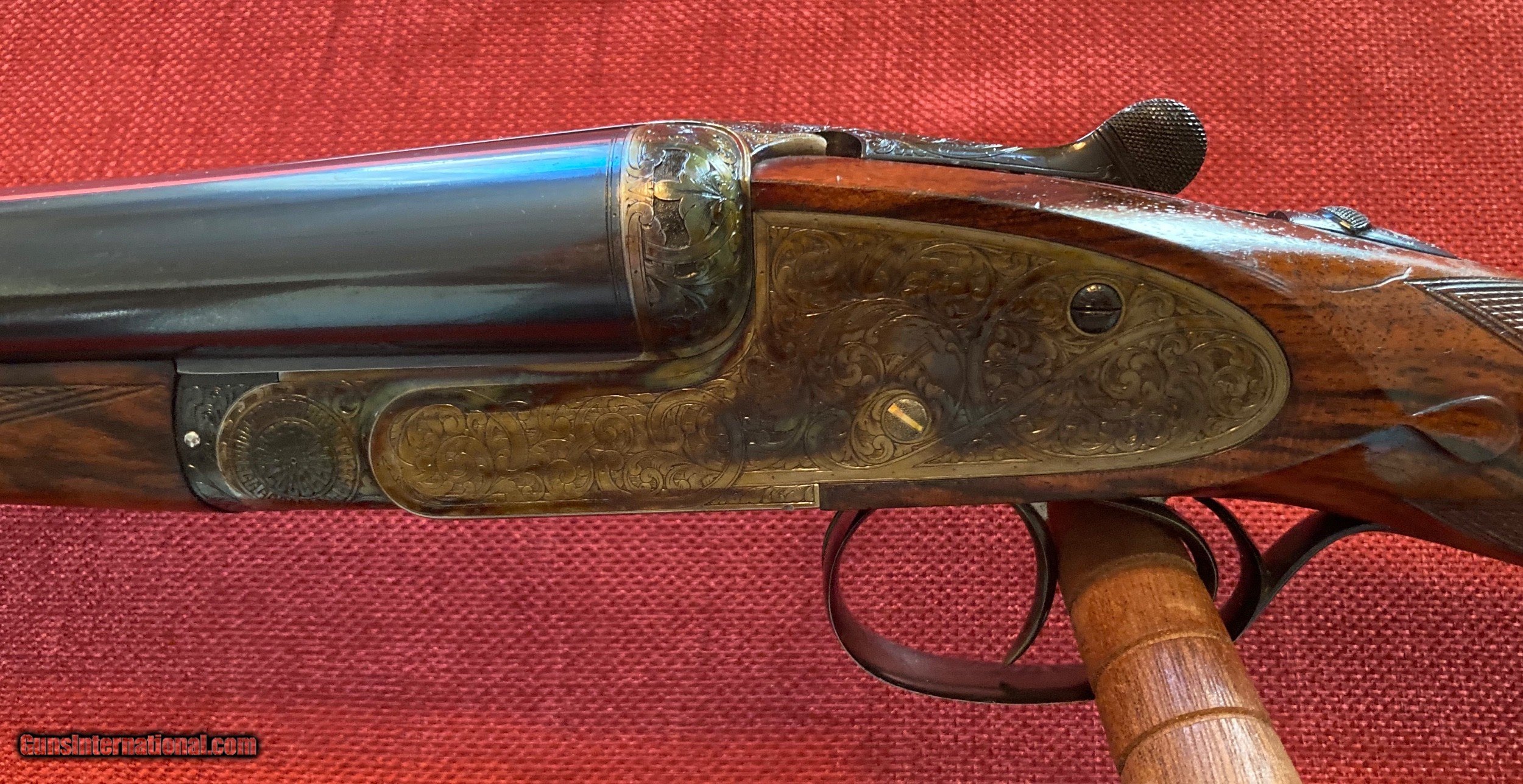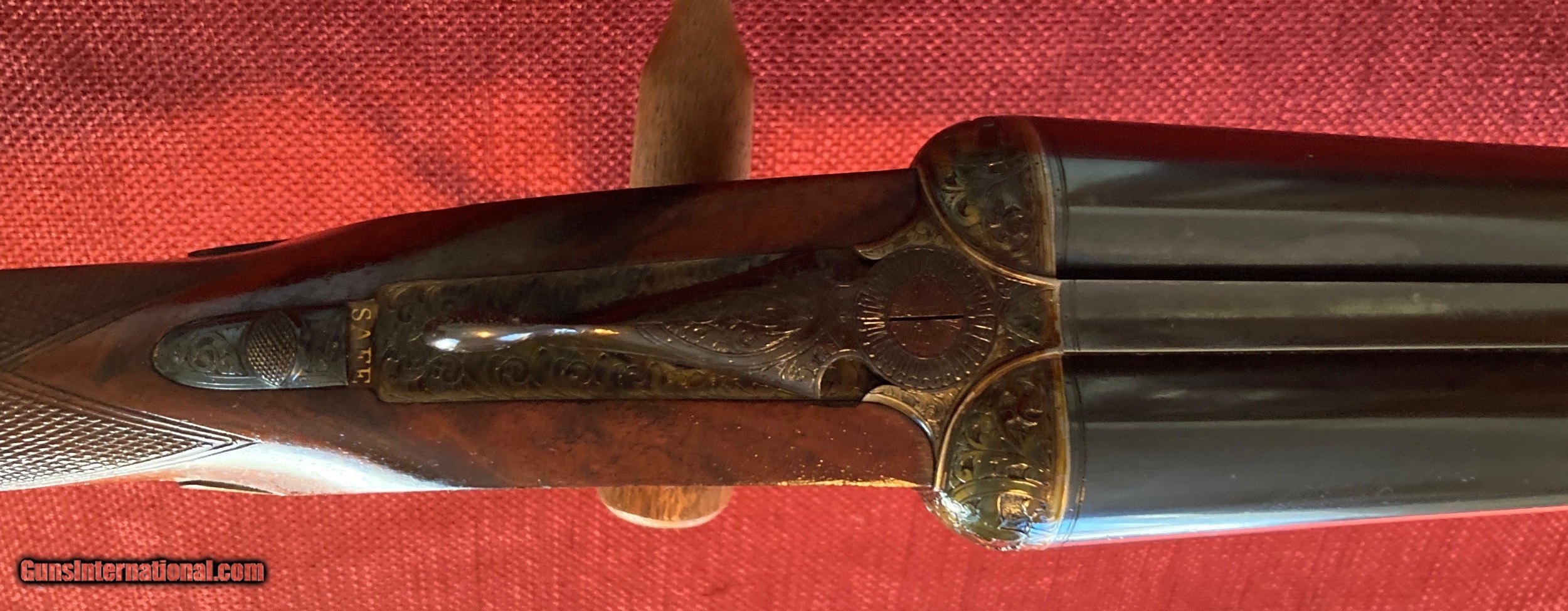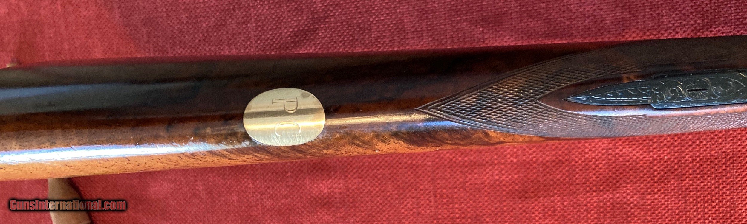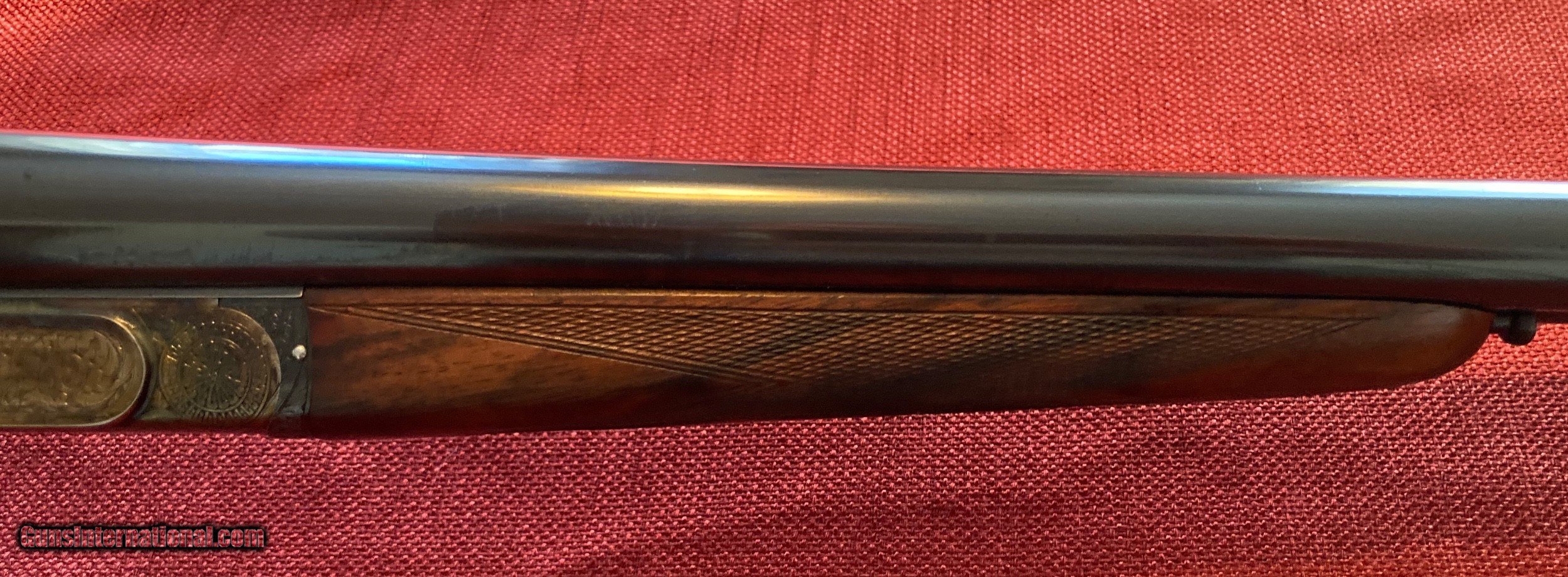 Description: Late 90s made Best Quality Side-by-Side by world renowned company, Asprey. Equipped with Holland & Holland style assisted opener. 100% coverage hand cut bold English engraving. "Asprey" in gold on top rib, "Aspey London" in gold on bottom panel. $55,000.00 "REDUCED" $42,500.00 SOLD Manufacturer: Asprey of London Model: Best Quality SLE Serial Number: 14xx Bore: Marked 18.4mm = .724" Measures Rt. .724", Lt. .725 Chambers: 2 3/4 Ejectors: Yes Metal Condition: Excellent Wood Condition: Excellent Bore Condition: Mirror Barrel Type: SxS Chopper Lump Action: Side Lock Triggers: Double Stock: Straight Hand, Splinter Stock Comb: 1 3/8 Stock Heel: 2 1/4 Stock Cast: OFF 5/16"comb, 1/2"heel & toe Fore End: Splinter Butt Pad: Checkered butt LOP: 14 3/4 Rib: Smooth concave Finish: Oil Weight: 6lbs 14.8oz Sights: Single Front Bead Manufacture Date: 1990s Choke Left: .018 Mod. Choke Right: .008" Imp. Cyl. Engraving: 100% coverage Bold Scroll & Gold Inlay Minimum Wall Thickness Left: .035 Minimum Wall Thickness Right: .040 |