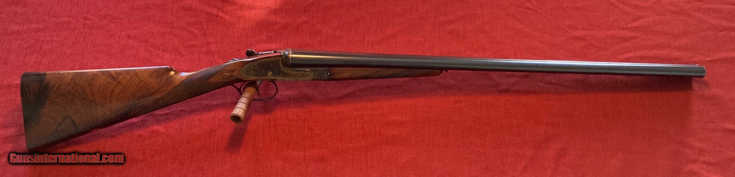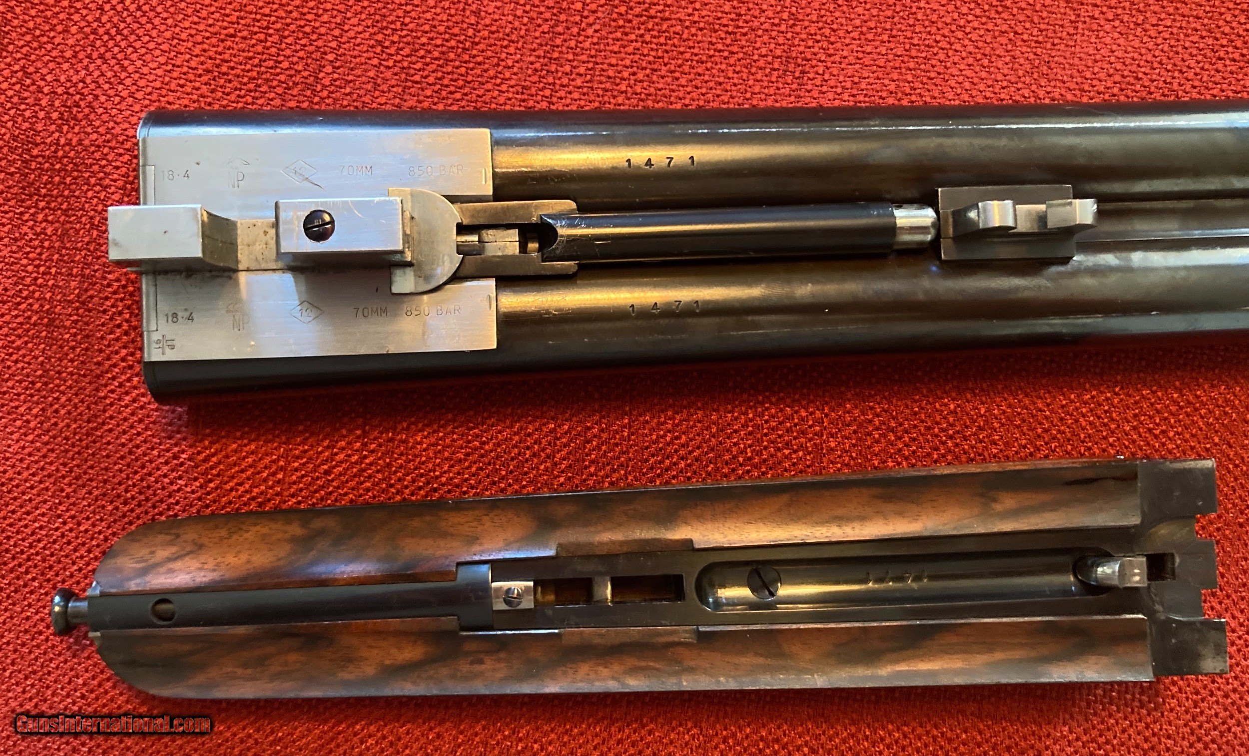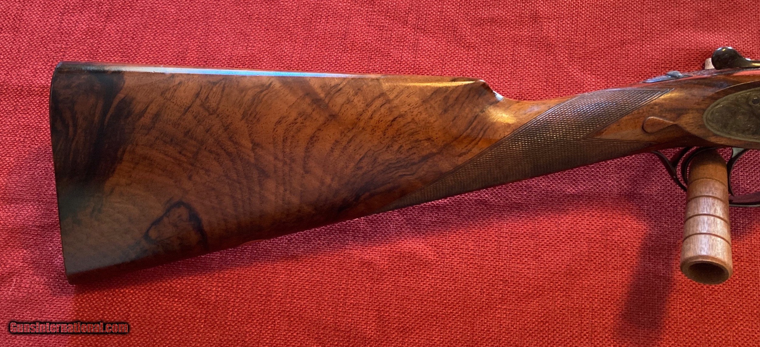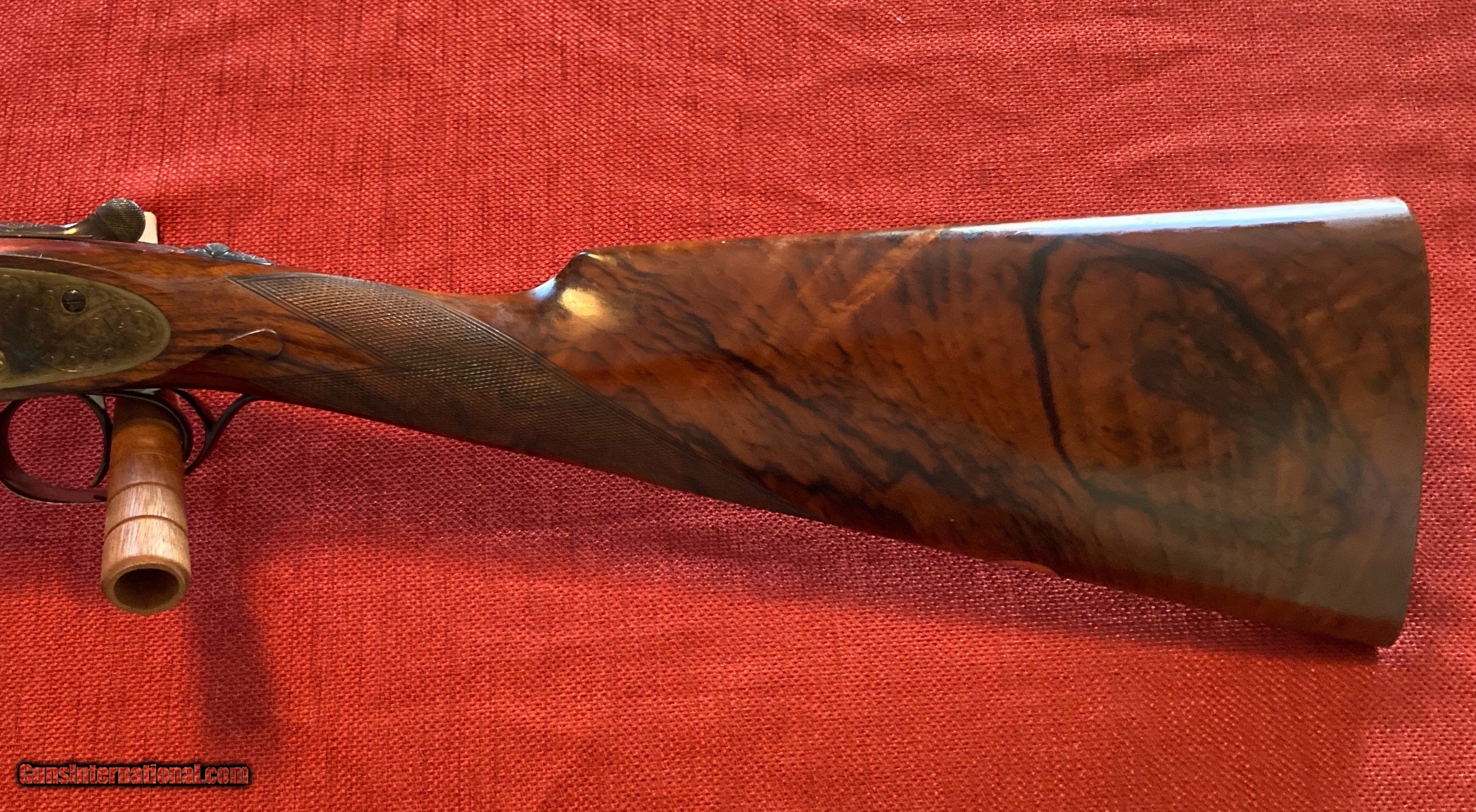 Description: Late 90s made Best Quality Side-by-Side by world renowned company, Asprey. Equipped with Holland & Holland style assisted opener. 100% coverage hand cut bold English engraving. "Asprey" in gold on top rib, "Aspey London" in gold on bottom panel. $55,000.00 "REDUCED" $42,500.00 SOLD Manufacturer: Asprey of London Model: Best Quality SLE Serial Number: 14xx Bore: Marked 18.4mm = .724" Measures Rt. .724", Lt. .725 Chambers: 2 3/4 Ejectors: Yes Metal Condition: Excellent Wood Condition: Excellent Bore Condition: Mirror Barrel Type: SxS Chopper Lump Action: Side Lock Triggers: Double Stock: Straight Hand, Splinter Stock Comb: 1 3/8 Stock Heel: 2 1/4 Stock Cast: OFF 5/16"comb, 1/2"heel & toe Fore End: Splinter Butt Pad: Checkered butt LOP: 14 3/4 Rib: Smooth concave Finish: Oil Weight: 6lbs 14.8oz Sights: Single Front Bead Manufacture Date: 1990s Choke Left: .018 Mod. Choke Right: .008" Imp. Cyl. Engraving: 100% coverage Bold Scroll & Gold Inlay Minimum Wall Thickness Left: .035 Minimum Wall Thickness Right: .040 |