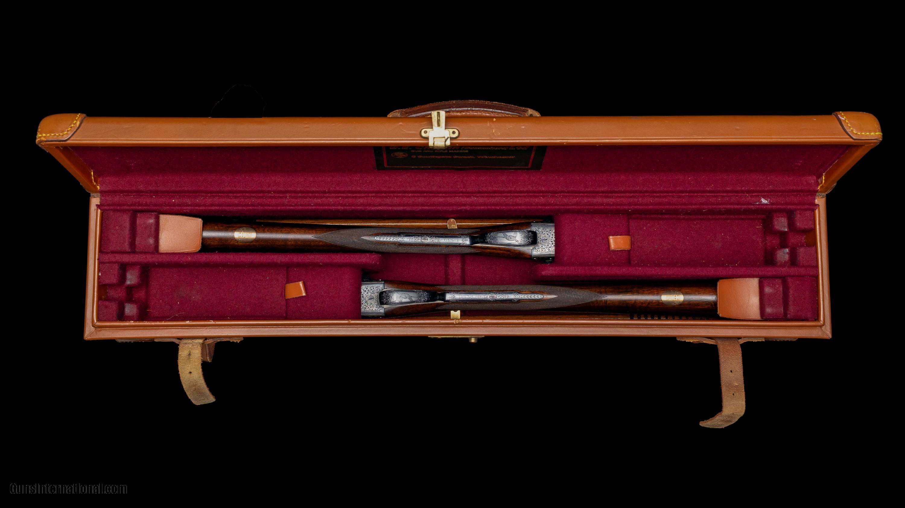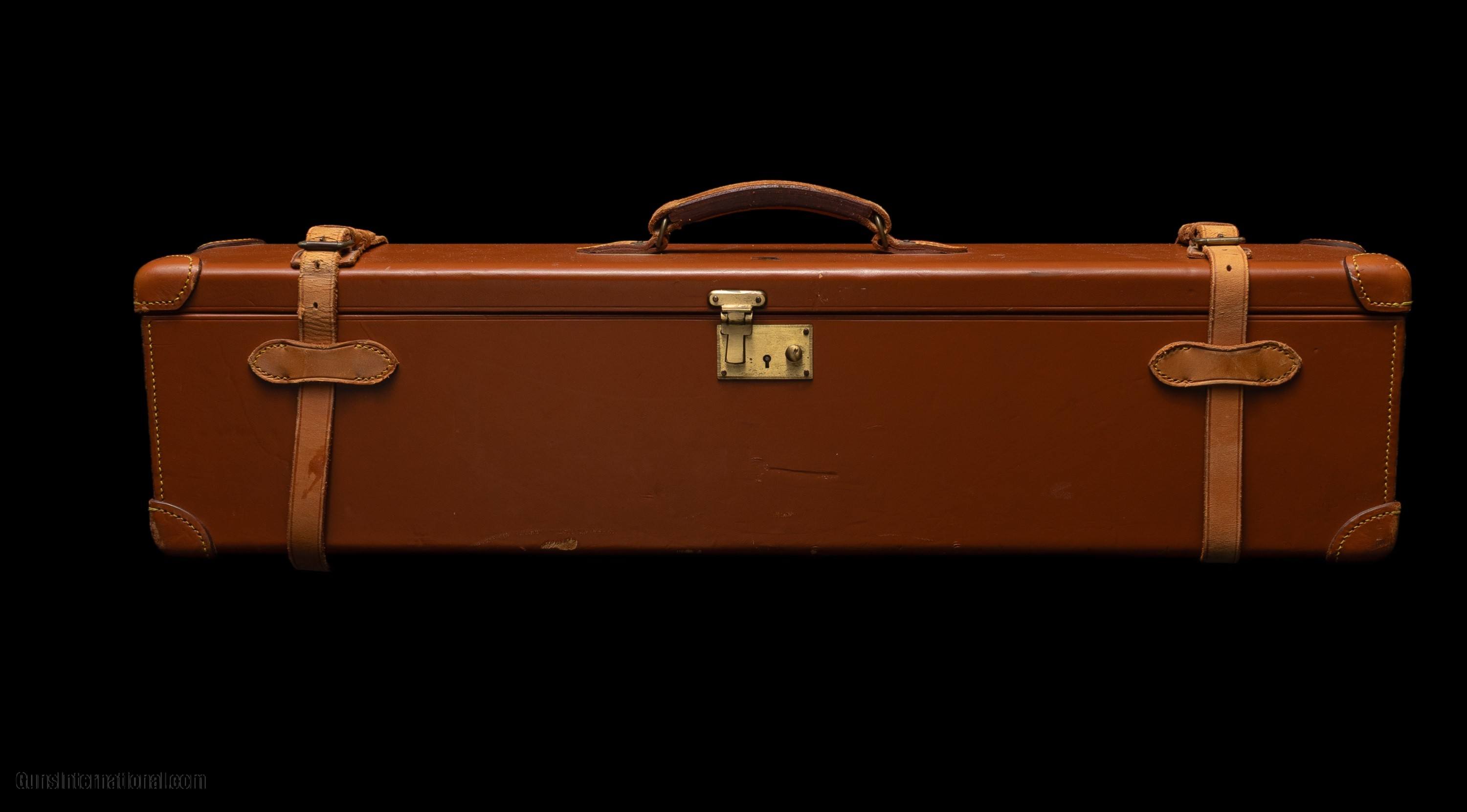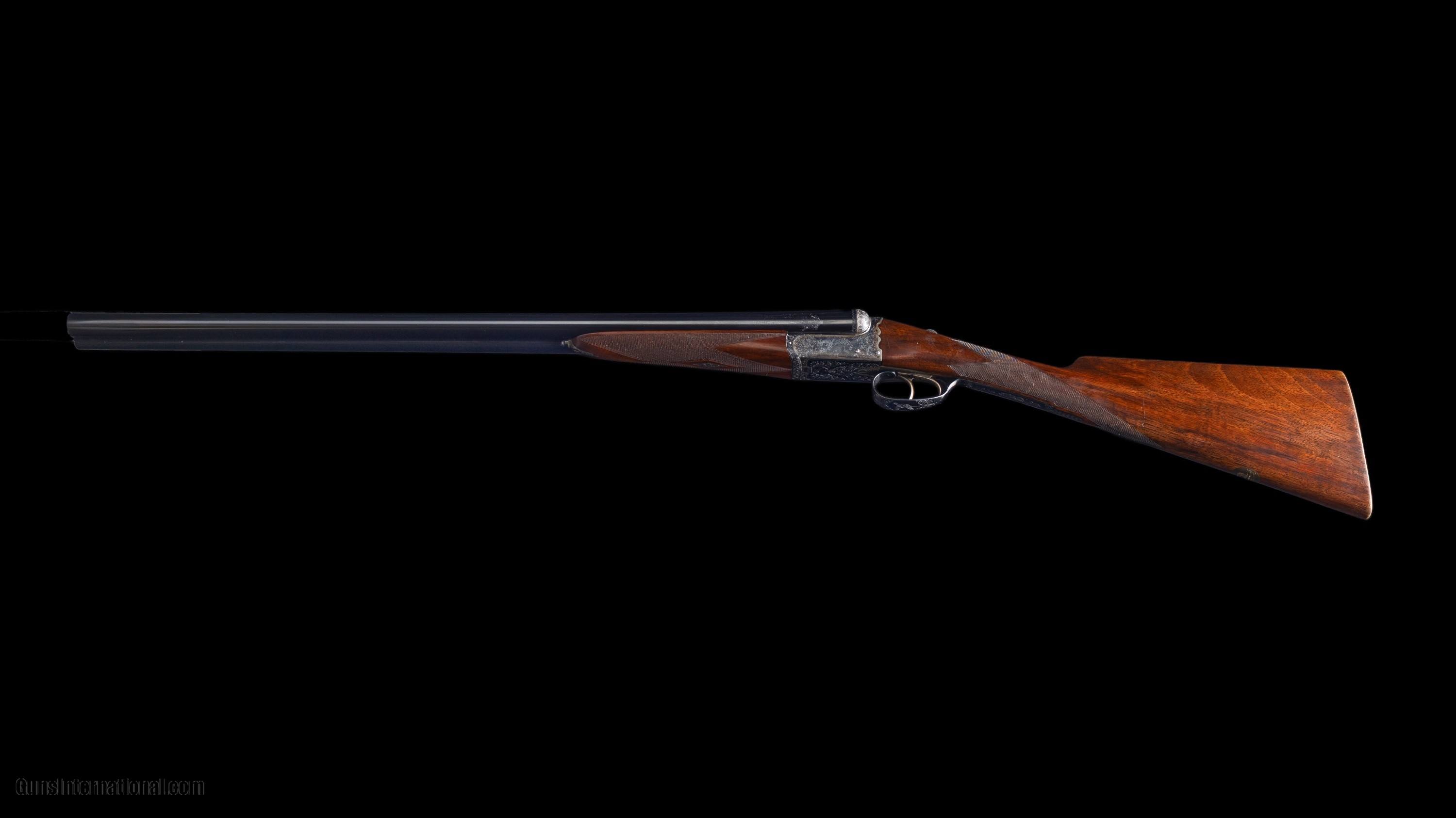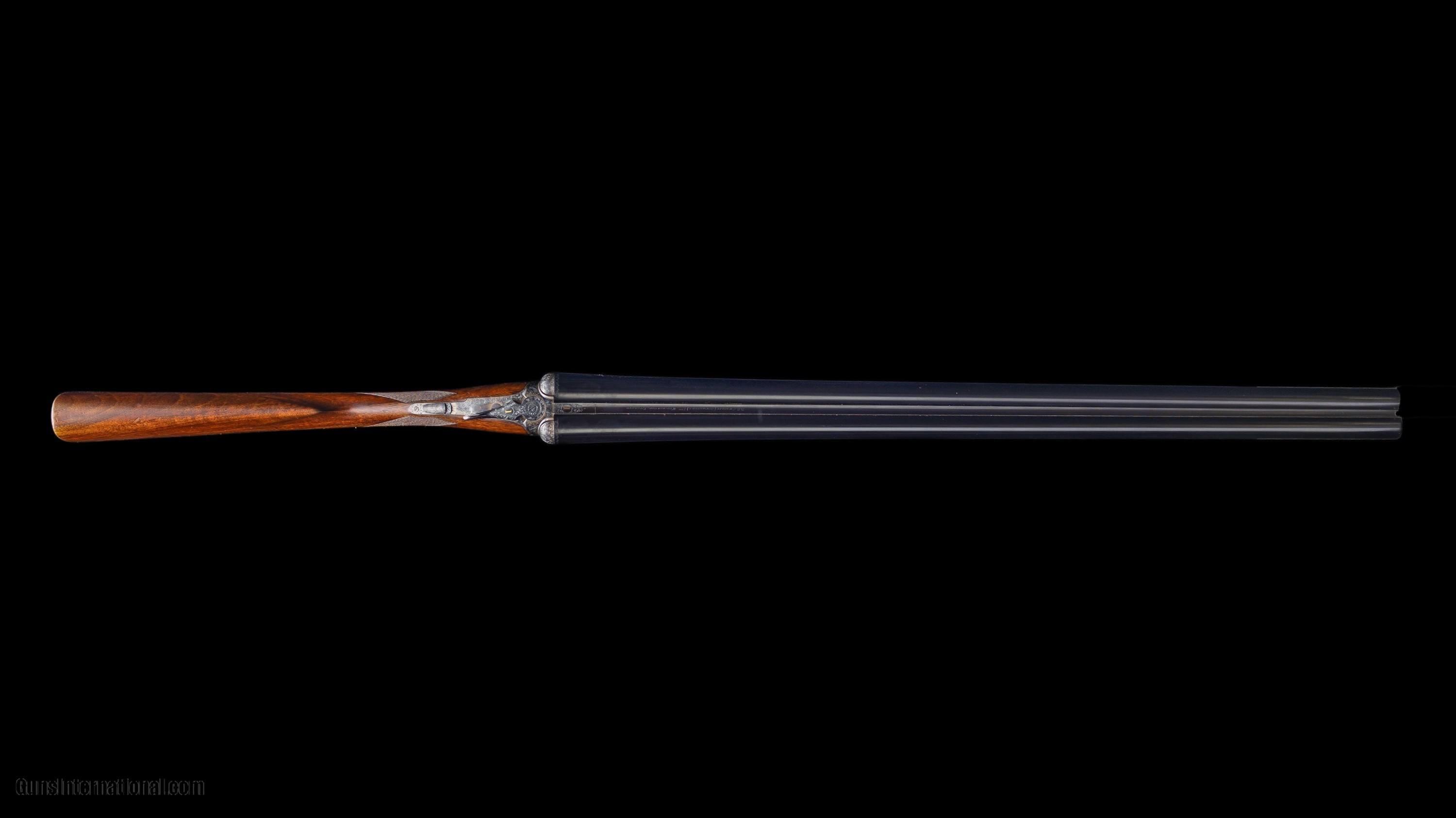 Description: Presented here is an outstanding matched pair of B.E. Chaplin boxlock ejector shotguns in 12 gauge, serial numbers 146301 and 146302, numbered “1” and “2” in gold on the ribs. This consecutive, cased pair is offered in excellent overall condition, complete with their original fitted leather motor case. Specifications (per gun) - Maker / Model: B.E. Chaplin — Boxlock Ejector (Matched Pair) - Gauge: 12 bore (12 ga) - Barrels: 27″, round, nitro-proved - Chambers: 2 3/4″ - Chokes: Fixed — Modified / Improved Modified - Rib: Solid concave smooth rib with single brass bead - Triggers: Double triggers, articulated front trigger (factory) - Stock: English straight grip, finely checkered walnut, oil finish - Length of Pull: 14 3/4″ (over front trigger) - Drops: Drop at comb 1 3/8″ · Drop at heel 2″ - Cast: 3/8″ cast off - Weight: 6 lbs 4 oz each - Serial Numbers: 146301 & 146302 — consecutive, matched, numbered “1” & “2” in gold - Engraving / Finish: Gorgeous fine English scroll engraving; actions retain vivid color case hardening - Accessories: Original fitted leather motor case included Condition Both guns present in excellent overall condition. The stocks are solid and finely figured, checkering remains sharp, and the actions are tight with positive lockup. The barrels and ribs show strong, even finish; bores are bright with no noted defects. The engraving is crisp, and the color case hardening remains vivid. Triggers are crisp, ejectors function properly, and overall mechanics are excellent. The original fitted leather motor case accompanies the pair, showing period-correct wear consistent with age and careful storage. Why this pair Matched pairs of English boxlocks with consecutive serials and original fitted cases are rare and highly desirable. The gold numbering “1” and “2,” fine scroll engraving, and color case-hardened actions elevate this pair well above ordinary field guns. At just 6 lbs 4 oz each, they balance and handle beautifully, making them equally suitable for the field or as part of a focused collection. Shotgun Gauge: 12 Gauge Manufacturer: B.E. Chaplin Model: BLE Serial Number: 146301 and 146302 Barrel Length: 27 Chambers: 2 3/4 Condition: Excellent Metal Condition: Excellent Wood Condition: Excellent Bore Condition: Excellent Barrels: SxS Triggers: Double Stock Comb: 1 3/8 Stock Heel: 2 Stock Cast: 3/8" OFF LOP: 14 3/4 Rib: Concave smooth Weight: 6.4 oz Chokes: Fixed Choke Left: Mod Choke Right: IM Case: Yes Item Location: Michigan Price: $19,999.00 Buy Now Contact Seller |